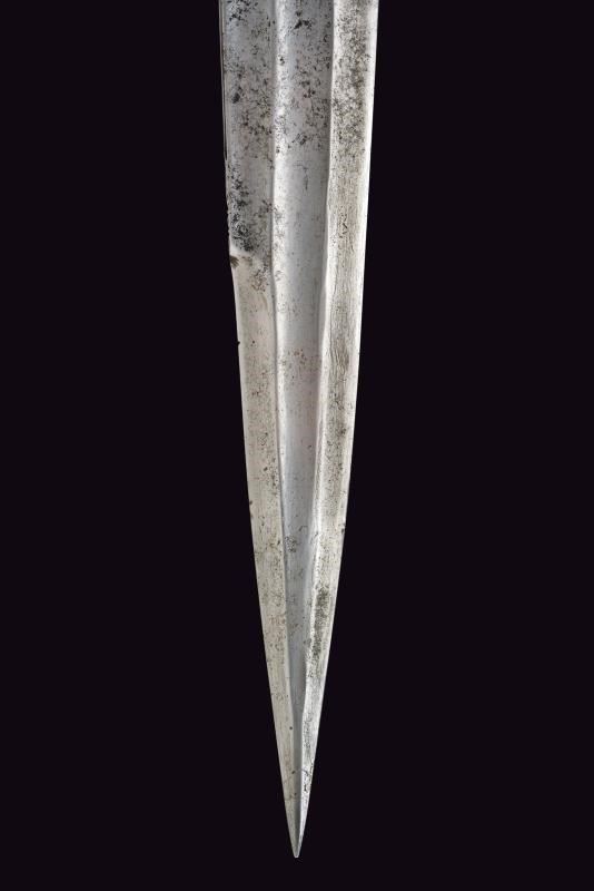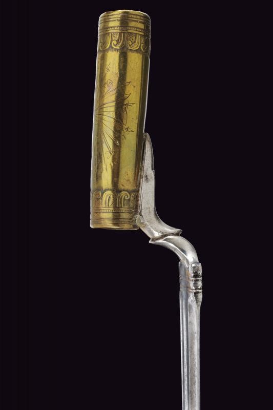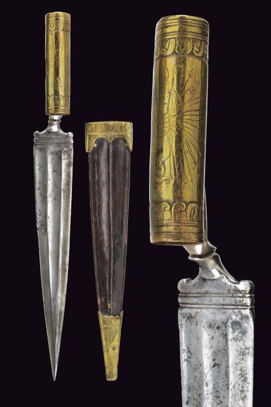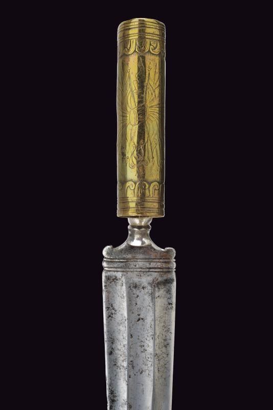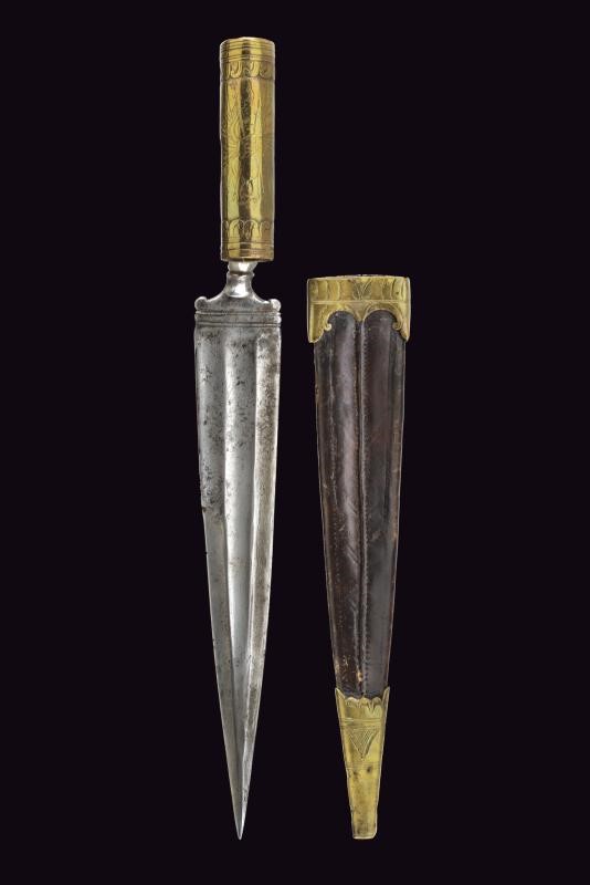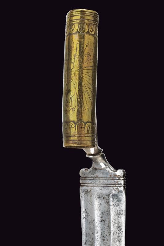 Larga lama di forma triangolare, a un filo e controfilo, con triplice fascia. Tallone decorato. Manicotto in ottone inciso con un trofeo e con bande decorative alle estremità. Fodero in cuoio con fornimenti in ottone inciso.