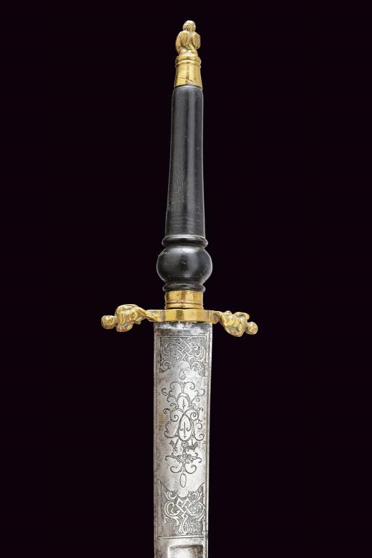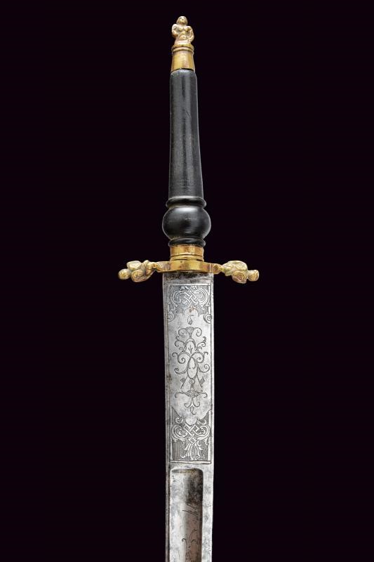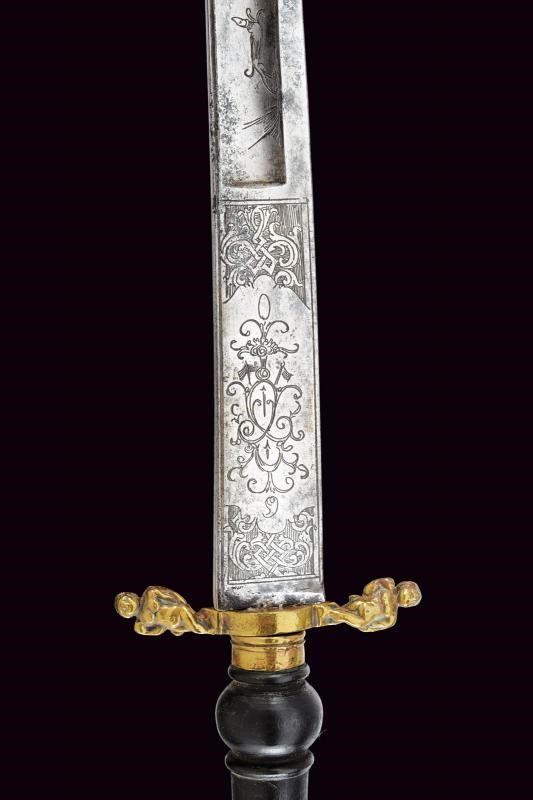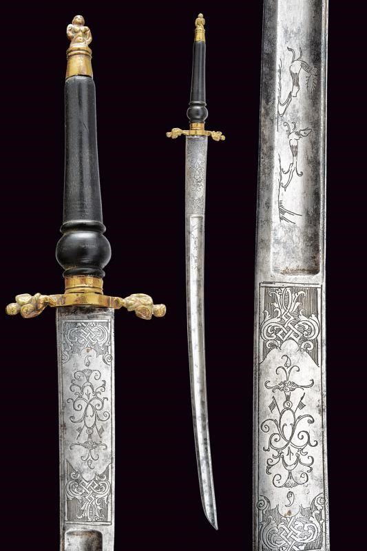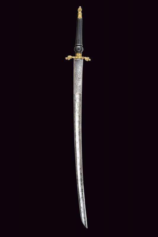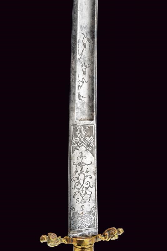 Lama leggermente curva a un filo e controfilo, con ampio sguscio centrale e sottile scanalatura sotto al dorso; la parte iniziale è incisa con scene di caccia, con decori floreali e geometrici. Fornimento in ottone con bracci e pomo ornati da putti. Impugnatura in legno di tipica foggia.