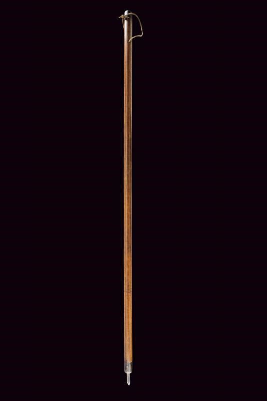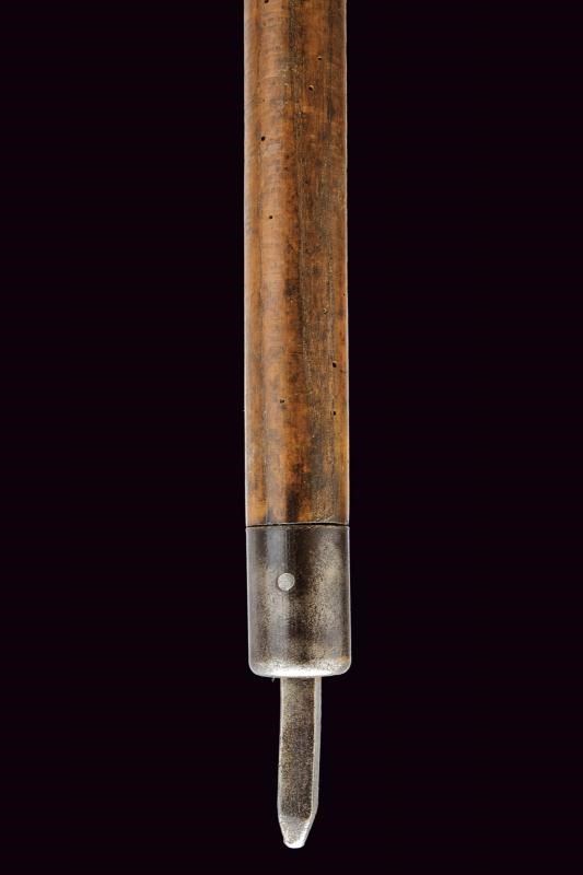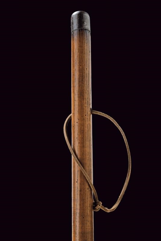 Fusto cilindrico in legno con correggia in cuoio, cappa e puntale in ferro. Cfr. "Lo sci nell'esercito italiano", p. 41.