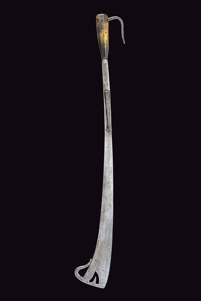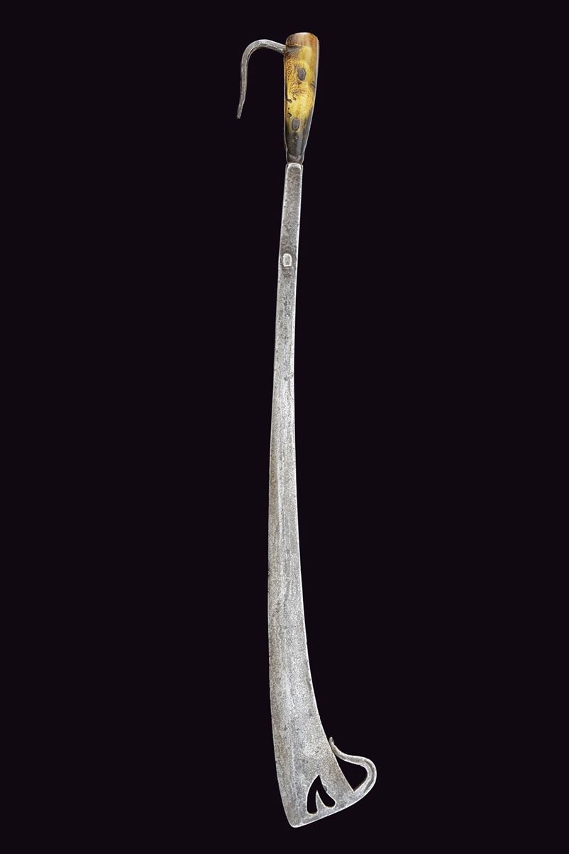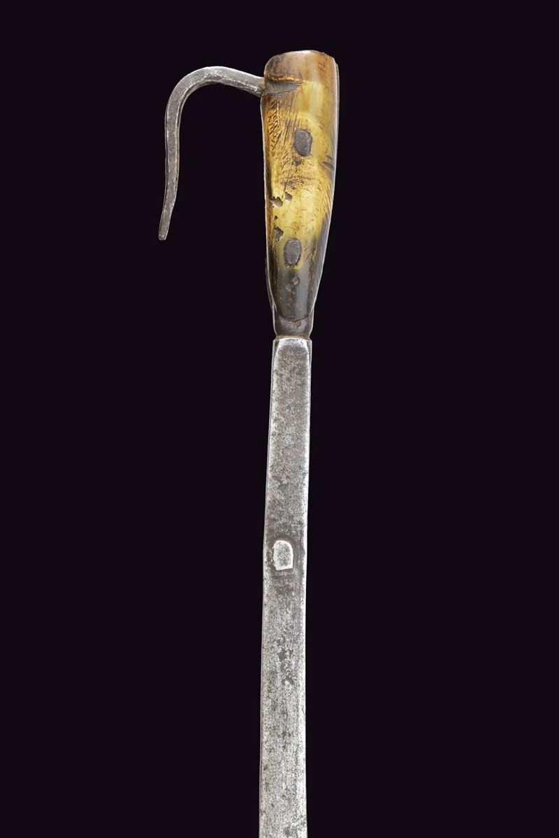 Lama leggermente curva, palmata al debole ove è munita di un traforo a cuore e di un arresto controcurvato poggiante al dorso della lama stessa. Il lato posteriore piano, munito al collo di un secondo lungo arresto intagliato a tacche, longitudinale alla lama. Impugnatura con guancette in corno di vacca probabilmente antico. E di gancio a raffio di presa. Non comune in questa qualità. Tipica delle milizie del Ducato di Savoia.