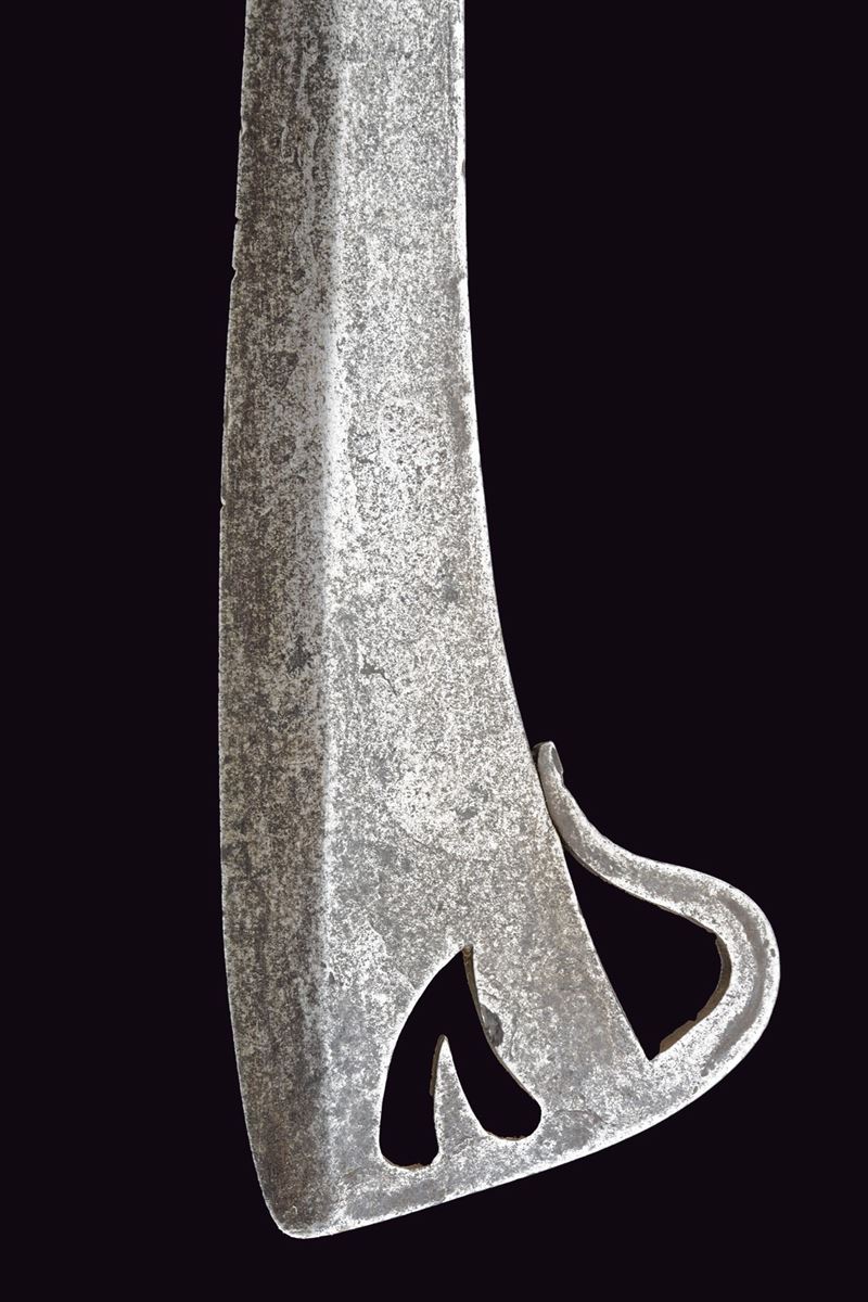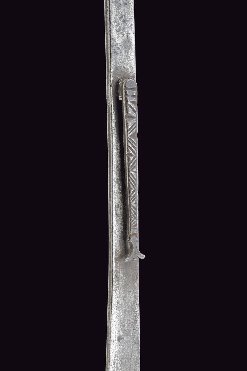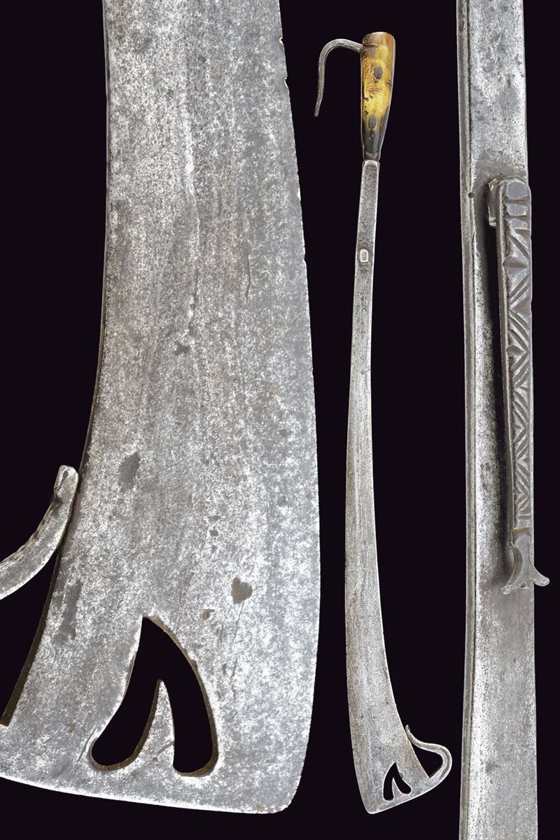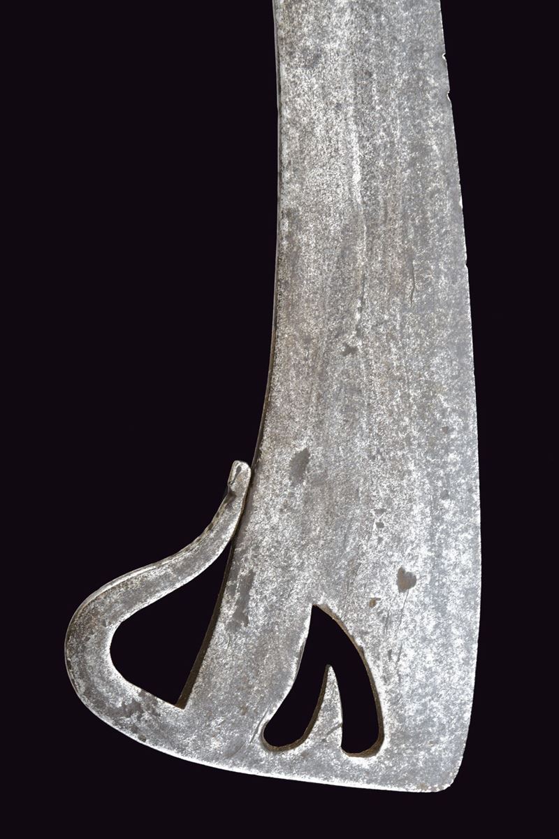 Lama leggermente curva, palmata al debole ove è munita di un traforo a cuore e di un arresto controcurvato poggiante al dorso della lama stessa. Il lato posteriore piano, munito al collo di un secondo lungo arresto intagliato a tacche, longitudinale alla lama. Impugnatura con guancette in corno di vacca probabilmente antico. E di gancio a raffio di presa. Non comune in questa qualità. Tipica delle milizie del Ducato di Savoia.