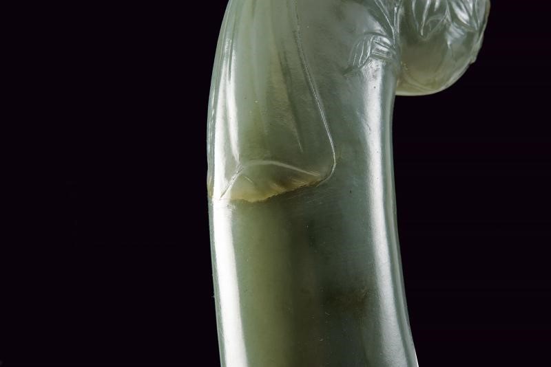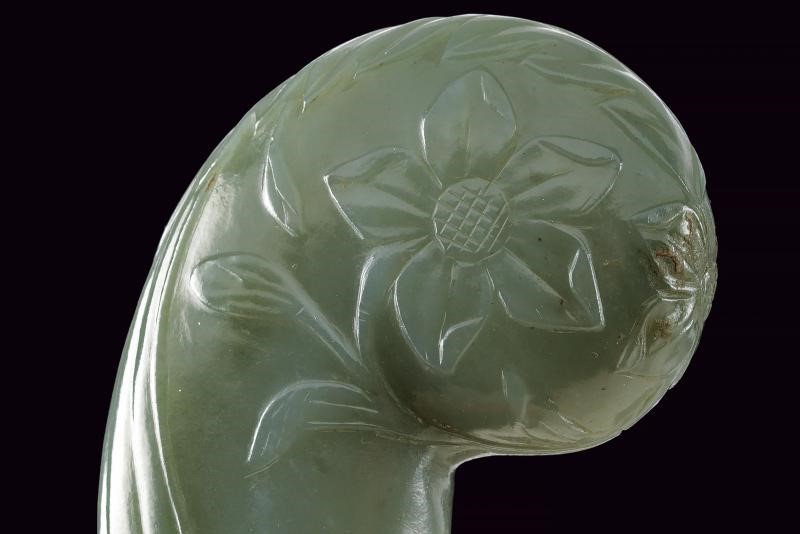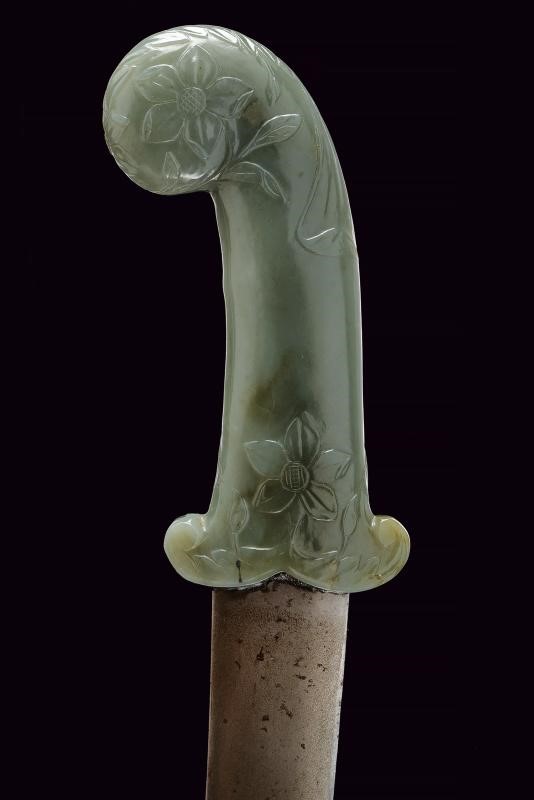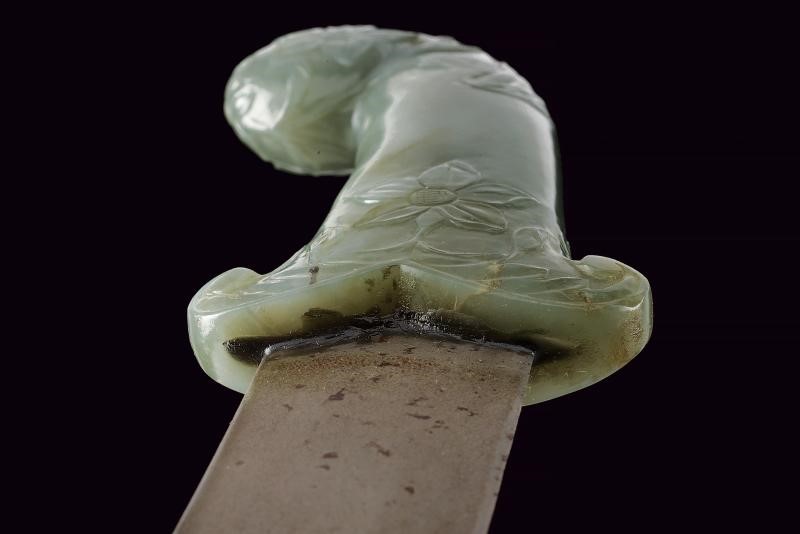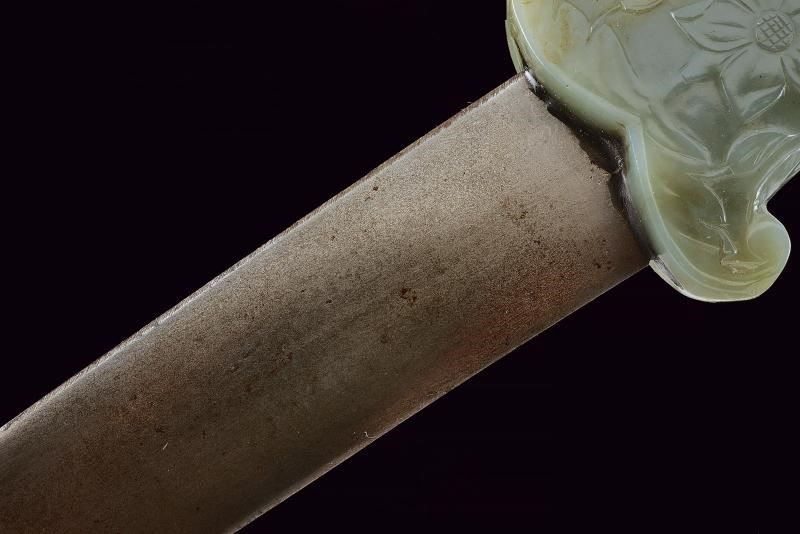 Lama curva a due fili, in damasco e strutturata a sezione lenticolare; zone con ruggine superficiale. Impugnatura in giada di forma tipica con pomo angolato, decorata con intagli a fiori in bassorilievo.