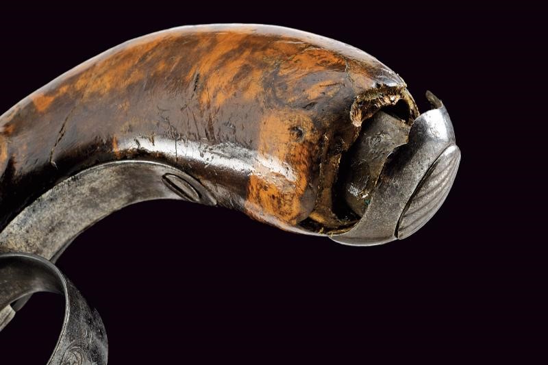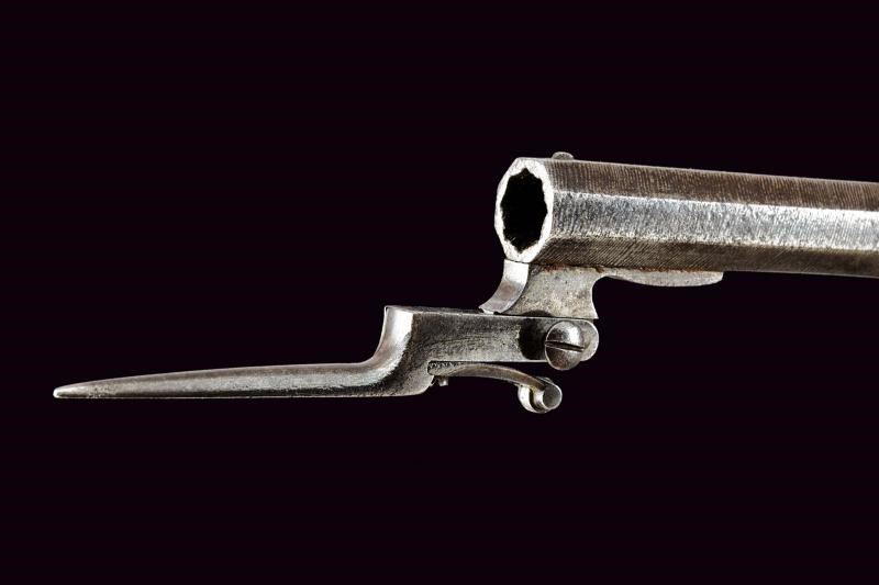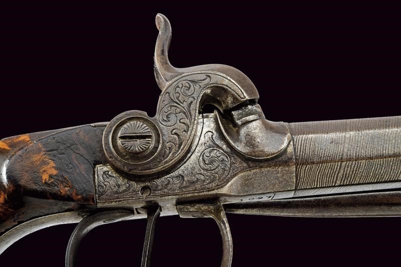 Canne lisce ottagonali con superfici lavorate a fingere il torcione, munite di mirino, cal. 11.5 mm. Castelli in ferro del tipo box-lock, incisi a motivi floreali. Cani incardinati sul fianco, con collo decorato en suite. Calci in radica (uno con rottura ed entrambi con fori di tarlo). Punzone del banco di prova di Liegi sui castelli. Al di sotto di entrambe le canne una piccola baionetta a scatto. Interessanti.