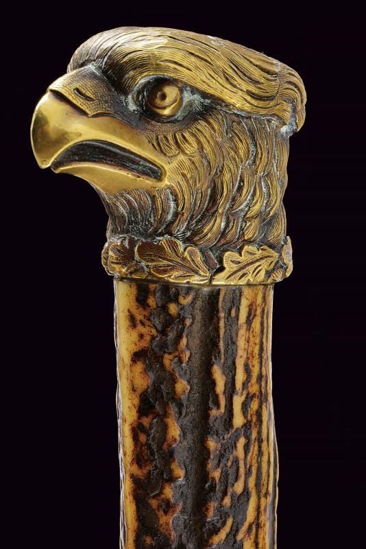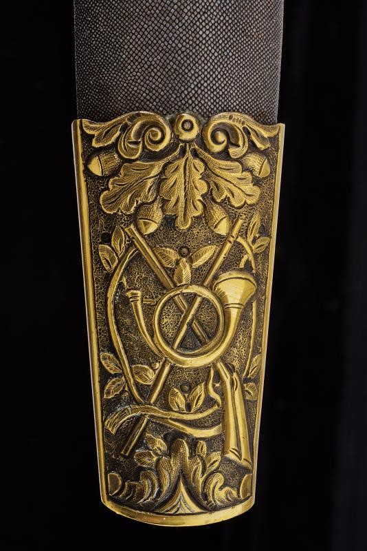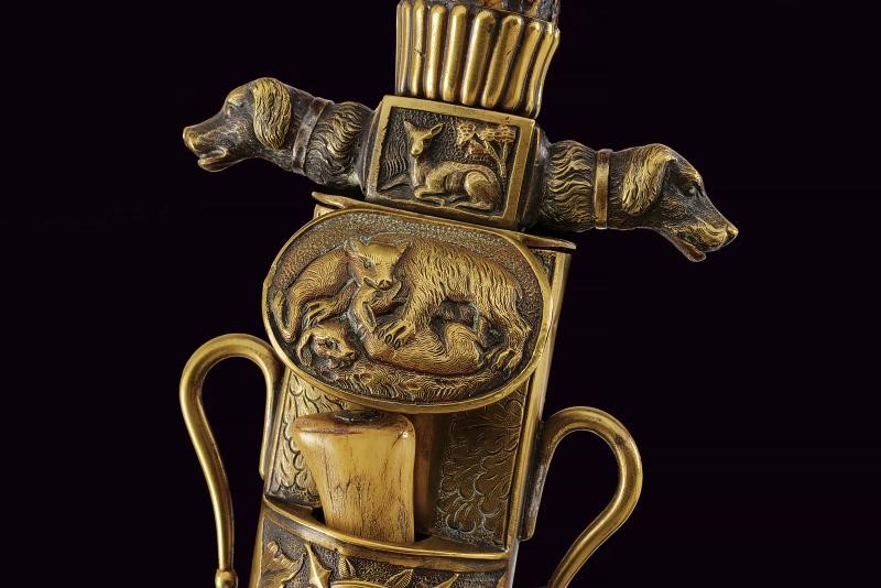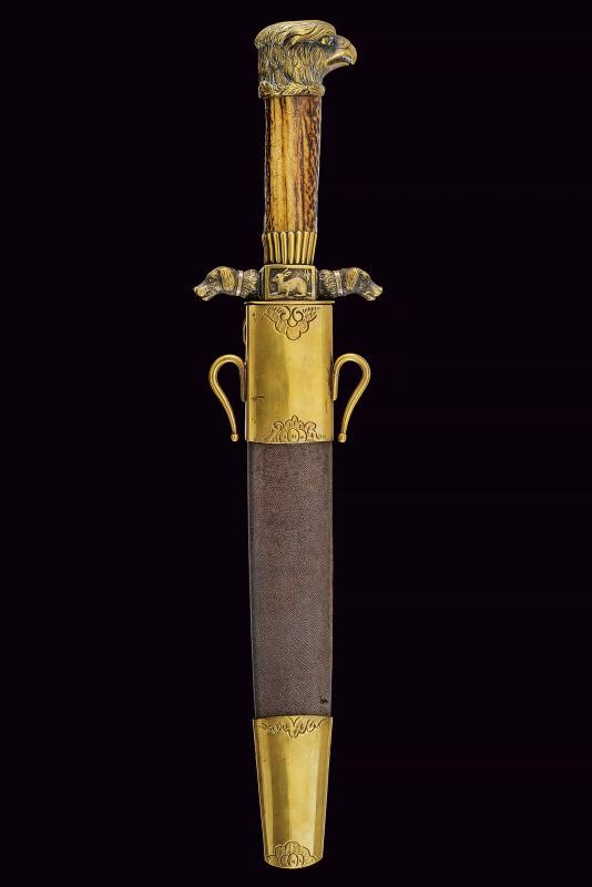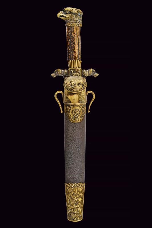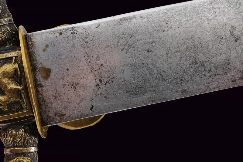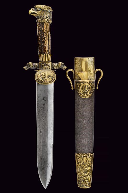 Robusta e larga lama a un filo con controfilo, con resti di incisioni floreali. Fornimento in ottone: pelta ovale raffigurante un cinghiale in combattimento con segugi; massello decorato con un cerbiatto; bracci dell'elso terminanti a testa di segugio; pomo a testa d'aquila. Impugnatura in corno di cervo. Fodero in legno rivestito in pelle di pesce con fornimenti in ottone finemente decorato a trofei di caccia in bassorilievo. Completo di coltellino accessorio con impugnatura in corno di cervo.