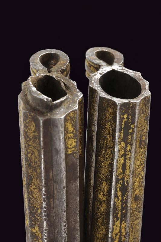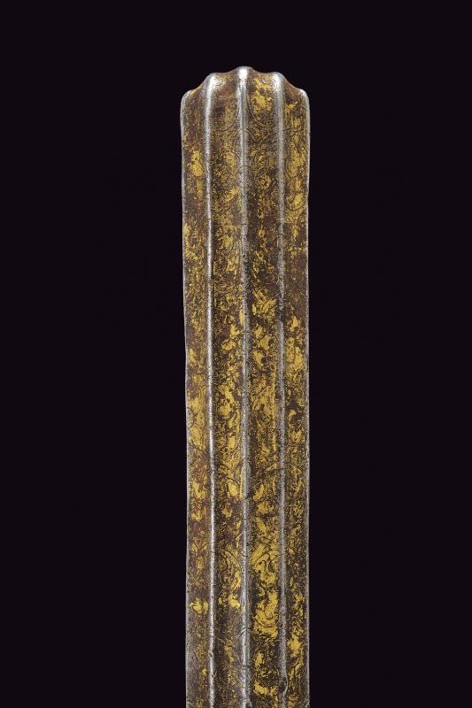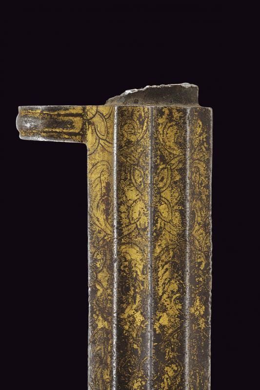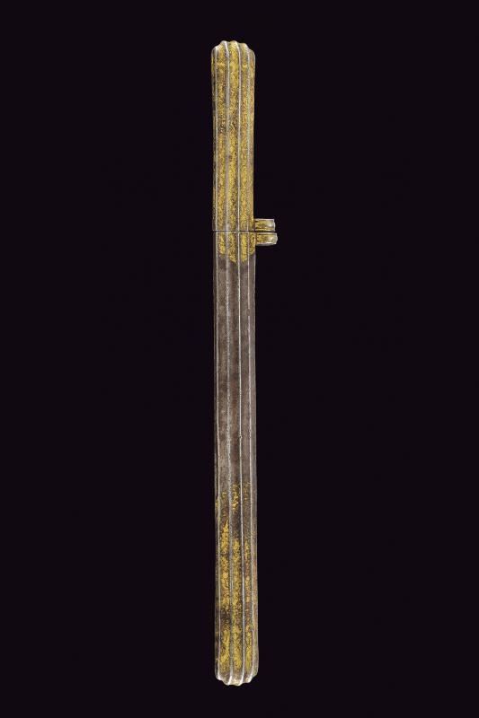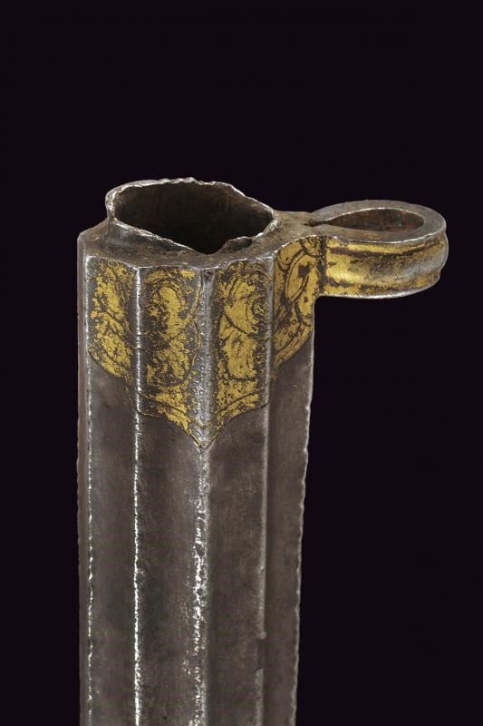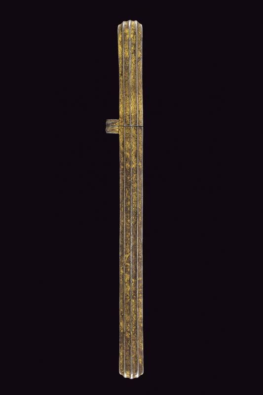 Costituito da due pezzi in ferro di forma lunga stretta, decorato a scanalature longitudinali e ornato con incisioni floreali dorate (mancanze). Gli elementi uniti da due anelli (il perno mancante). Molto raro.