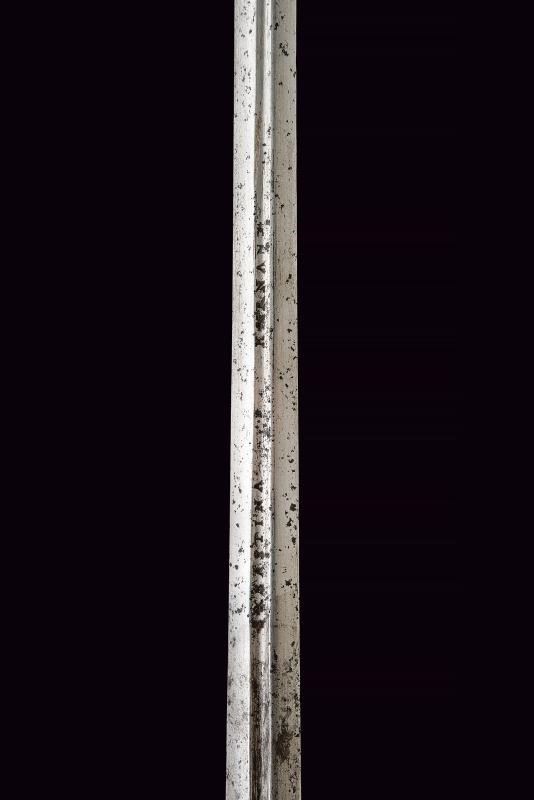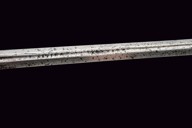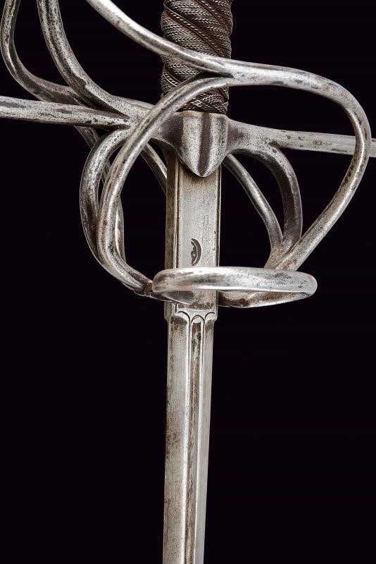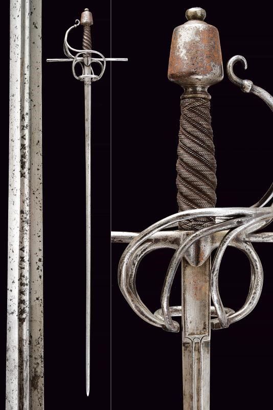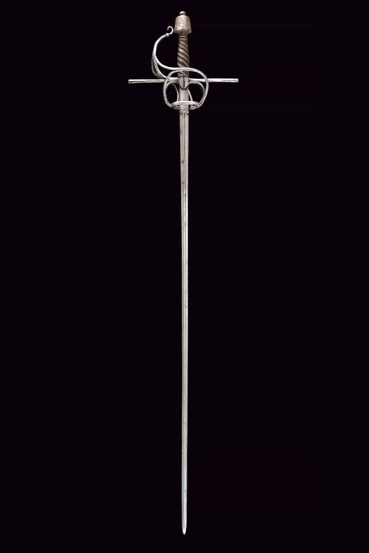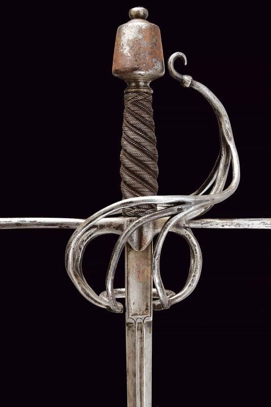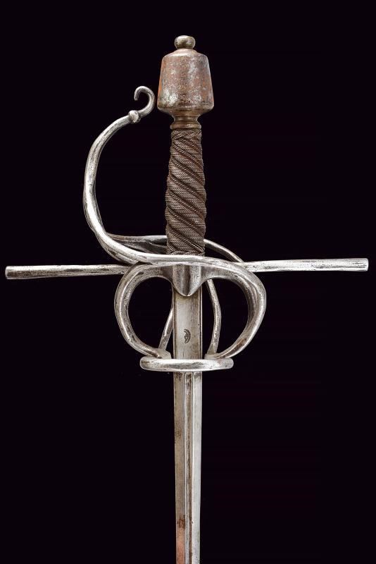 Lama dritta a due fili con sguscio centrale che corre per quasi tutta la lunghezza, recante la firma "SEBASTINA HERNAN"; ricasso con marca a mezzaluna delineata ai bordi. Fornimento in ferro a due ponti, guardia a tre rami con ricciolo all'estremità. Pomo troncoconico. La controguardia a tre rami. Impugnatura con bellissima trecciola del XIX secolo.