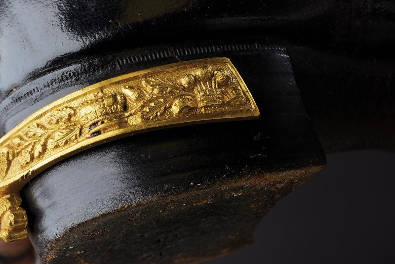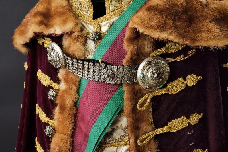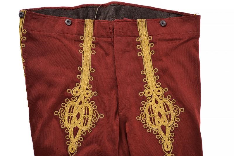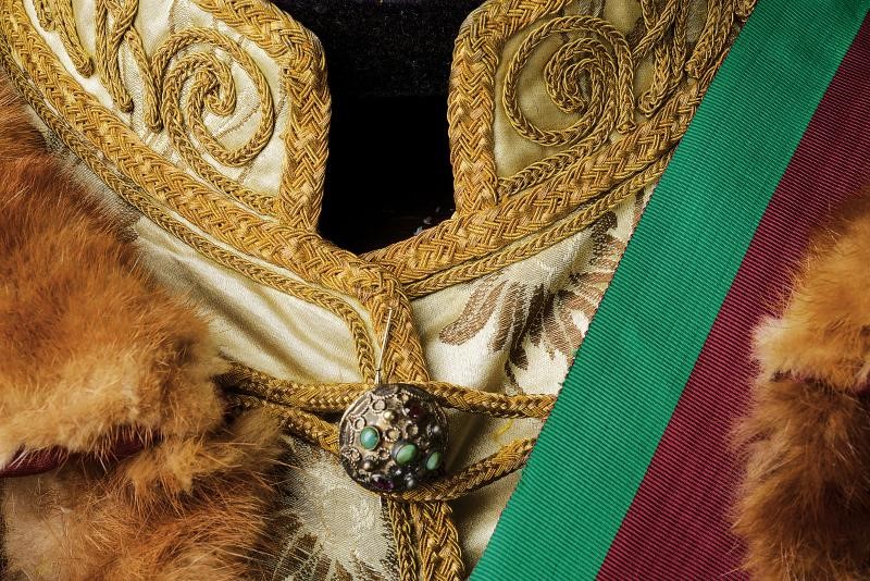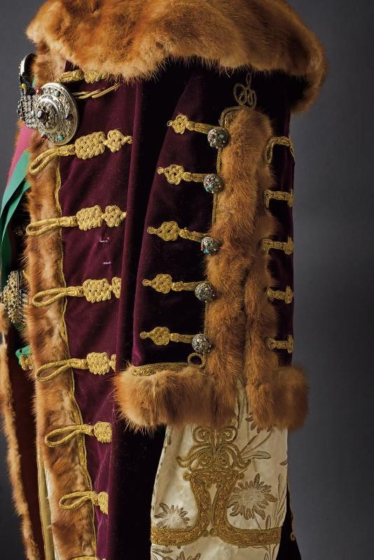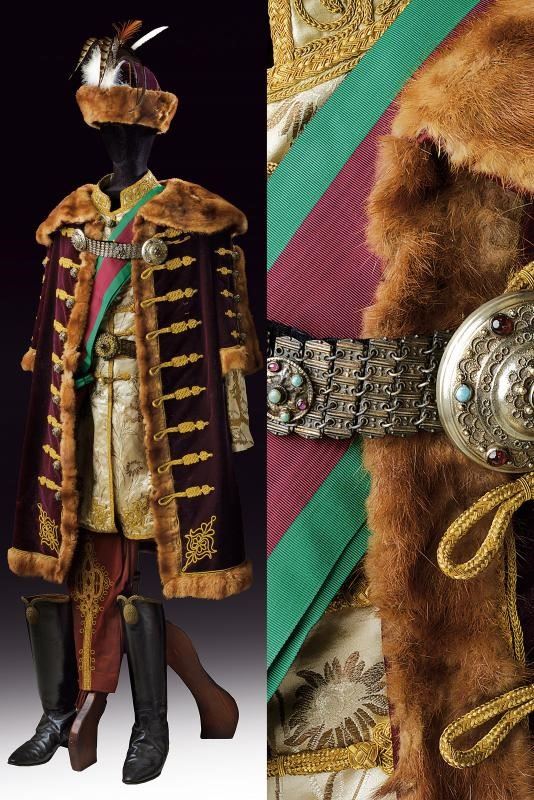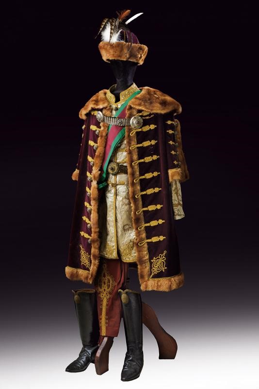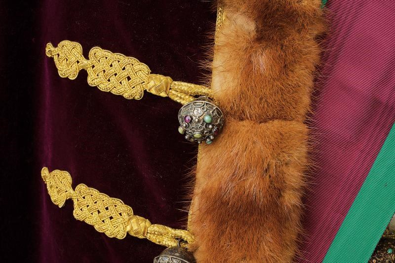 Composta dal berretto tradizionale (Kolpak), in panno rosso profilato, con bordo in pelliccia e arricchito con piume e aegrette. Veste (Mente) in tessuto tipo velluto color rosso porpora bruno, bordata in pelliccia e con alamari, profilature e decori in canutiglia dorata. Tunica allacciata tipo con alamari tipo dolman, sempre lavorati in canutiglia dorata; il tessuto in broccato di seta color avorio, recante bellissimi ricami floreali. I pantaloni profilati oro e in panno color porpora a riprendere il colore del berretto e della sopraveste. L'uniforme completa di una fascia dell'Ordine di Santo Stefano e di un paio di stivali in pelle di vecchia fattura. Gli elementi decorativi metallici finemente realizzati in metallo color argento lavorato in filigrana e con cabochon in color azzurro e vitrei rossi. Piccoli danni, segni d'uso e del tempo. Manichino non incluso. Di grande fascino e imponente eleganza.