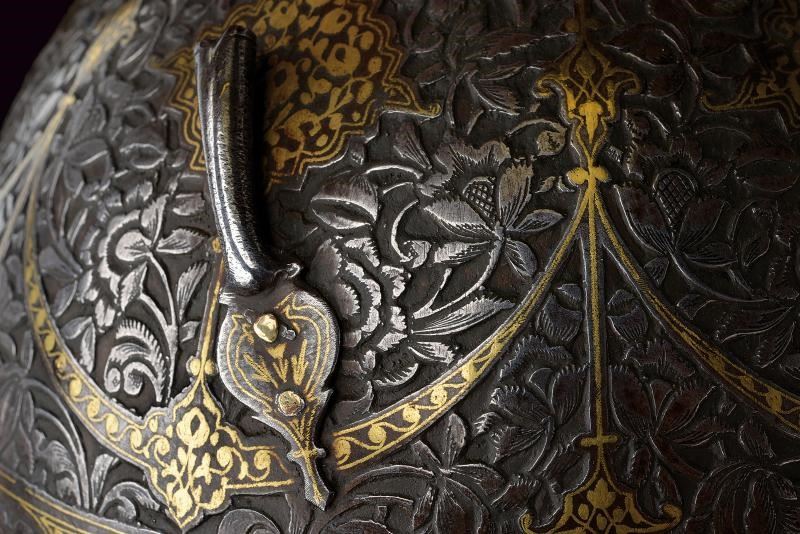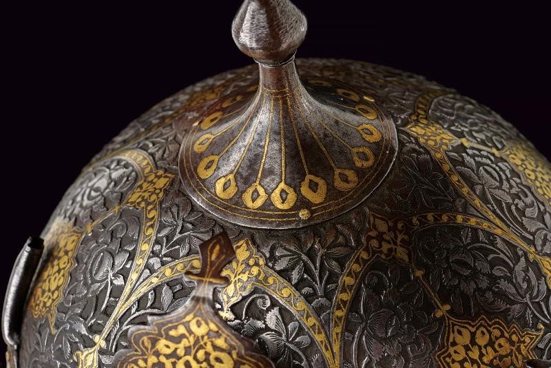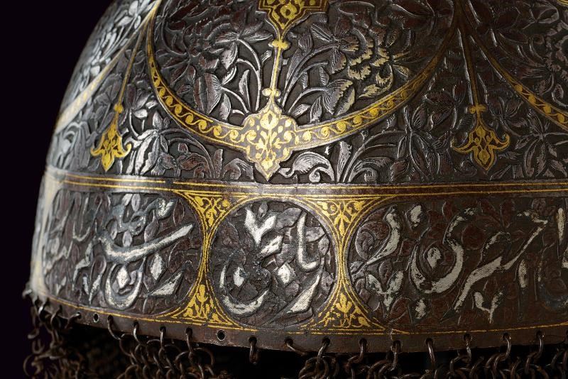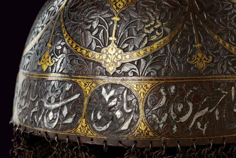 Coppo emisferico in ferro, sormontato da una cuspide a sezione quadra con nodo e base troncoconica. La parte frontale è munita di nasale scorrevole, alle cui estremità sono presenti cartigli con decorazioni floreali in oro; sui lati due pennacchiere. L'intera superficie dell'elmo è ornata da fini incisioni floreali in bassorilievo, arricchite da cartigli e bande in oro; la fascia inferiore presenta cartigli grandi e piccoli recanti versi del Corano parzialmente rimessi in argento. Completo di camaglio ad anelli molto piccoli, in ferro, con chiusura semplice e bordo inferiore a frange.