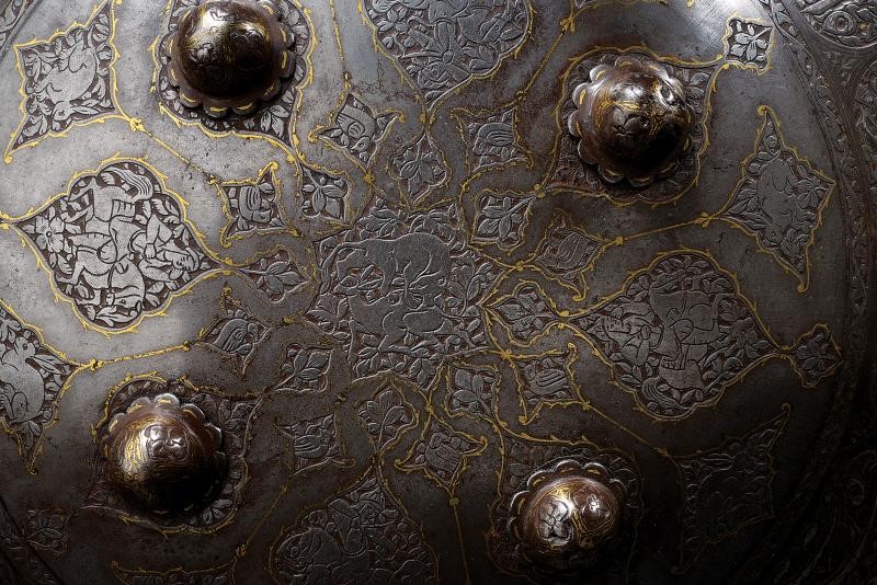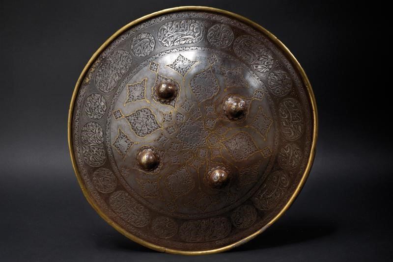 In ferro, di forma circolare e convessa, munito di quattro borchie a forma di fiore e dotato di bordo rinforzato con un anello in ottone fissato con ribattini. L'intera superficie anteriore è suddivisa in cartigli con bordi in oro; al centro è raffigurato un leone con un cerbiatto. I quattro cartigli maggiori presentano arcieri a cavallo, otto cartigli raffigurano lepri, gli altri, più piccoli, presentano volatili o decori floreali. Il margine è ornato con grandi cartigli alternati ad altri più piccoli, tutti con iscrizioni coraniche ageminate in argento. All'interno è presente tessuto rosso e quattro anelli per le maniglie (queste mancanti). Di buona qualità.