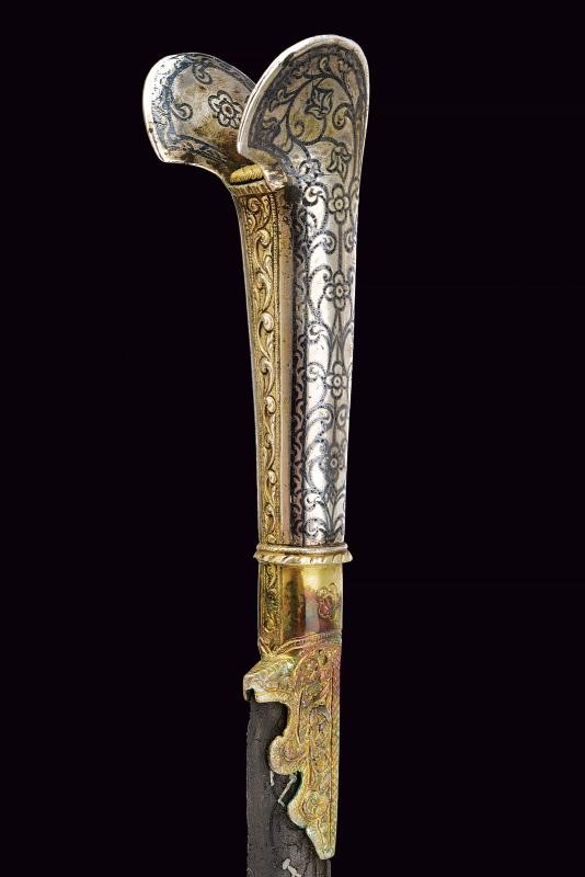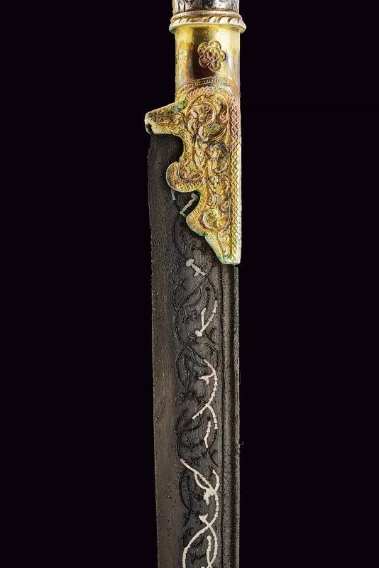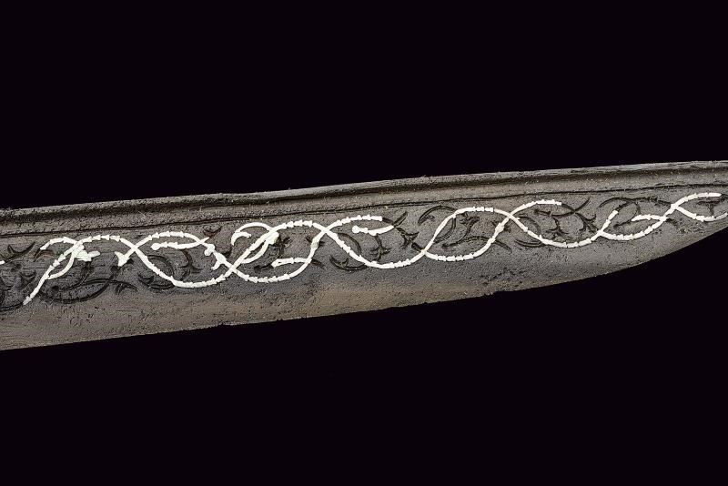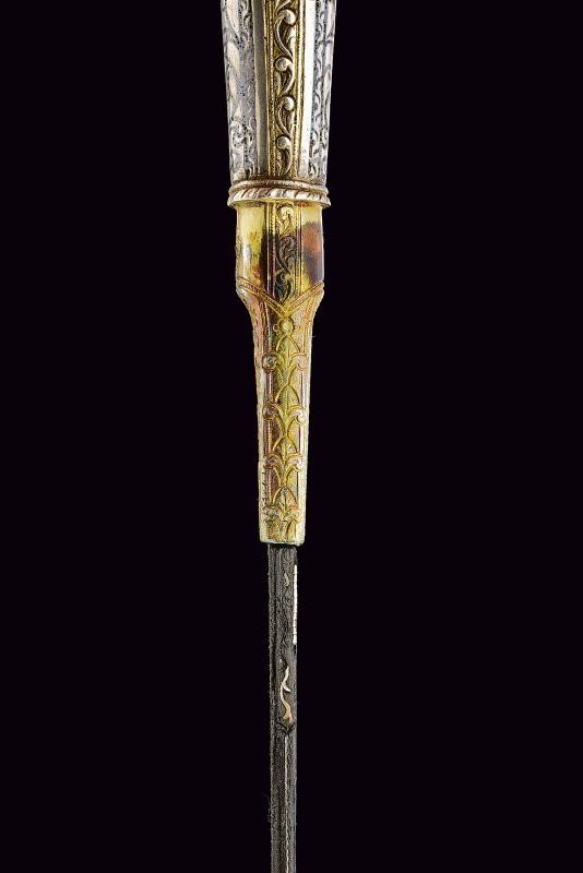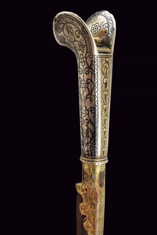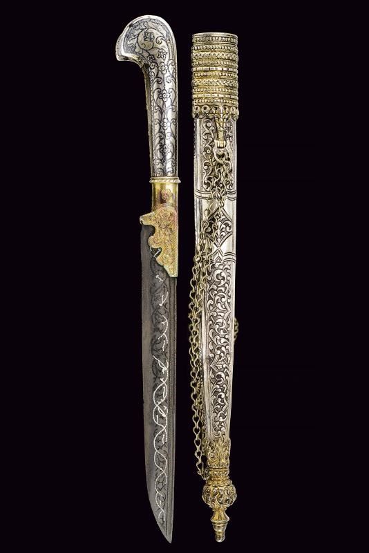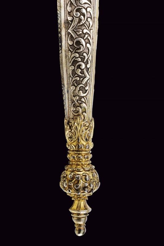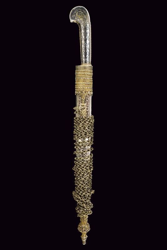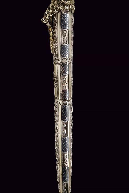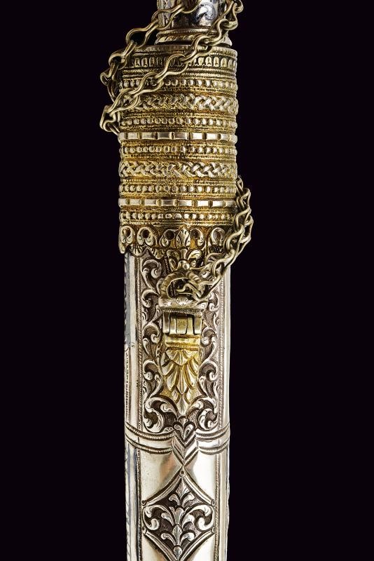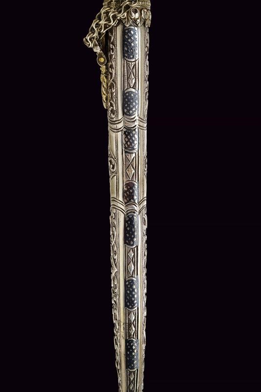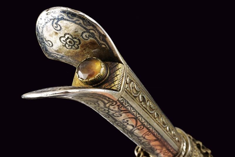 Lama dritta a un filo con scanalatura dorsale, decorata a tutta lunghezza con fregio geometrico ad intreccio rimesso in argento (mancanze). Ghiera in ottone, questa copre anche una piccola porzione della base della lama, intagliata a motivi floreali. Impugnatura di tipica forma, rivestita in argento inciso, intagliato e niellato a volute floreali; fra le due piccole orecchie una pietra dura color ambra in cornice con bordo sagomato a petali. Fodero in legno completamente ricoperto con fornimenti in argento finemente lavorati a sbalzo ed intagliati a volute floreali, gli elementi dorsali anche niellati; bel puntale di forma sferica intagliata in bassorilievo con bottone avente base a torre e corpo a settori semisferici. Anello di sospensione con lunghissima catenella.