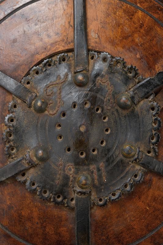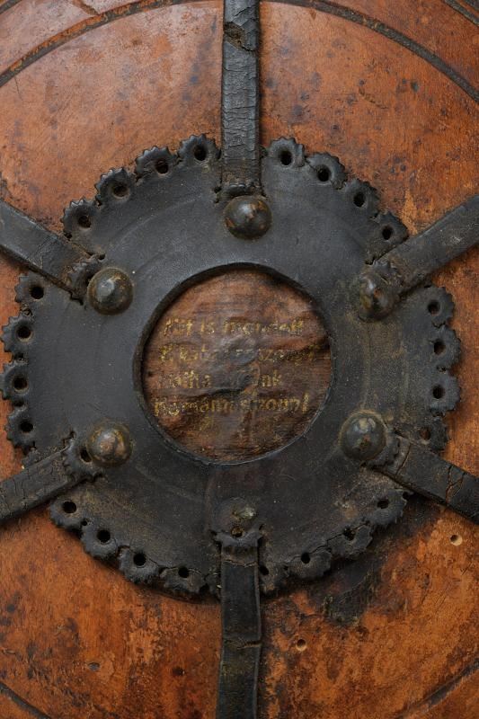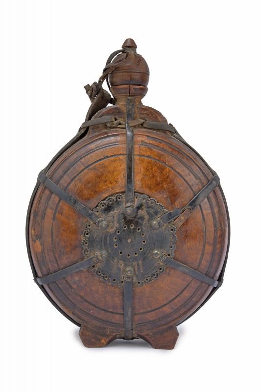 Corpo in legno tornito completo di tappo. Le cinghie in cuoio disposte a raggi.