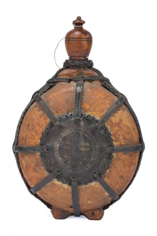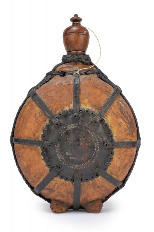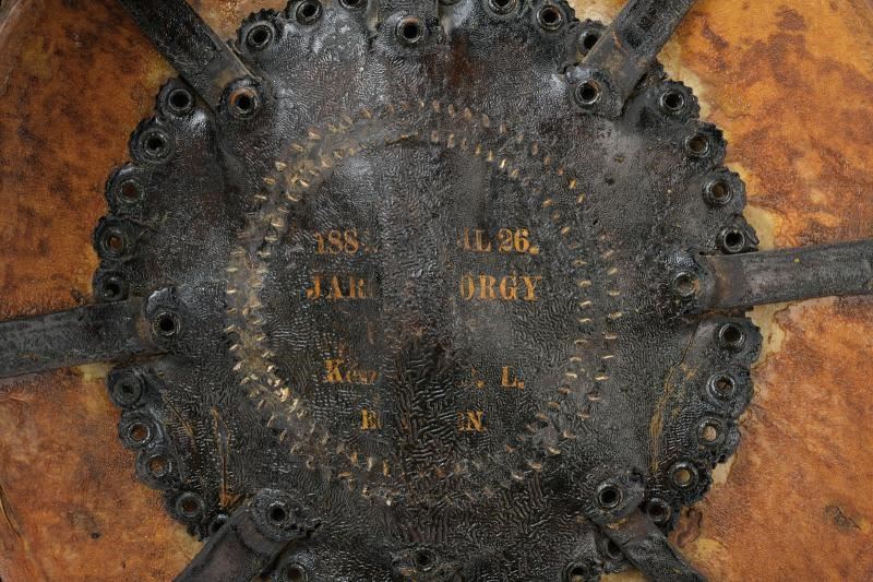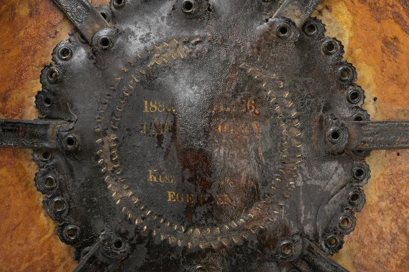 In legno tornito rivestito di cuoio, con cinghie in cuoio — parzialmente intrecciate — disposte a raggi, e medaglione centrale su entrambi i lati recante la data “1884” e un'iscrizione in ungherese stampato in oro su entrambi i lati.