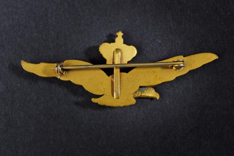 In metallo non ferroso dorato, aquila coronata volta a destra. Sul retro spilla orizzontale.