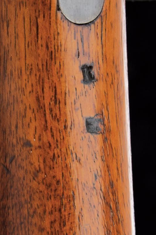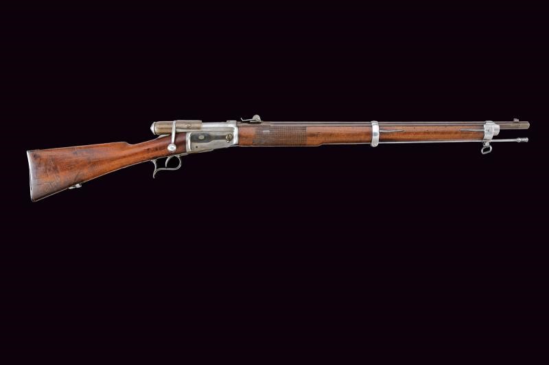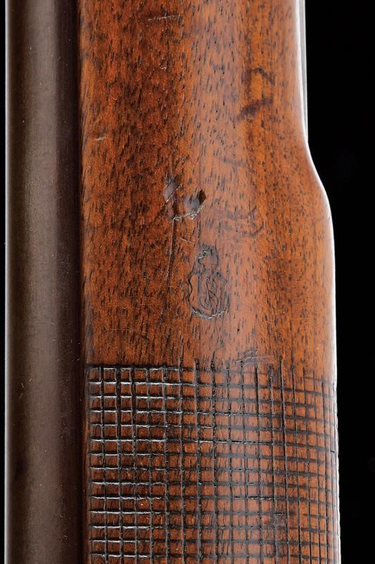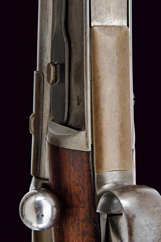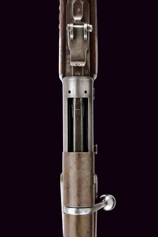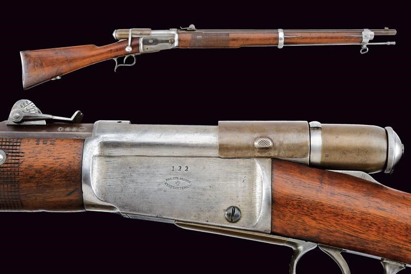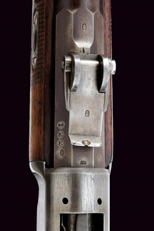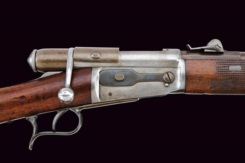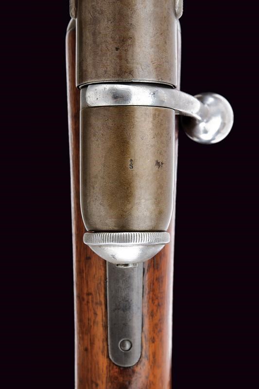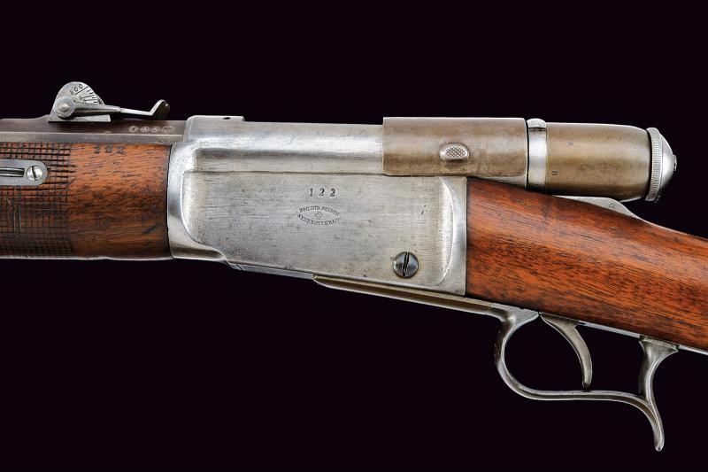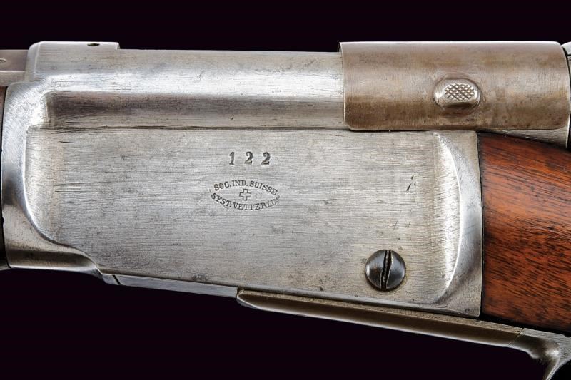 Canna tonda rigata, dotata di mirino e con alzo regolabile. Culatta ottagonale numerata e recante punzoni elvetici. In volata cal. 10,5 mm. Anima pulita rigatura visibile. Otturatore girevolve-scorrevole, a percussione centrale, completo di guaina scorrevole di copertura per l'espulsore e di guaina anche per l'imboccatura di inserimento delle munizioni. Meccanica funzionante. Castello con marcatura della "SOC. IND. SUISSE". Calcio ed astina in legno, timbrati, la seconda con segmento zigrinato. Resti di vecchia brunitura. Leggeri segni d'uso e del tempo.