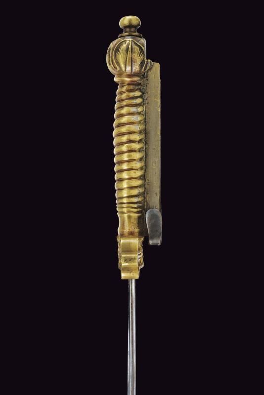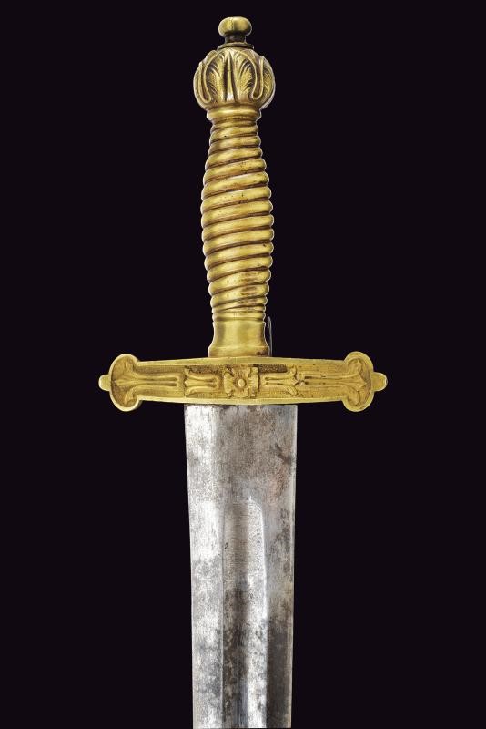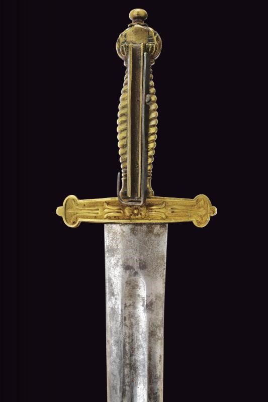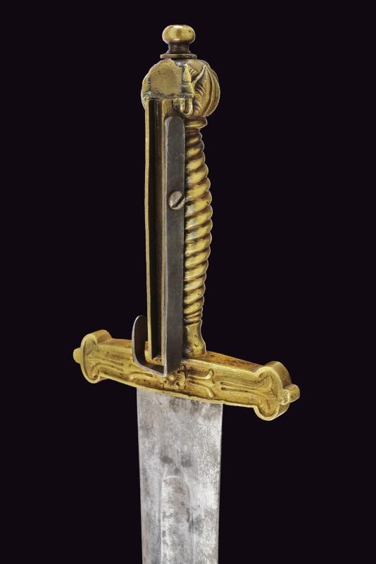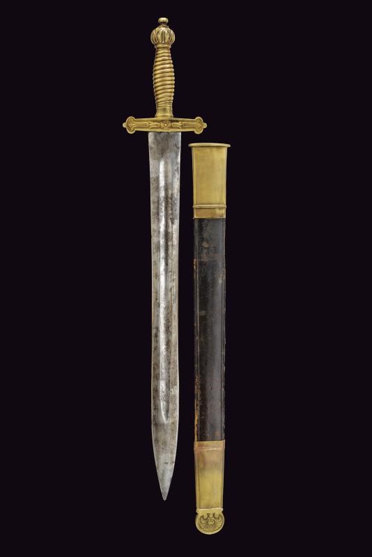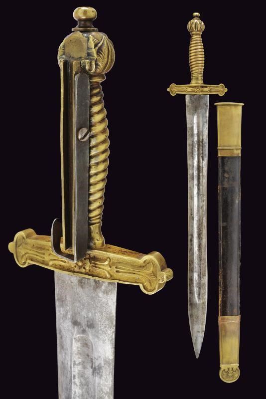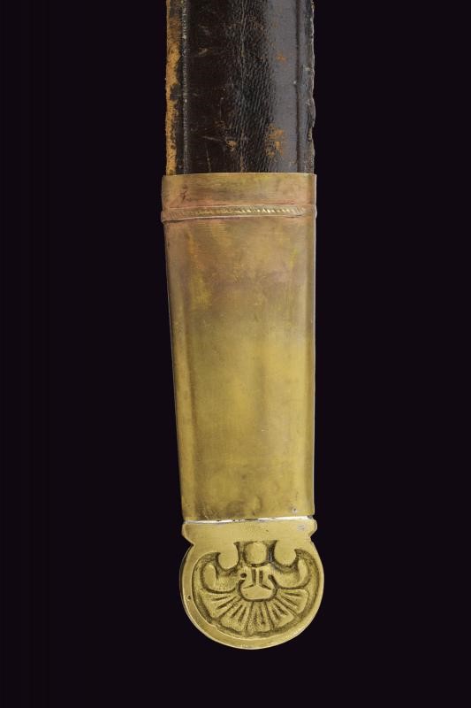 Larga lama a due fili con sguscio centrale. Fornimento in ottone massiccio con attacco per fucile. Fodero in cuoio con fornimenti in ottone, bottone a forma di cuore. Si abbina al fucile n. 54 di quest'asta.