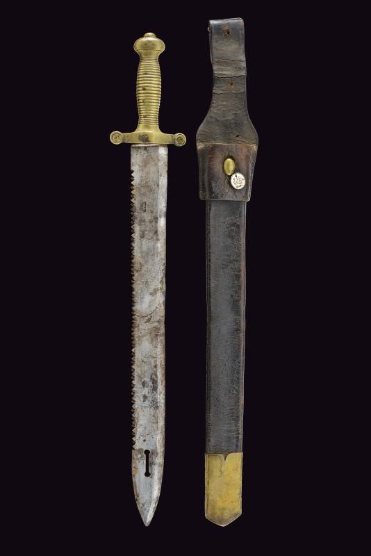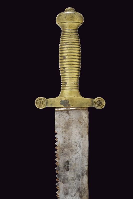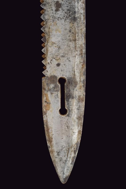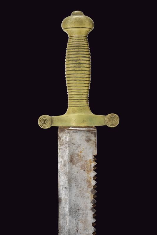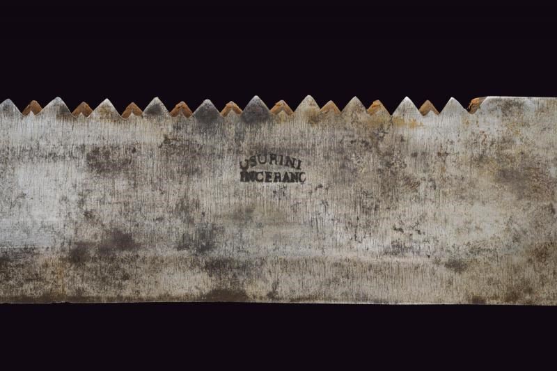 Larga lama dritta a un filo e breve controfilo, con dorso a sega e traforo al debole; rottura restaurata in epoca d'uso. La base marcata "USURINI IN CERANO". Fornimento in ottone massiccio. Fodero in cuoio con fornimenti in ottone e taschetta sempre in cuoio.