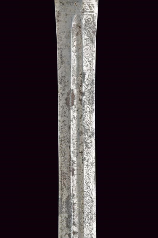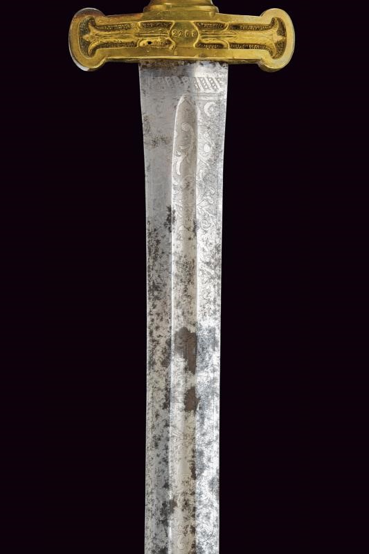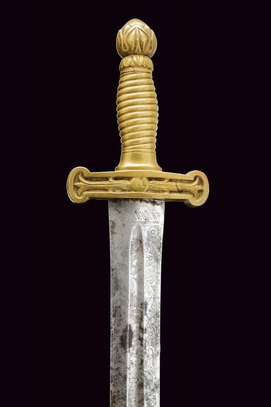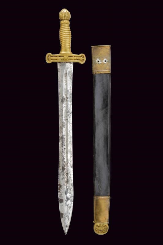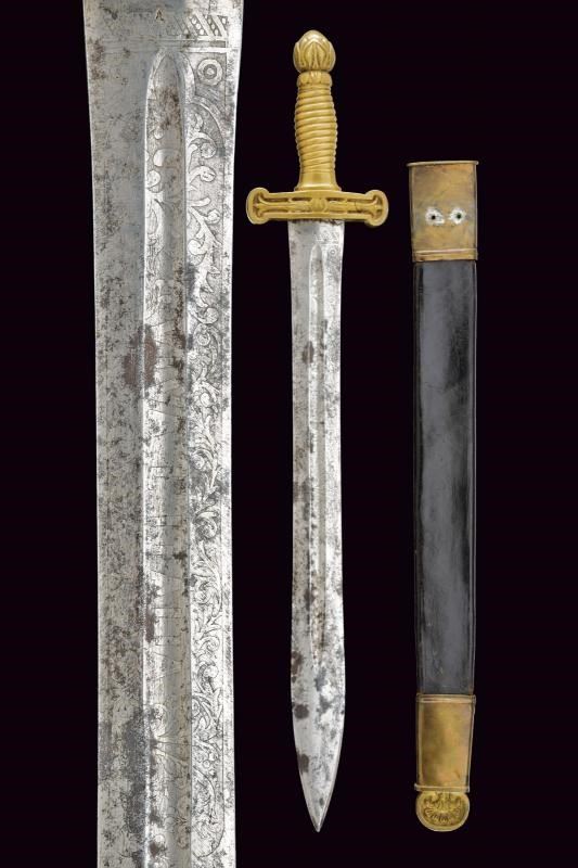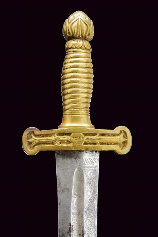 Lama diritta a due fili, sgusciata, con punzone alla base; incisa con il motto “VIVA L'ITALIA” su un lato e “MAZZONI” sull'altro, tra motivi floreali. Presenti zone con danni da ruggine. Fornimento in ottone massiccio con elso a bracci diritti recanti decorazioni a foglie in rilievo, marcato “A” e numerato. Impugnatura a spire e pomo a bocciolo. Completa di fodero in cuoio con fornimenti in ottone (manca il passante), il puntale palmato.