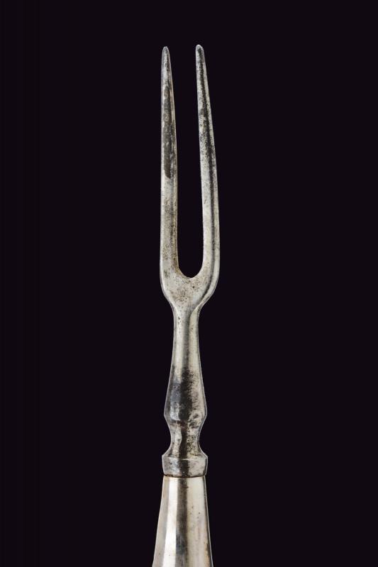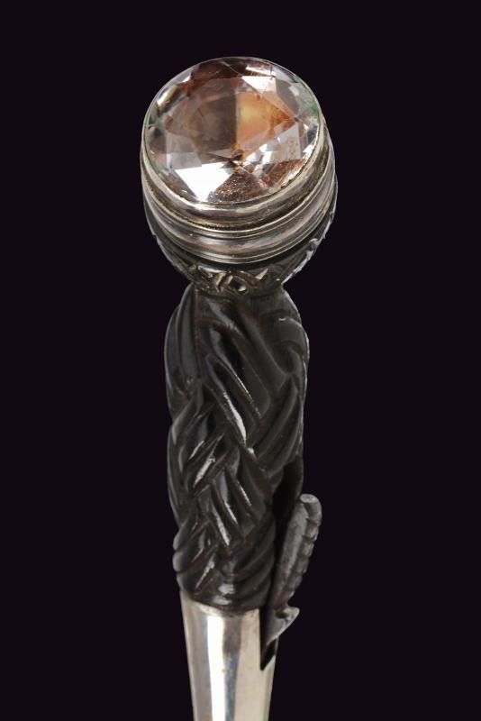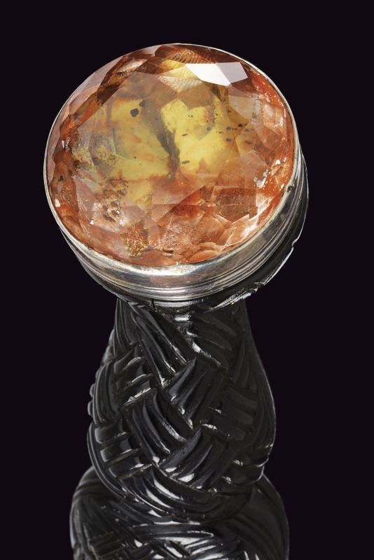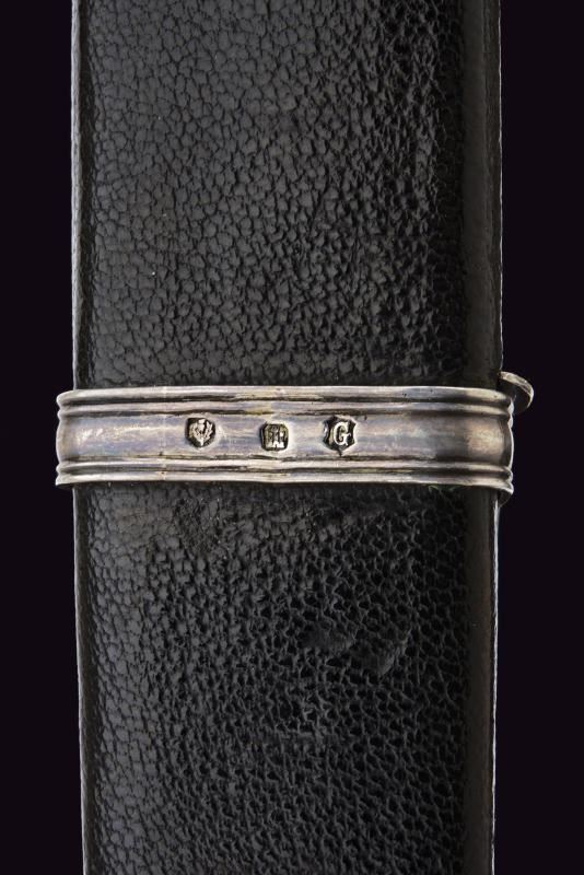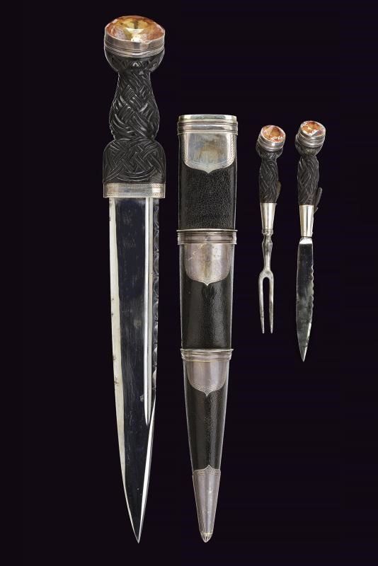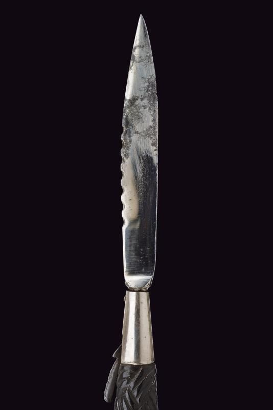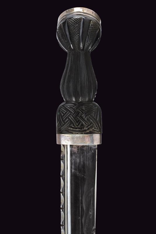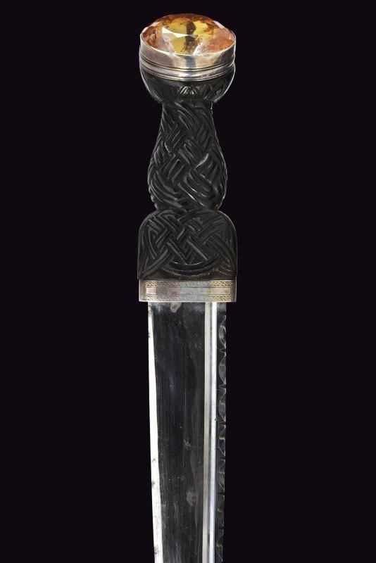 Lama diritta a un filo con scanalatura e dorso intagliato. Impugnatura in legno nero intagliato a bande intrecciate, con fornimenti in argento inciso e con tipico pomo dotato di cabochon in vetro colorato. Fodero in legno rivestito di cuoio, con fornimenti in argento (diversi punzoni).