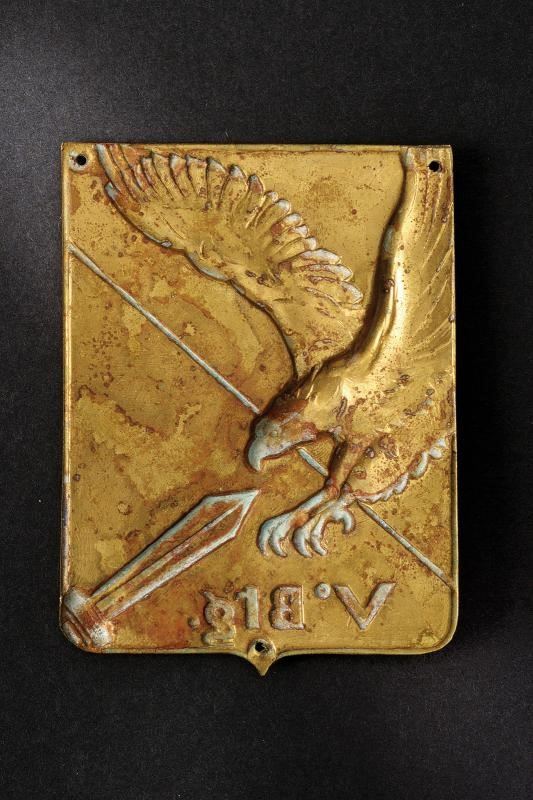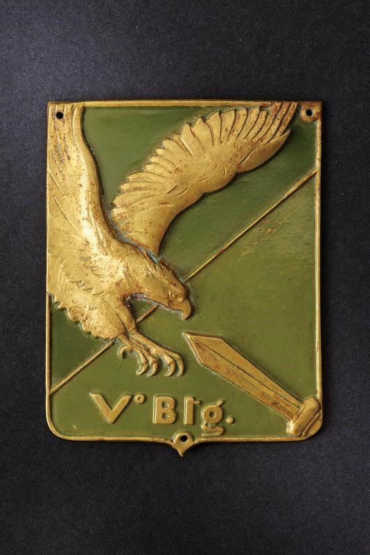 In ottone con aquila, gladio, bordi e dicitura "V Btg. " dorati; lo sfondo verde. Con tre sforature per il montaggio.
