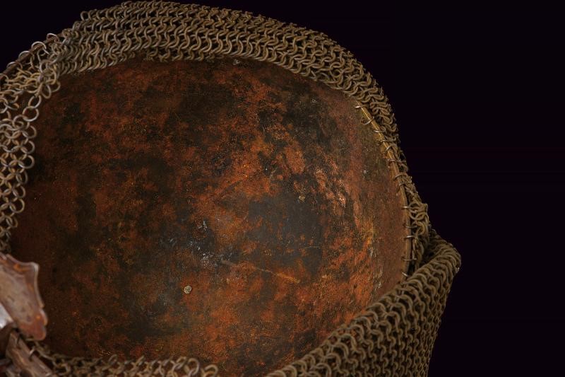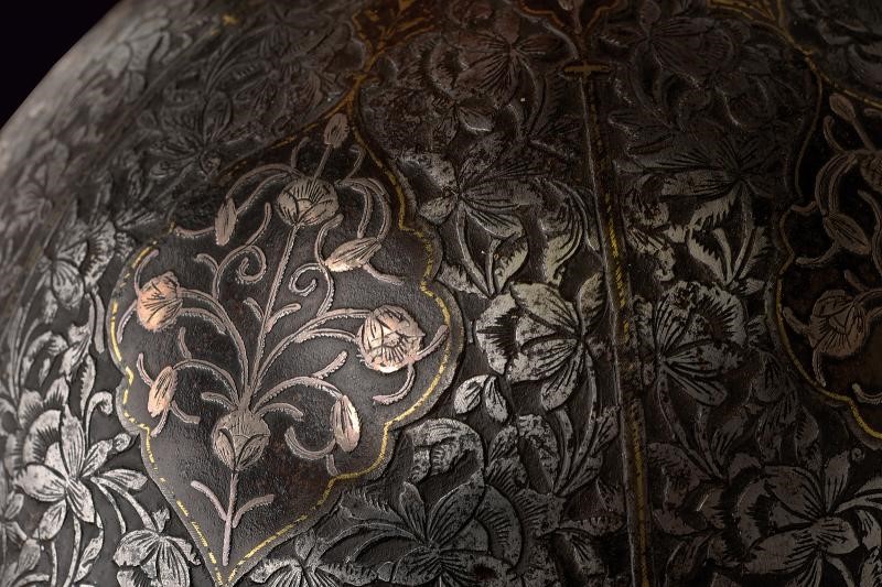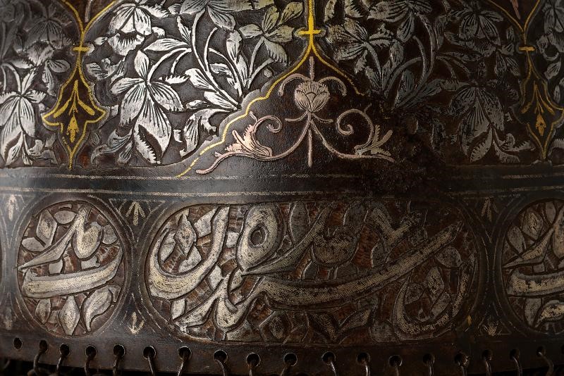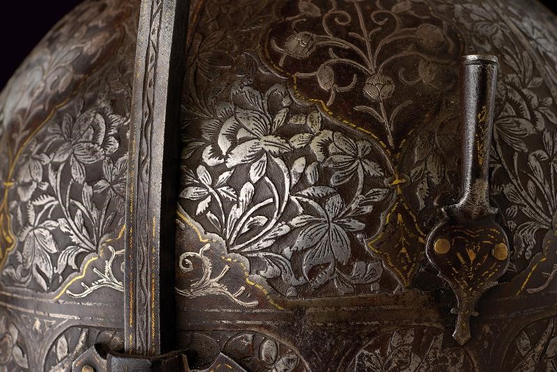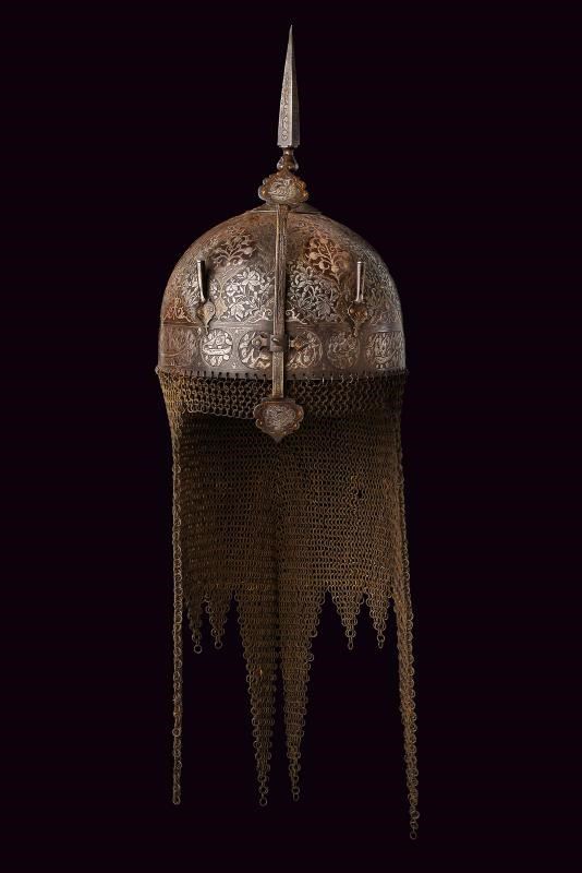 Coppo emisferico in ferro, sormontato da una cuspide a sezione quadra con nodo e base troncoconica. La parte frontale è munita di nasale scorrevole, alle cui estremità sono presenti cartigli incisi con volatili e decorazioni in oro; sui lati due pennacchiere. La superficie dell'elmo è ornata da sei cartigli con fiori in argento su fondo liscio e bordi in oro; gli spazi intermedi sono decorati con fini incisioni floreali a effetto di bassorilievo. La fascia inferiore presenta grandi cartigli alternati a cartigli più piccoli, recanti versi del Corano. Completo di camaglio ad anelli in ferro con chiusura semplice e bordo inferiore a frange.