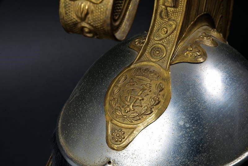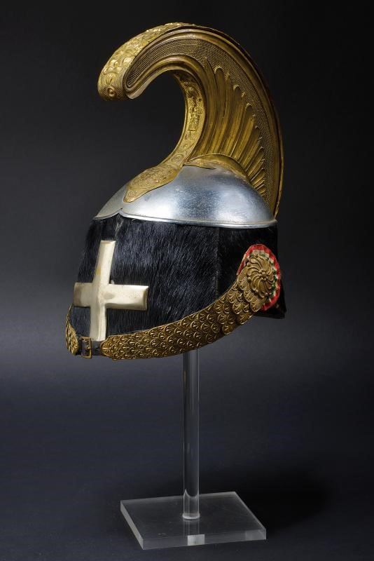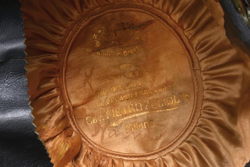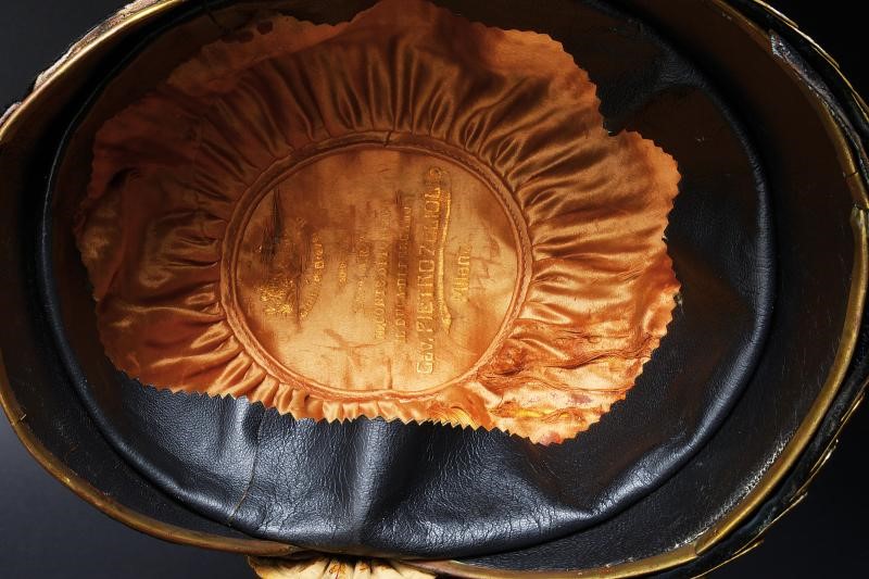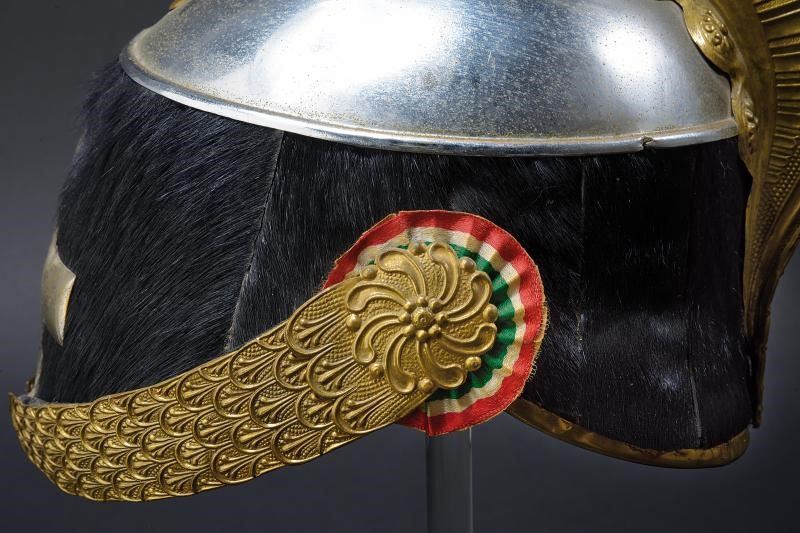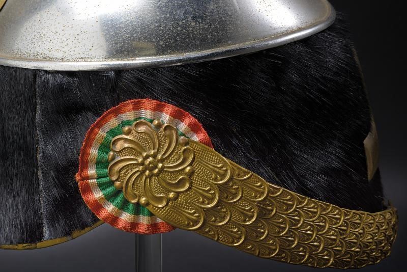 Coppo in metallo bianco, con turbante in pelliccia nera, fregio frontale a croce in argento; soggoli in cuoio corazzati con scaglie in ottone; cimiero in ottone con decorazioni in bassorilievo a trofei e foglie, testa di leone e con placca recante il monogramma "VE" coronato e fra allori; coccarda in stoffa con tricolore. All'interno fascia in alluda. Cuffia in seta con timbro in oro di un rivenditore di Milano. Periodo di Vittorio Emanuele III.
