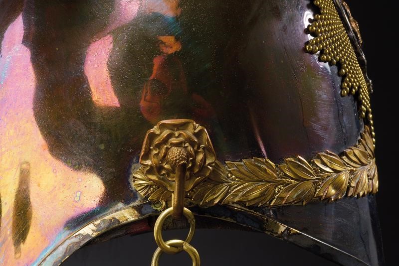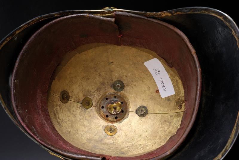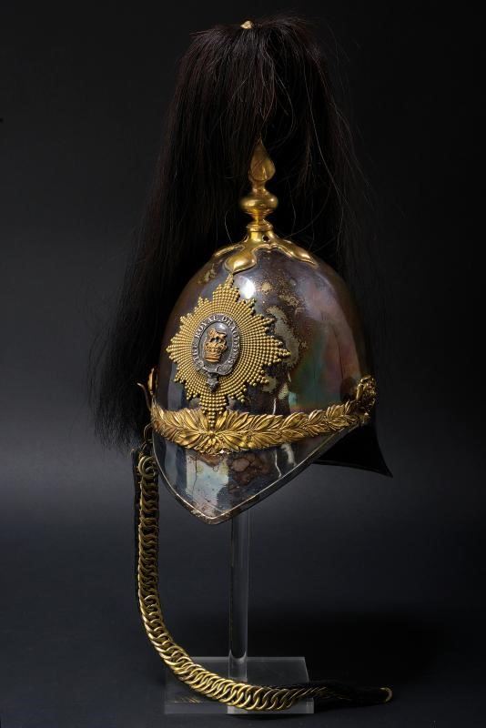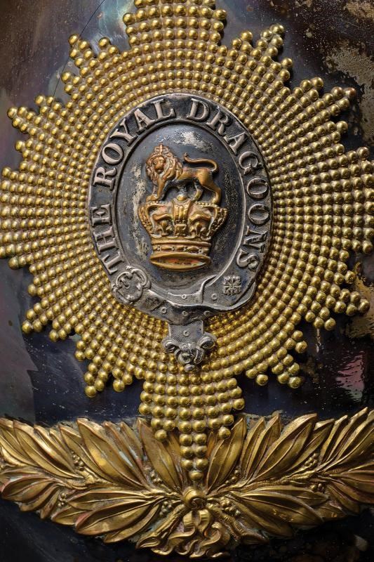 Coppo in alpacca, sommità con puntale munito di crine nero; fregio anteriore costituito da stella dorata a dodici punte operata a decoro diamantato e caricata con una placca recante l'iscrizione "THE ROYAL DRAGOONS" la quale porta al centro un piccolo fregio in ottone effigiante un leone posto sulla corona reale. Al di sopra della tesa un fornimento in ottone dorato strutturato a fronde di lauro. Soggolo in velluto con anelli in ottone; rosette a fiore, quella sinistro staccata e con fermo mancante. All'interno fascia in alluda color rosso. Piccoli difetti.
