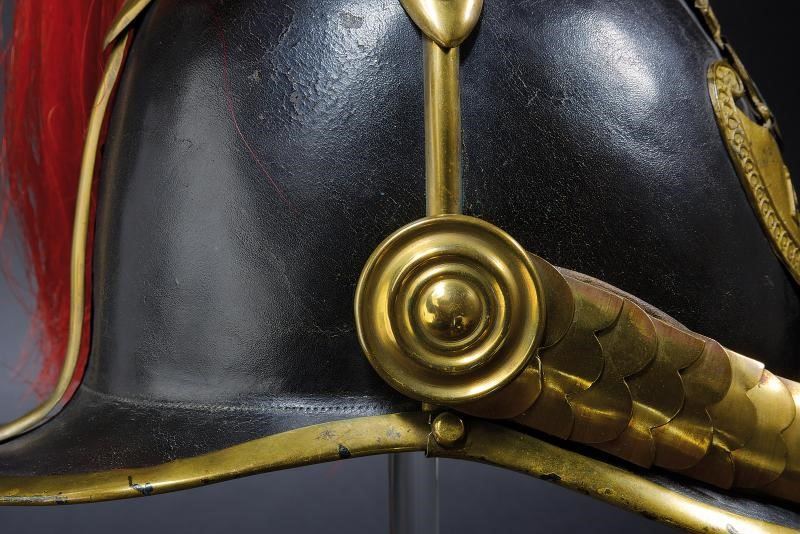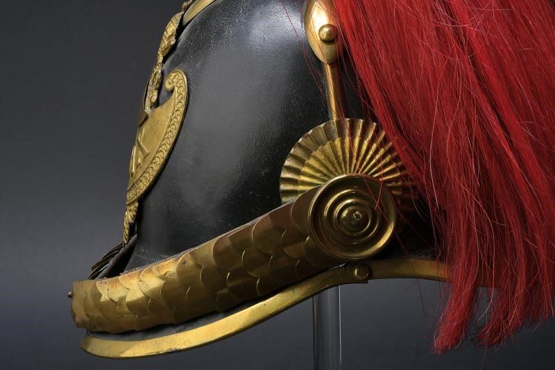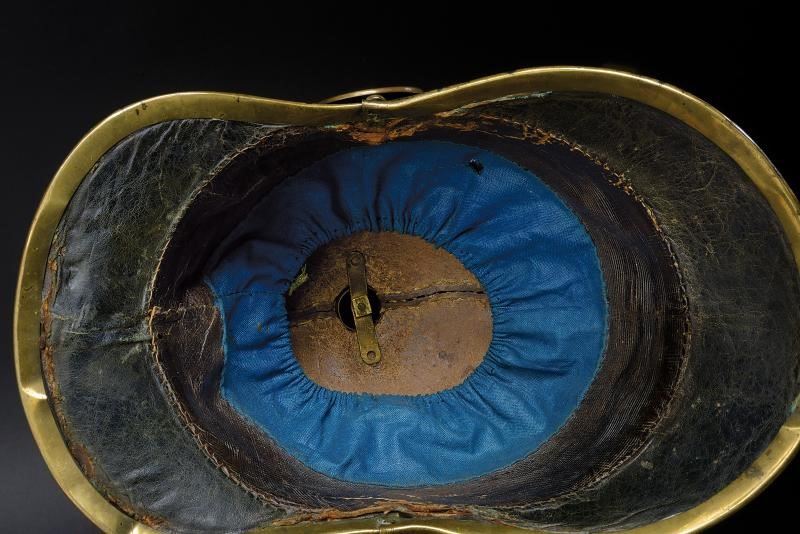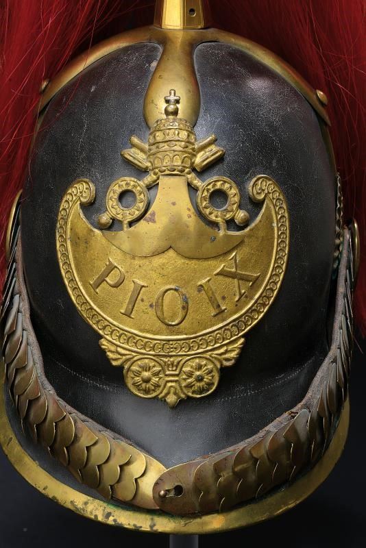 Coppo in cuoio bollito laccato nero, metallerie in ottone. I soggoli in cuoio, muniti di squame in ottone. Fregio frontale recante in rilievo "PIO IX", con placchetta in ottone liscio e triregno con chiavi decussate a sormontare il tutto. Coccarda a due lamine in ottone. Cuspide sommitale con crine tinto rosso. All'interno alluda in cuoio e cuffia in seta azzurra; la gronda e la tesa rivestite in cuoio.
