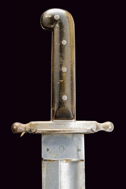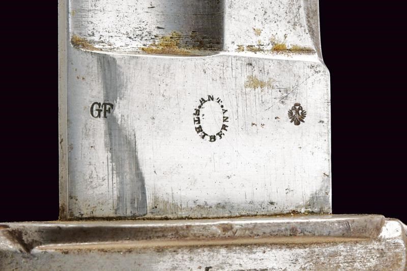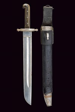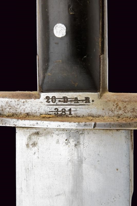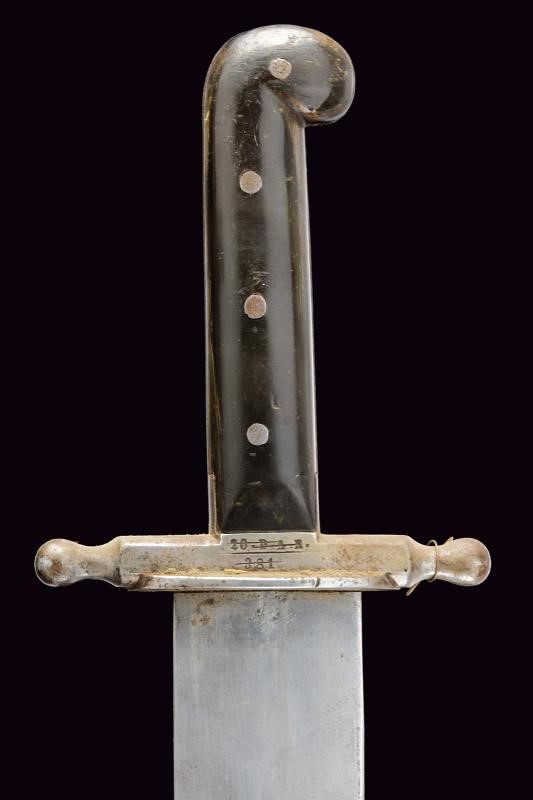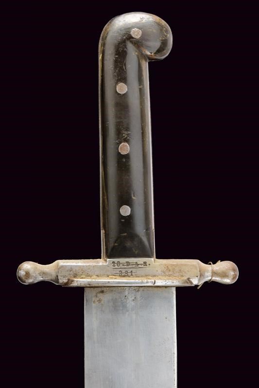 Larga lama con ampio sguscio sulla faccia anteriore, piatta sul retro, dotata di tallone recante le marcature "STRATBERNY" e bel punzone imperiale effigiante l'aquila bicefala. Fornimento in ferro, l'elso con marcatura "20. D. A. R. 381" sbarrata; guancette in corno (piccoli difetti) e pomo angolato. Completo di fodero in cuoio con fornimenti in ferro. Taschetta in cuoio.