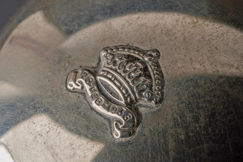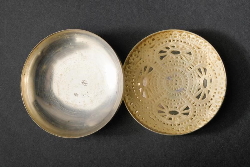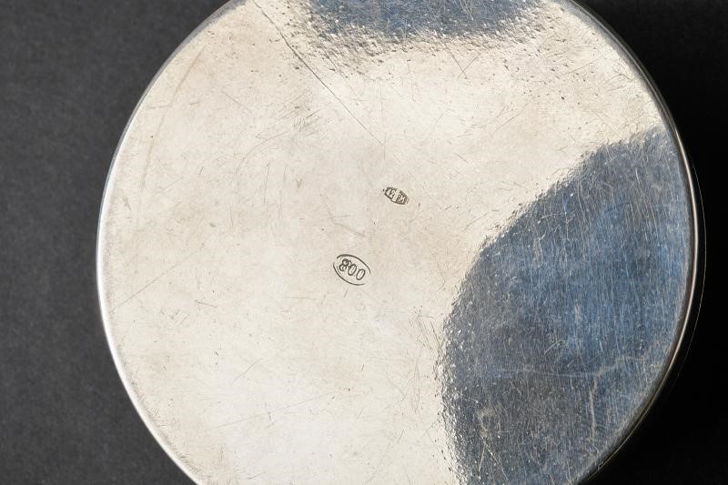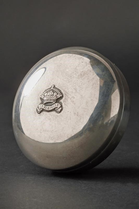 Bomboniera in argento per il matrimonio tra Ferdinando Umberto e Maria Luisa Alliaga Gandolfi, celebrato il 28 febbraio 1938 a Torino. Di forma circolare, con coperchio convesso, reca al centro una corona sormontante un bandeau con la data “28. FEB. 1938”. Al di sotto marca “800” e punzone dell'argentiere.
