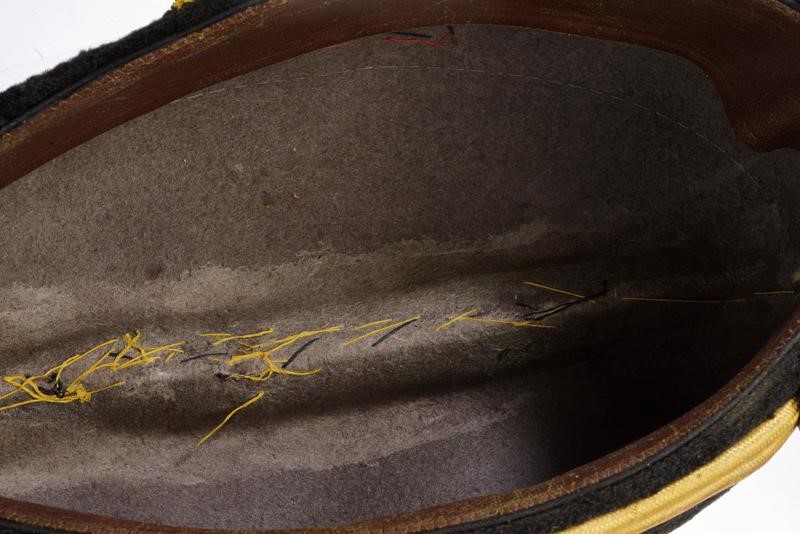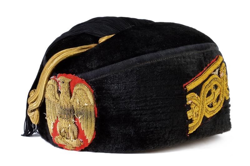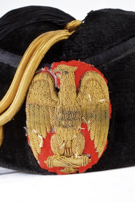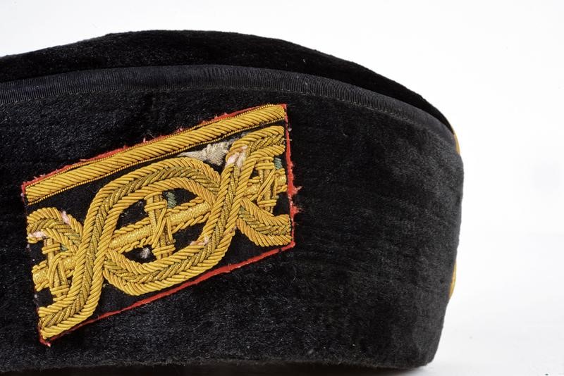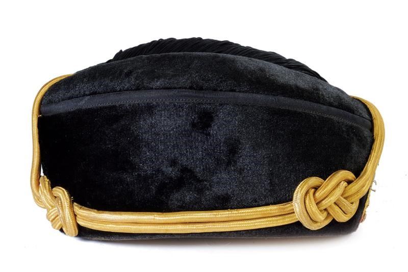 Aderente al regolamento del 1938, fusto rigido ricoperto di velluto di seta, frangia di tripolina di seta nera, completo di tutti gli effetti; l'interno con alluda in pelle e privo di fodera.
