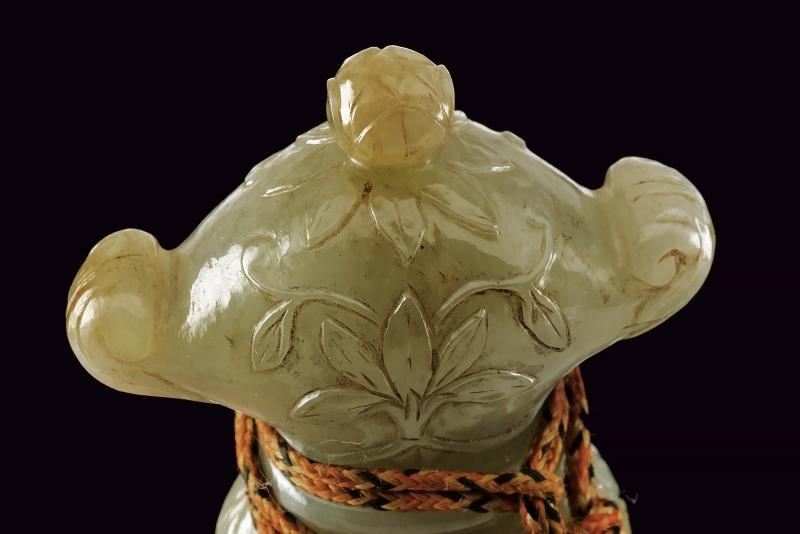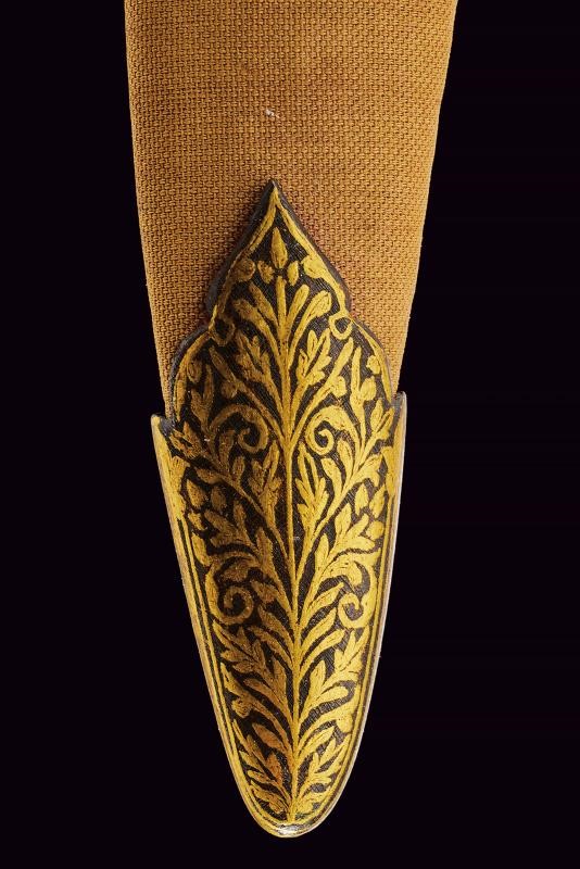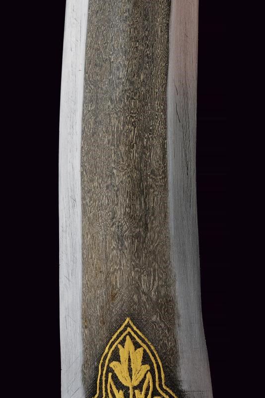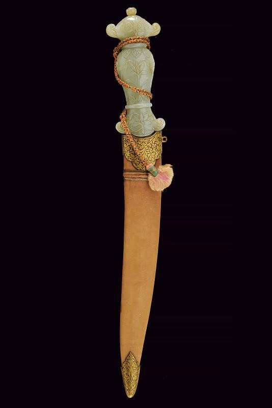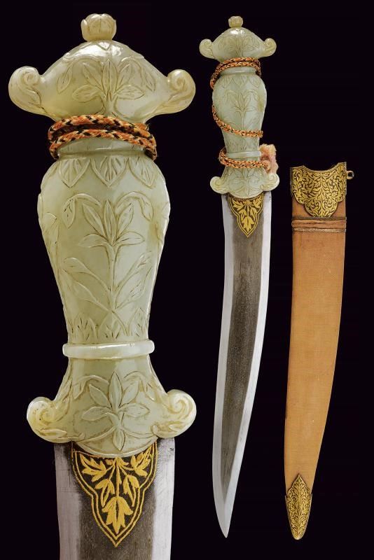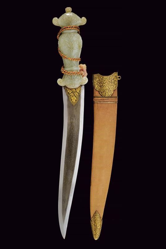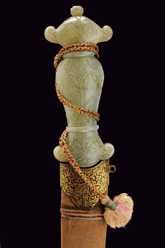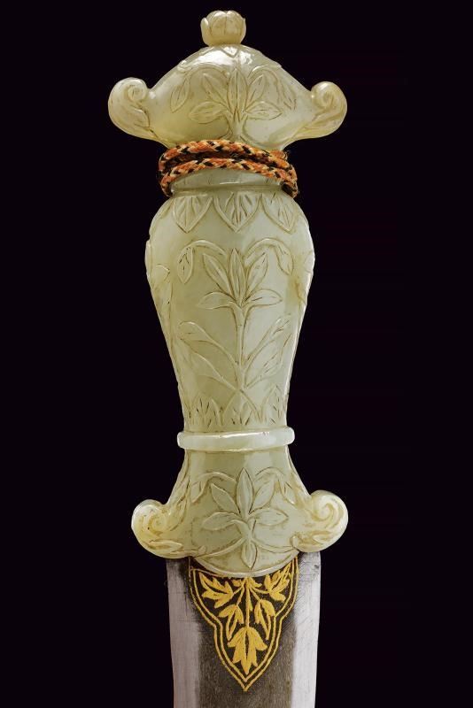 Lama leggermente curva a due fili, in fine damasco, con base decorata in oro a motivi floreali. Bella impugnatura in giada finemente intagliata e decorata a motivi floreali in bassorilievo e con bottone a germoglio. Fodero in legno ricoperto di velluto rosso (completamente liso) con fornimenti in ferro decorati in oro a motivi floreali.