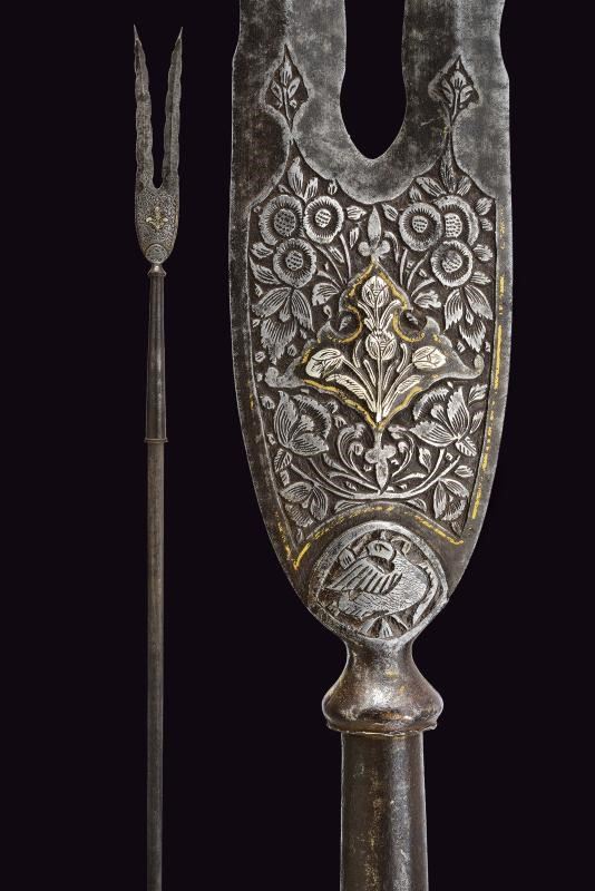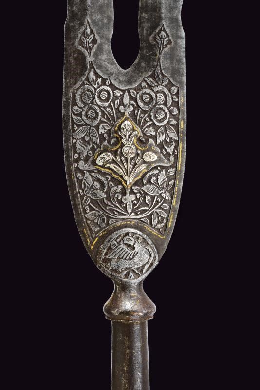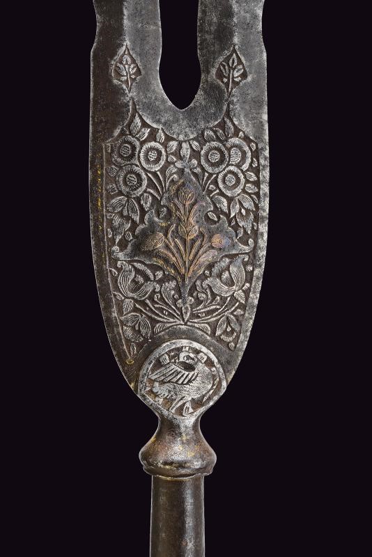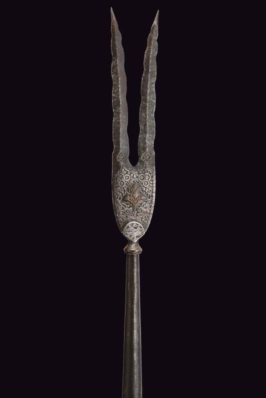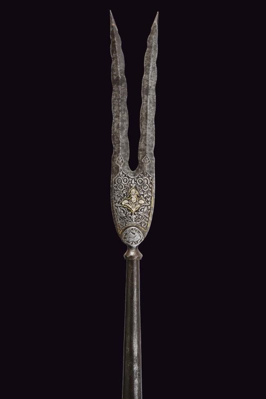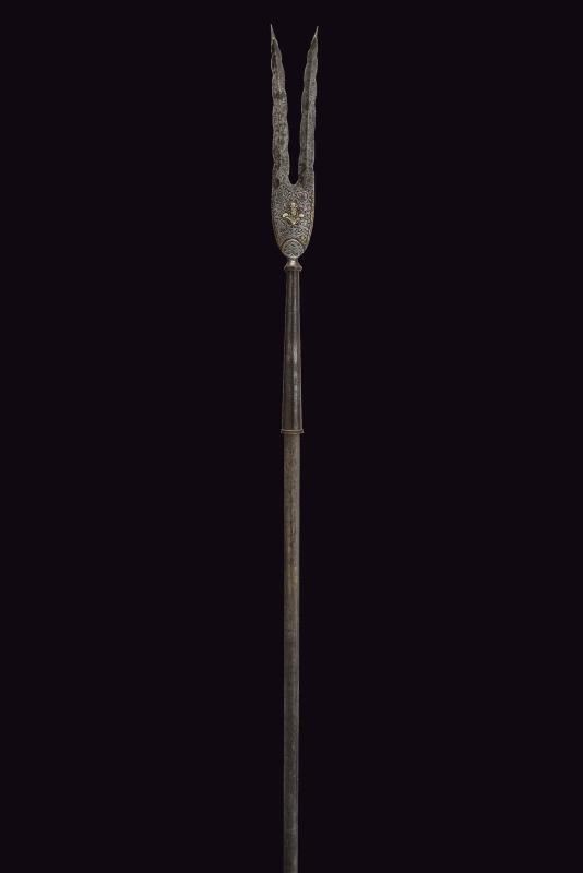 Ferro a due rebbi disposti a "V", entrambi a due fili ondulati e con punta rinforzata; la base incisa ed intagliata a motivi floreali con elementi dorati (mancanze). Nodo periforme, gorbia troncoconica in ferro. Su affusto ligneo di epoca più tarda, con piede a calzuolo in ottone.