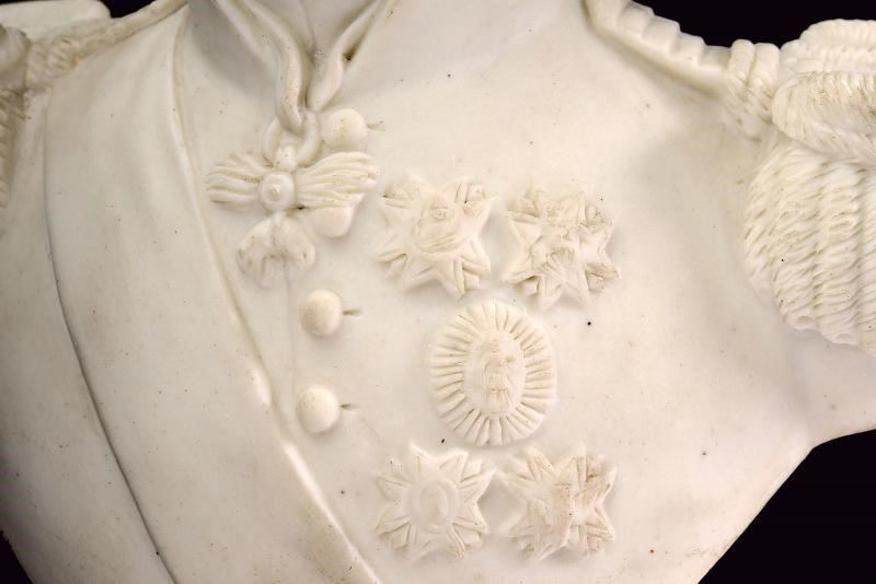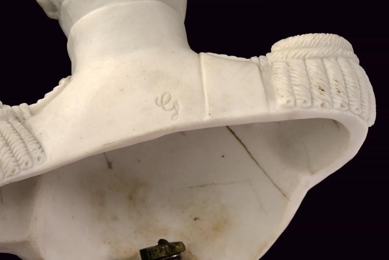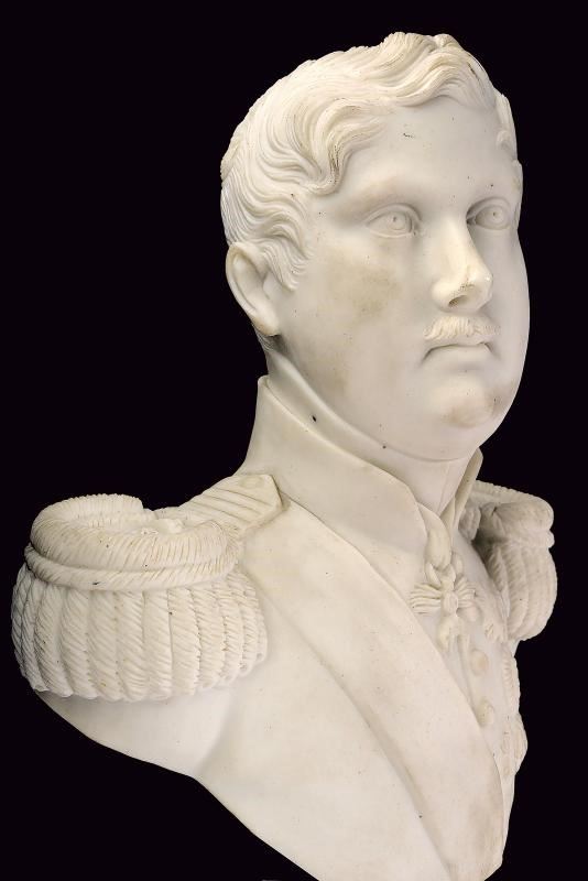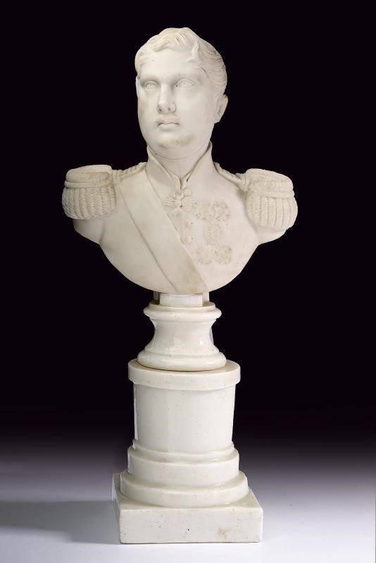 Statua a mezzo busto in biscuit raffigurante il Re in uniforme con spalline e sciarpa, decorato con sei ordini sul petto, tra i quali il Toson d'Oro e la placca di Gran Croce dell'Ordine di San Gennaro. Su base in ceramica bianca. Di bella qualità.