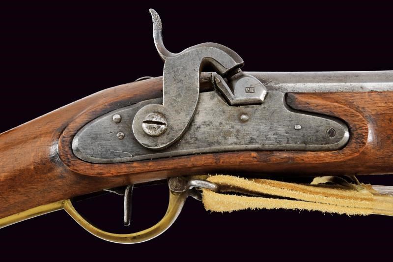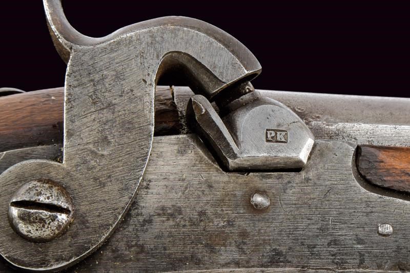 Canna tonda liscia con fianchi piatti alla base, marcata “FF”, “W” e con altri punzoni illeggibili, dotata di mirino sul bocchino, attacco per la baionetta; calibro 17 mm in volata. Batteria a molla in avanti con base del luminello marcata “PK”. Cassa intera in legno con fornimenti in ottone e bacchetta in ferro. Cinghia in cuoio. Misura Dolleczek.