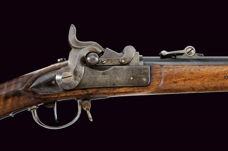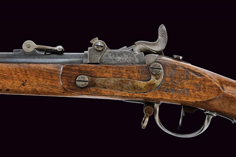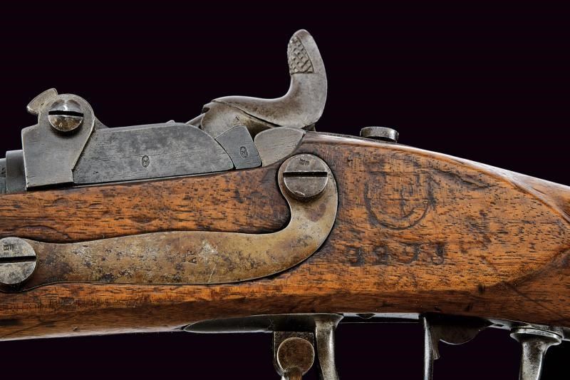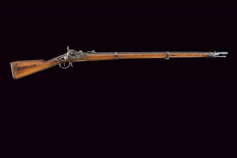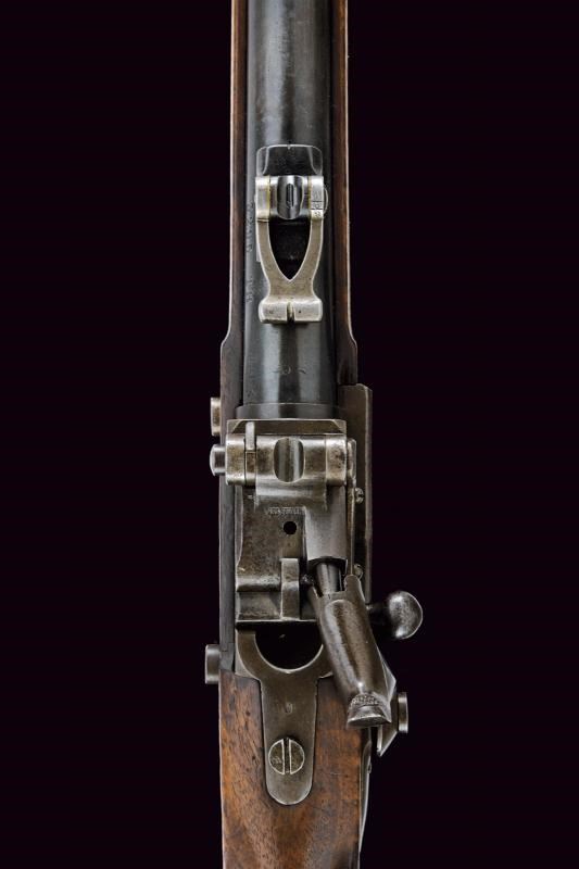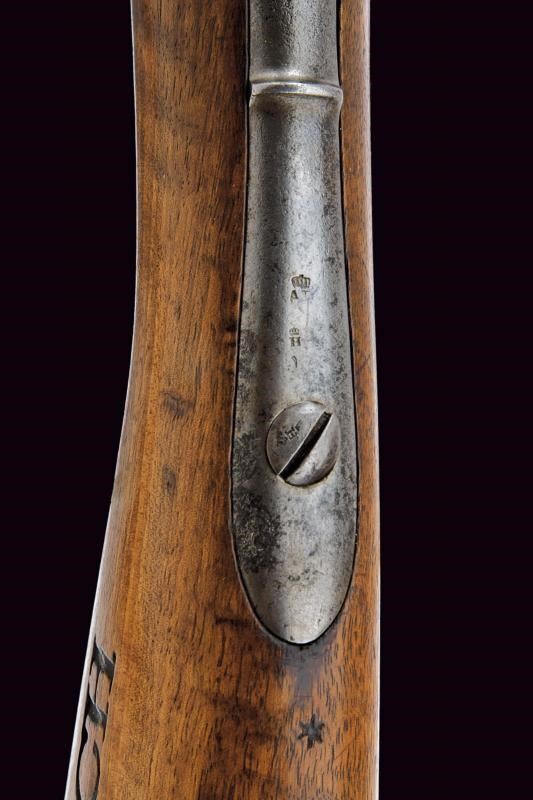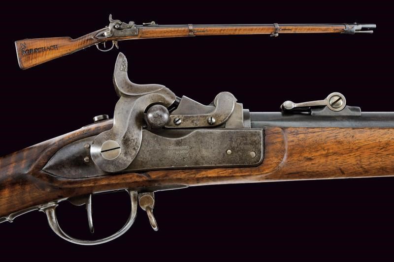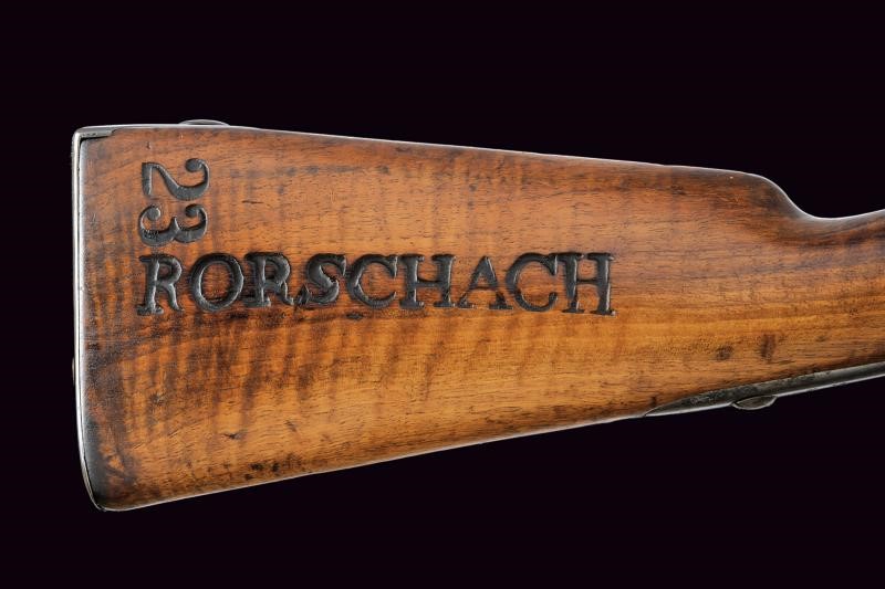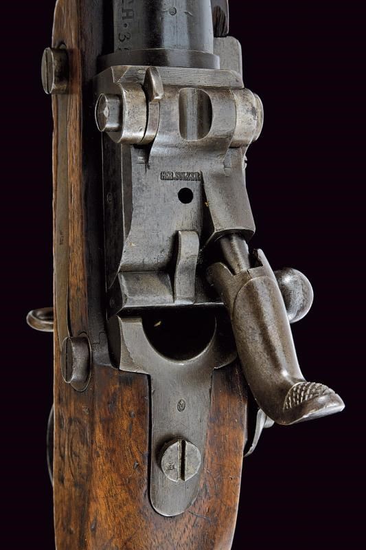 Canna tonda, rigata, recante punzoni "TH" e numerazioni, munita di alzo regolabile, mirino e dente d'innesto per baionetta, cal. 18,4 mm in volata. Anima pulita, rigatura visibile, qualche intaccatura all'interno. Batteria a cartella liscia con marcatura "A. FRANCOTTE LIEGE". Otturatore a tabacchiera con percussore anulare, marcato "GEB. SULZER" e punzonato con "V" sormontato da croce elvetica. Meccanica funzionante. Cassa intera in legno con profonde marcature sula pala "RORSCHACH" e "23", resti di timbri anche in altri punti. Fornimenti in ferro parzialmente punzonati. Interessante e non comune.