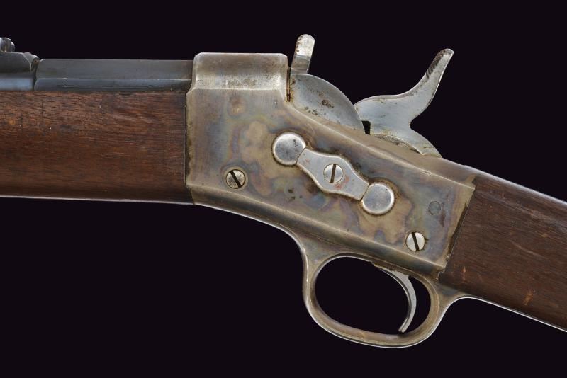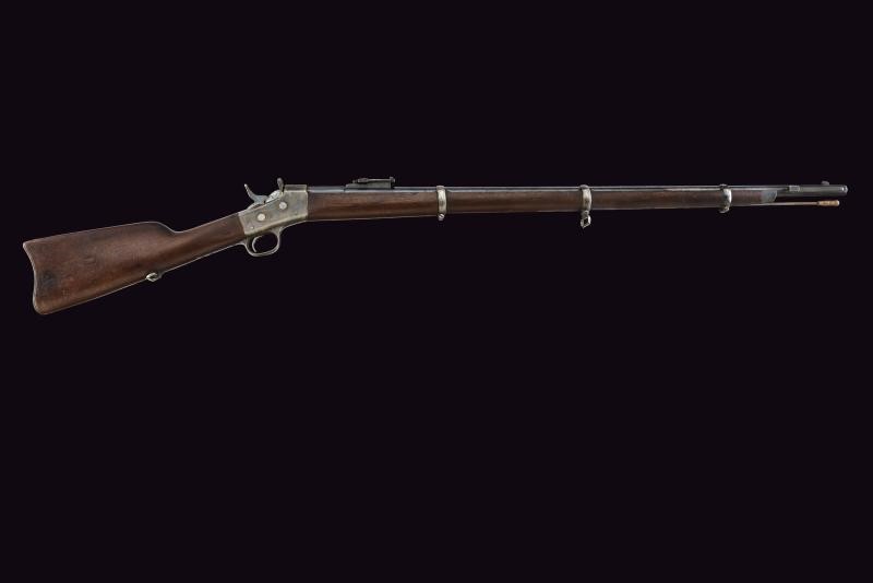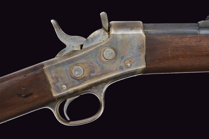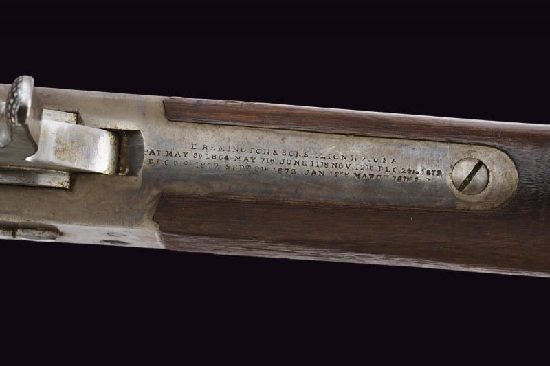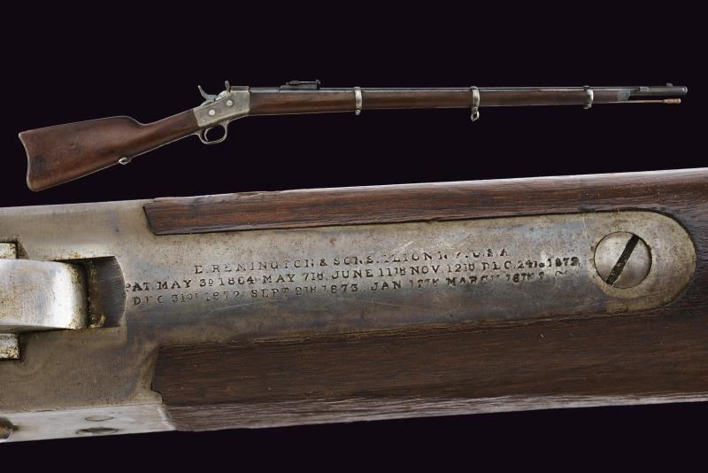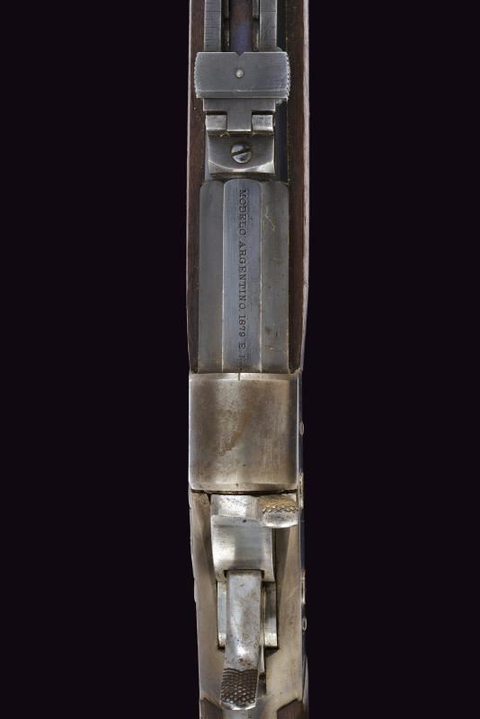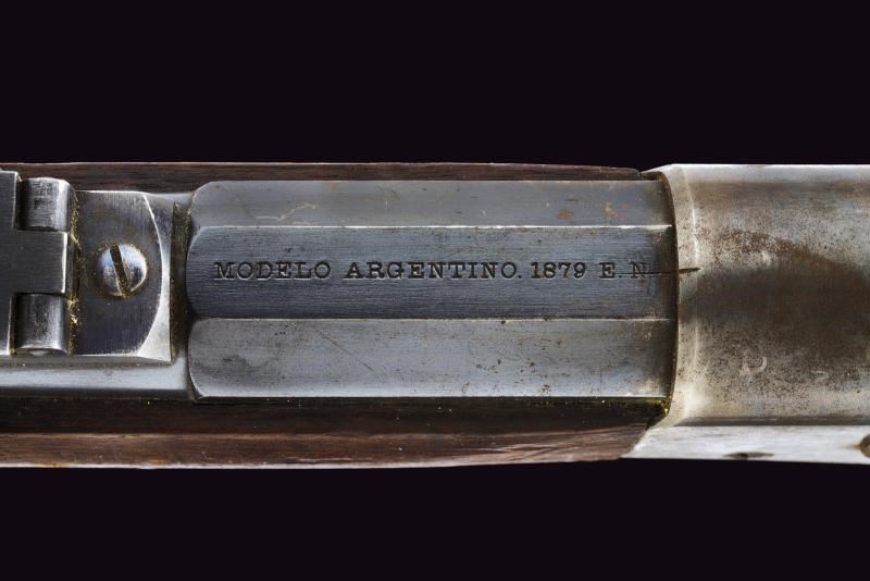 Canna tonda rigata, con base ottagonale, brunita, marcata "MODELLO ARGENTINO 1879 E. N.", dotata di alzo regolabile e abbattibile, mirino e attacco per la baionetta, cal. 11 mm. Codetta con diciture della ditta Remington. Tipico castello con otturatore a blocco rotante. Calcio in legno con fornimenti in ferro. Raro in condizioni così buone.