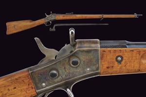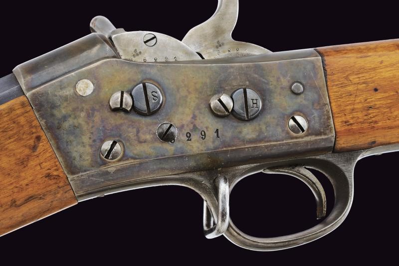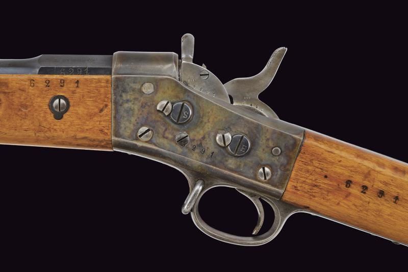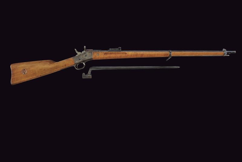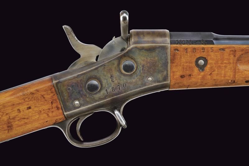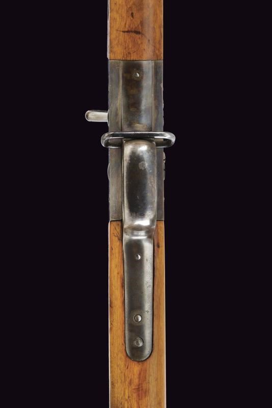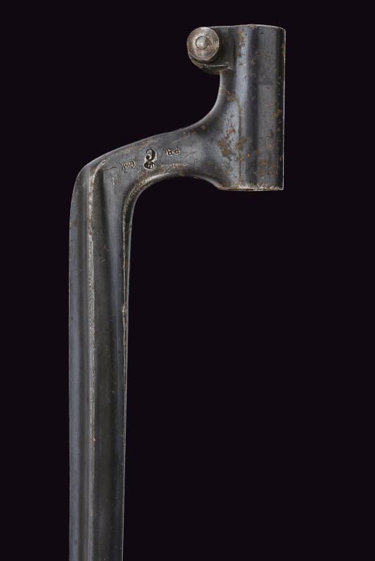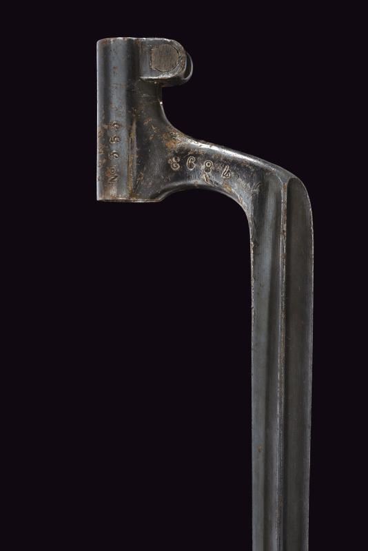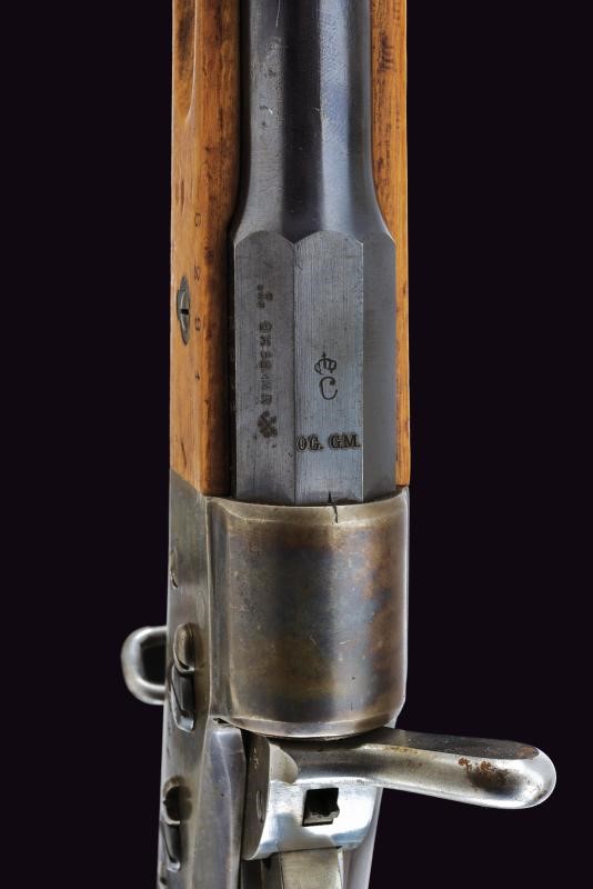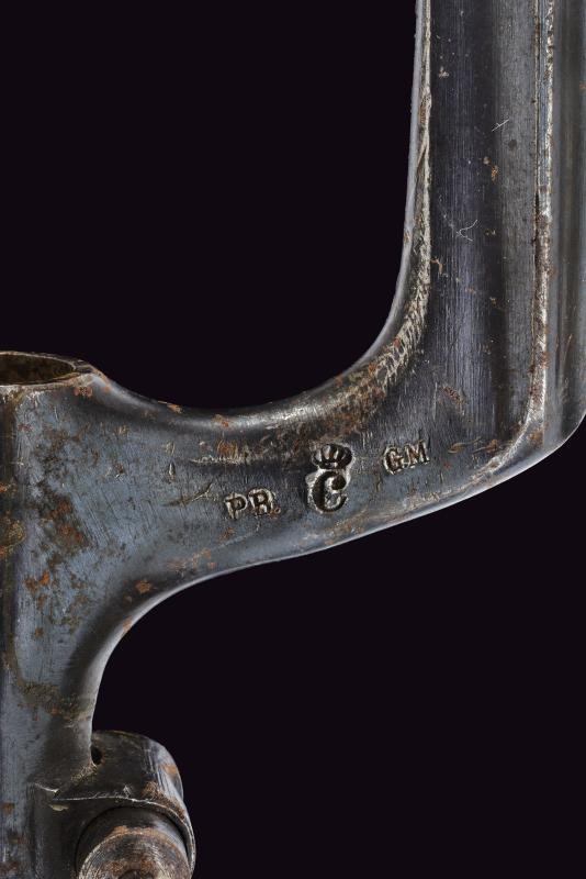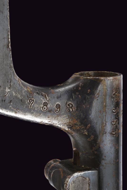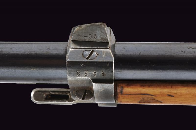 Canna rigata, brunita, tonda, con base ottagonale marcata "OG GM", "C" sotto corona, "13173/95", "8X58MM R" con marca e "6291", alzo variabile, mirino, cal. 8X58MM R; castello marcato"1870" e "C" sotto corona, la contropiastra "S" e "H" e con matricola "6291". Cassa in legno marcata con la stessa matricola "7973" e con anno di produzione, fornimenti e bacchetta in ferro. Baionetta a ghiera brunita con marcature "6 R. B.", "No. 353" e "7893". Raro in condizioni così buone.