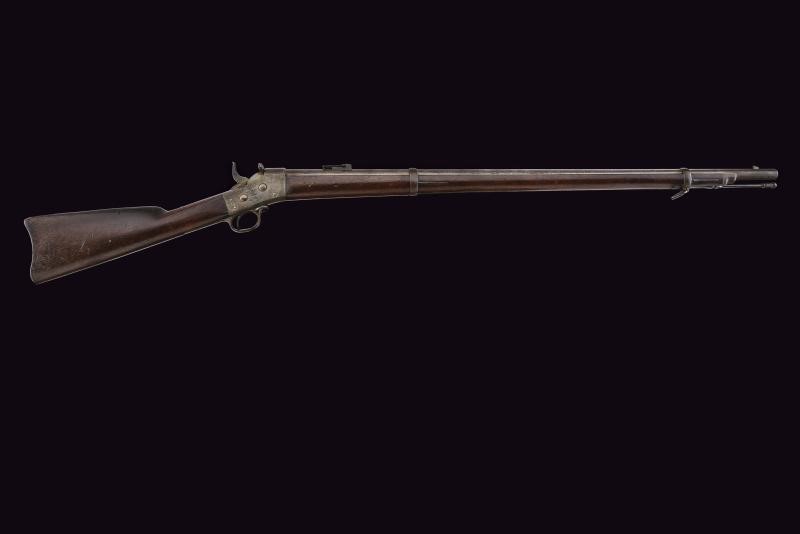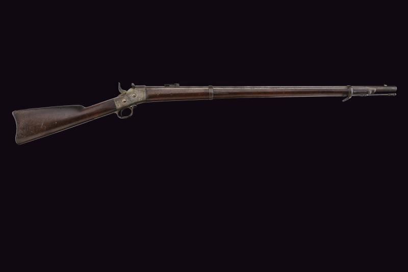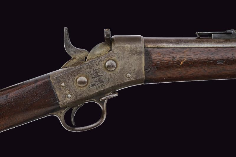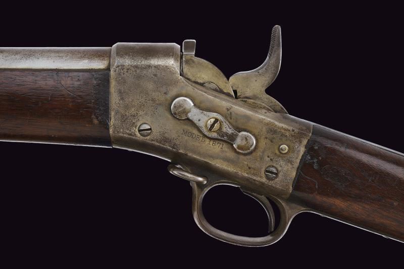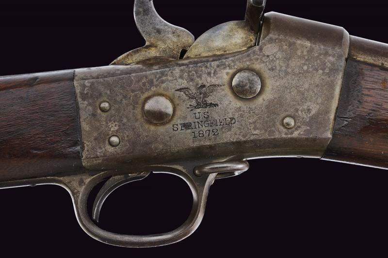 Canna rigata (anima pulita e rigatura ben visibile), di sezione tonda, munita di mirino e alzo abbattibile; cal. 11 mm. Otturatore tipico a blocco rotante con meccanica funzionante, castello marcato "MODEL 1871" e "U.S SPRINGFIELD 1872" con aquila. Codolo superiore con brevetti. Calcio ed astina in legno; il primo con timbro di ispezione militare e marcatura "25". Fornimenti in ferro, la coda superiore del calciolo marcata "US".