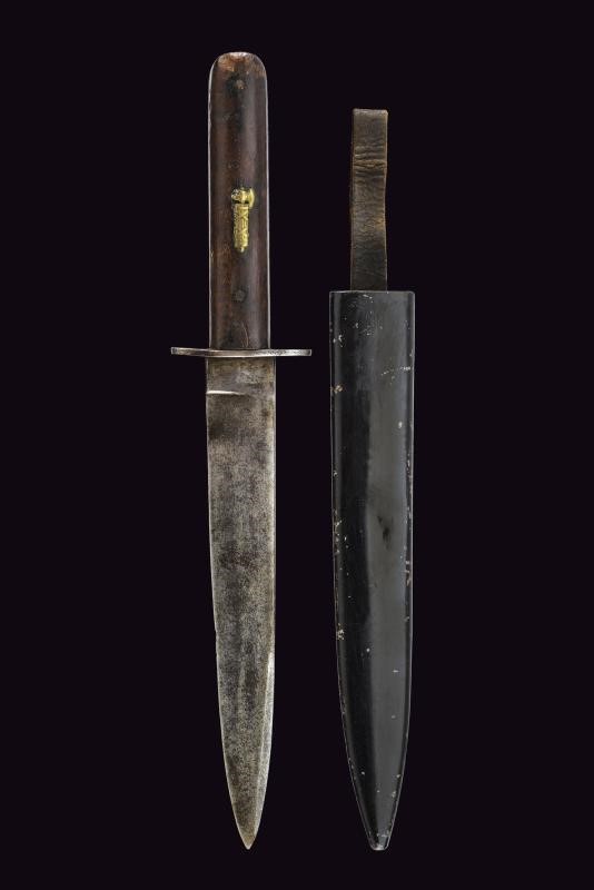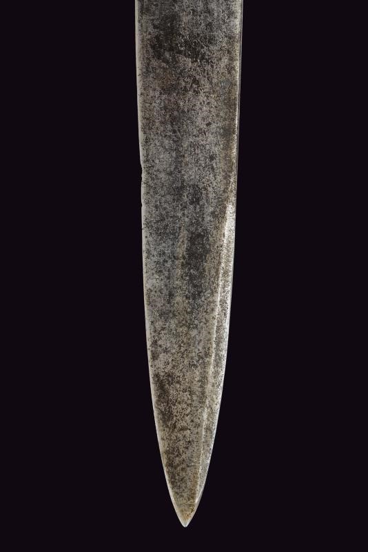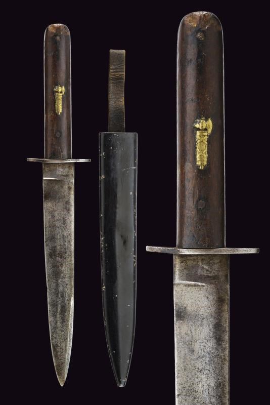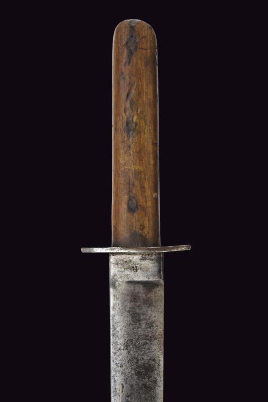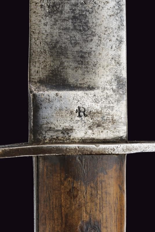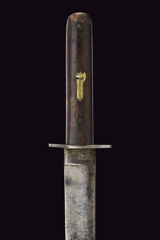 Lama dritta, con tallone marcato “R”. Impugnatura in legno con guancette arrotondate, quella anteriore con un fascio in ottone inserito. Elso in ferro. Fodero in ferro laccato di nero con passante in cuoio. Interessante preda bellica di un soldato italiano, poi reimpiegata come complemento dell'uniforme in epoca fascista.