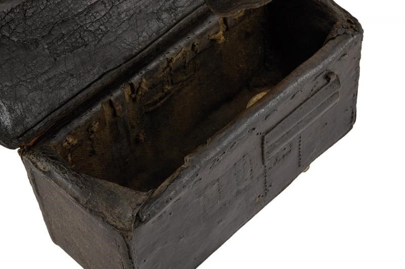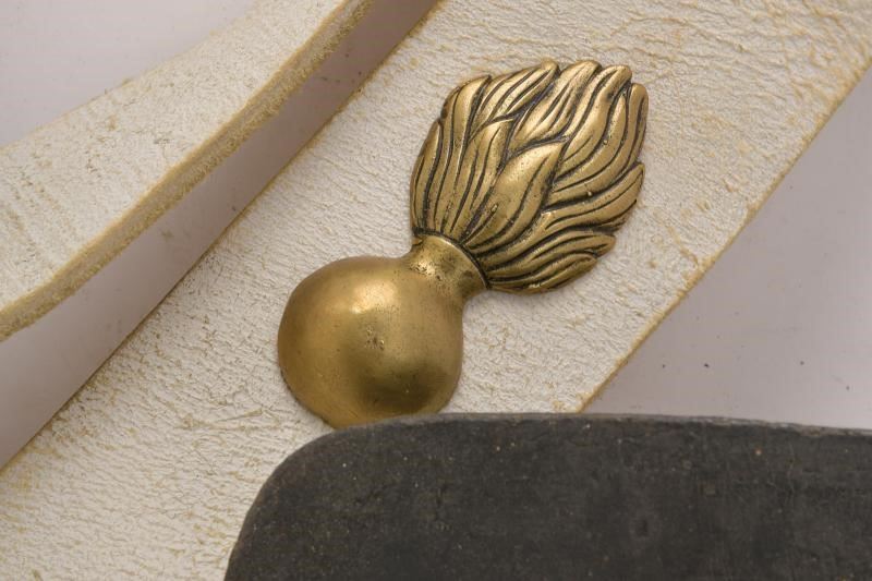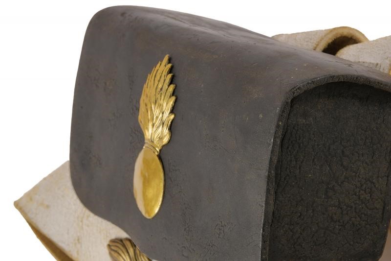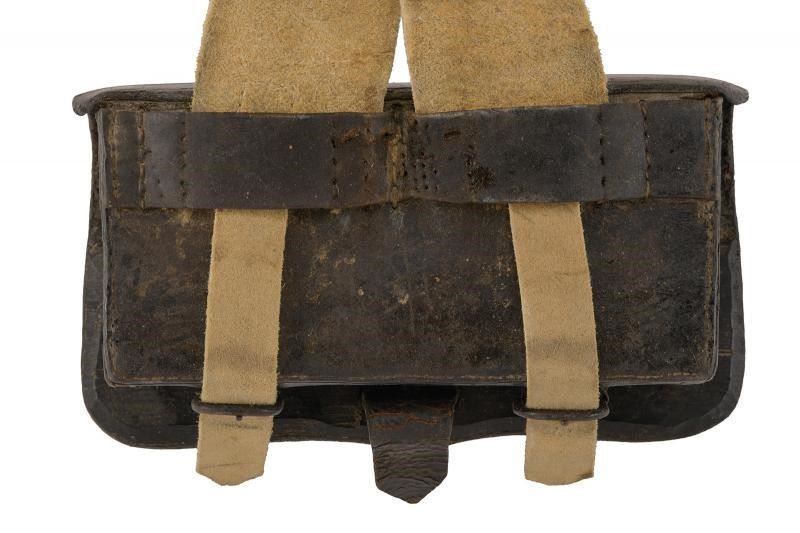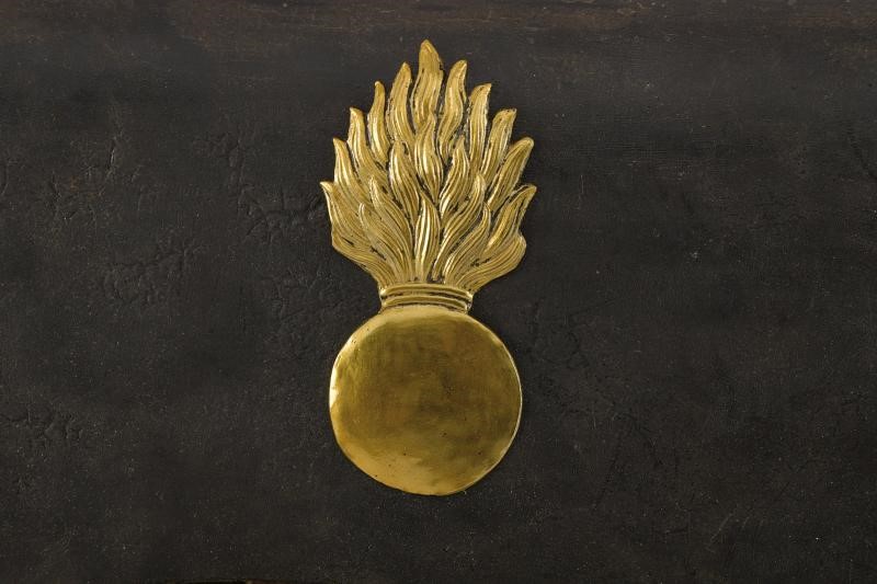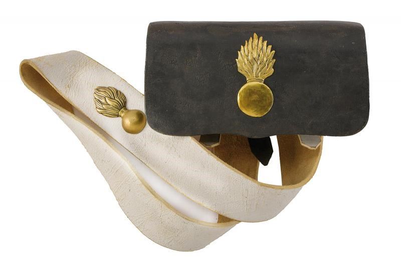 Corpo in legno rivestito di cuoio, con coperchio ornato da granata fiammeggiante in ottone. Bandoliera in cuoio bianco. Probabilmente di produzione austriaca.