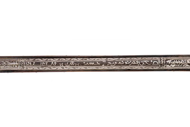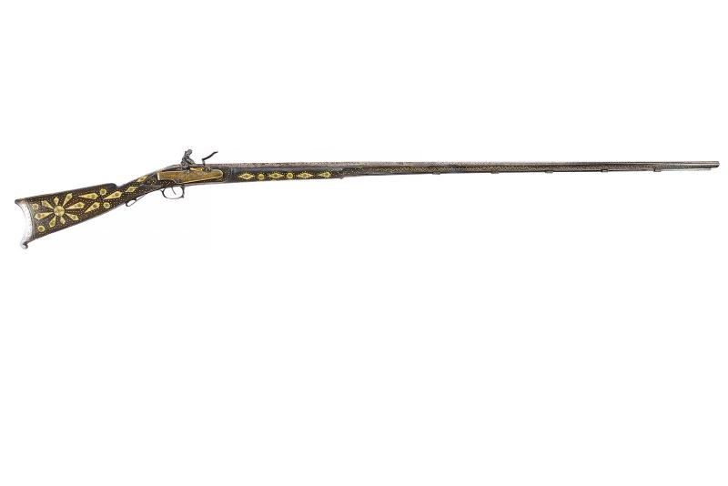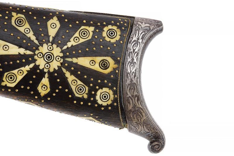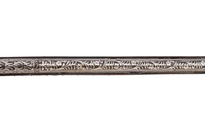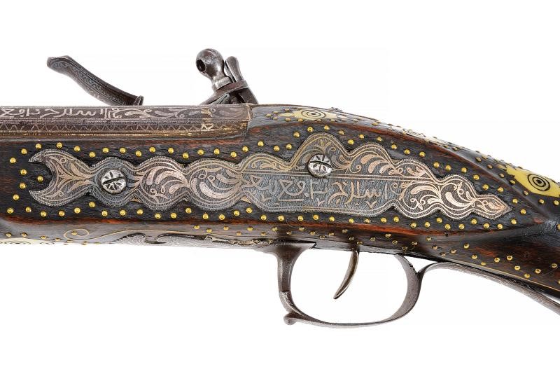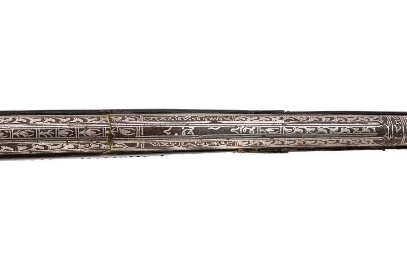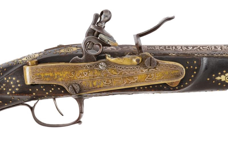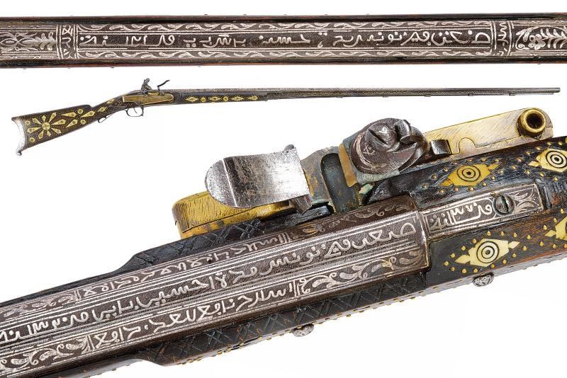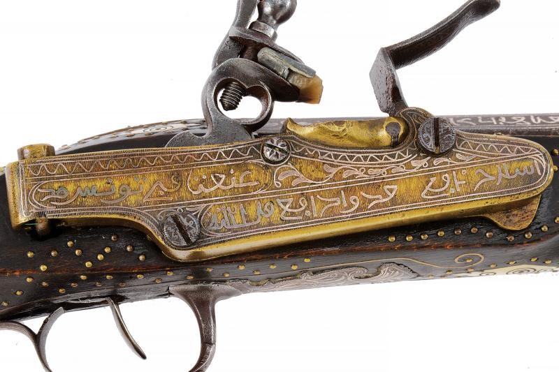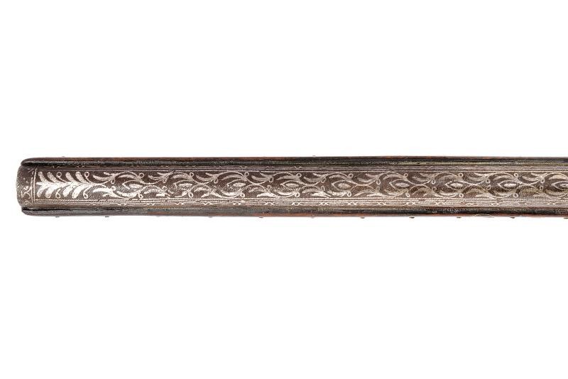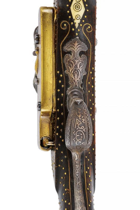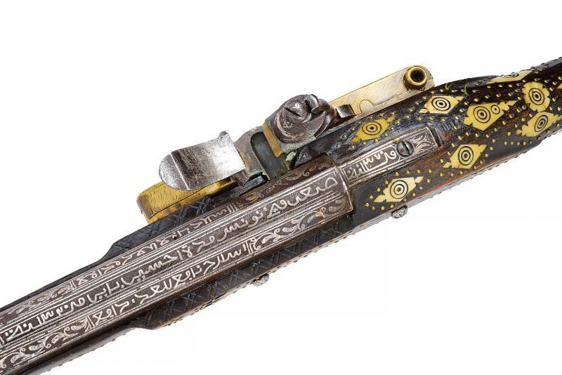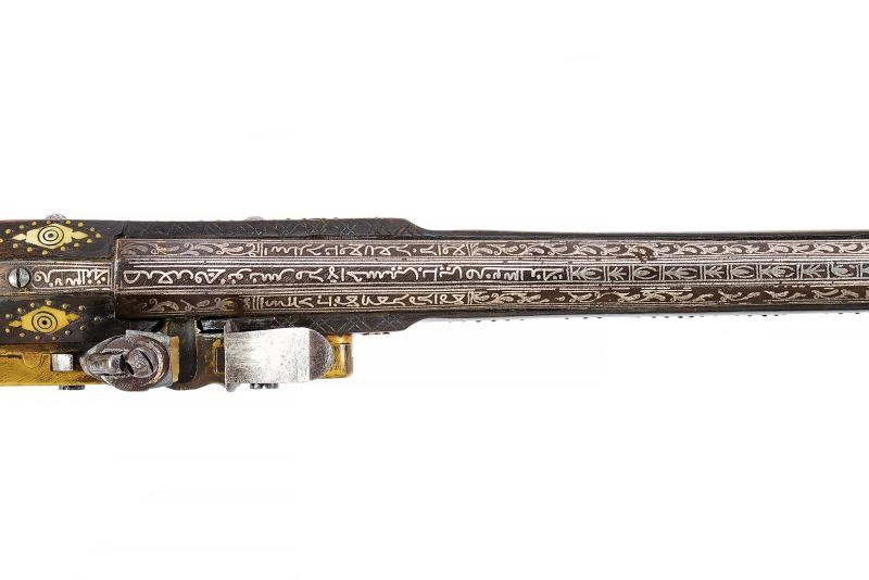 Canna di estrema lunghezza con anima liscia, ritubata in tempi più recenti con anima in ottone (presenta inoltre una rottura saldata in epoca d'uso alla fine del primo quarto). Profilo a due ordini, il primo tondo, l'altro ottagonale; la superficie interamente ageminata in argento a segmenti recanti cornicette floreali e geometriche alternate a cartigli con iscrizioni in lingua araba. In volata cal. 15 mm, con la nuova anima ridotta a 9 mm. Codetta con iscrizione in caratteri arabi rimessa in argento. Interessante batteria a pietra focaia in ottone massiccio, del tipo militare per l'innesco dei cannoni, ancora dotata del sistema di scatto a corda, montata esternamente alla cassa; la cartella ornata con iscrizioni in argento entro cronici ondulate e a doppie linee; meccanica funzionante. Cassa intera realizzata in due pezzi in legno bruno (con restauri nella parte centrale), decorata con chiodini in ottone e con tarsie in osso lavorate a motivi geometrici nel tratto centrale. Contropiastra, calciolo e ponticello in ferro, recanti iscrizioni e disegni floreali ageminati in argento. Lunga bacchetta in ferro, con parte terminale e reggibacchetta geminati in argento.