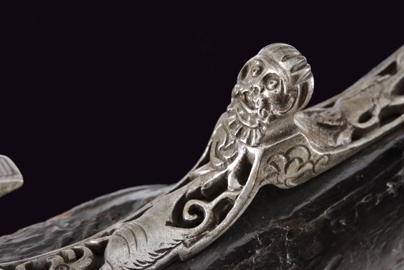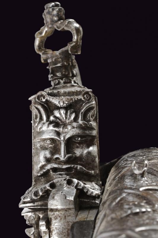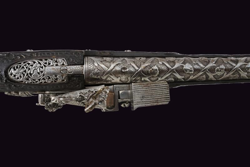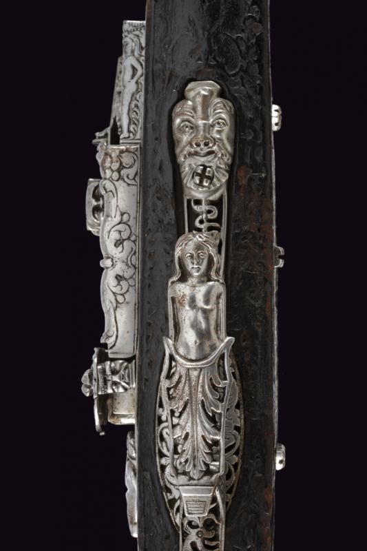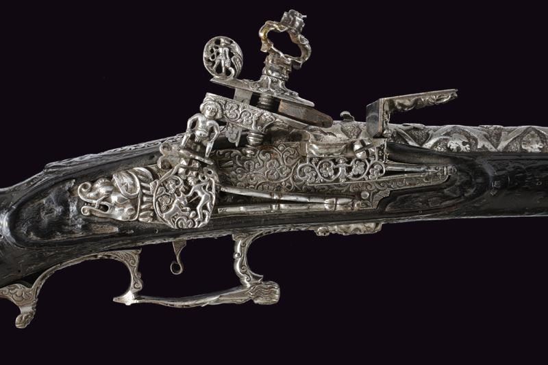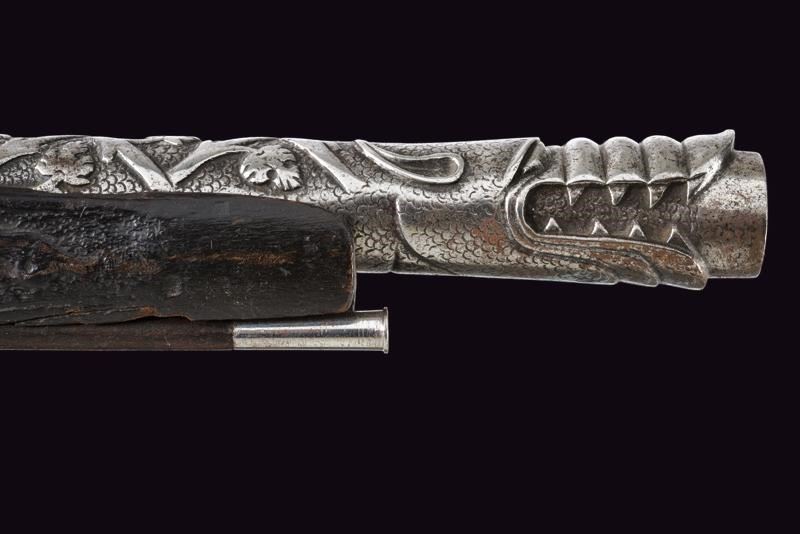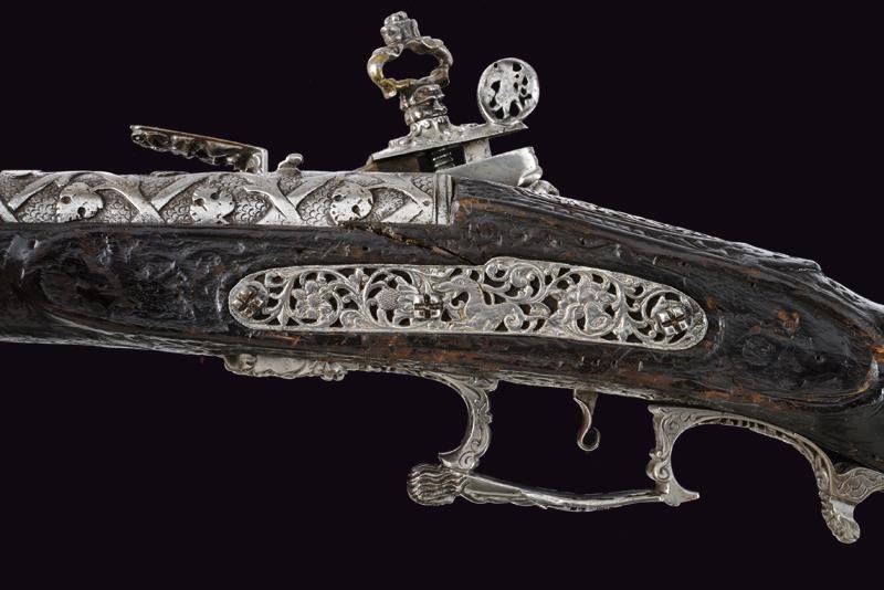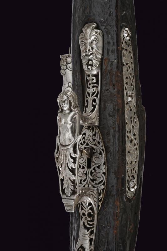 Bellissima canna di un fucile a miccia della prima metà del XVI Secolo, tonda e liscia, completamente intagliata a rami intrecciati con foglie, su fondo a onde, la bocca a testa di drago, cal. 18 mm; codetta rettangolare incisa a onde. Bellissima batteria napoletana del XVII Secolo riccamente intagliata, traforata ed incisa a mostri, figure, animali e motivi floreali. La cassa intera, risalente al terzo quarto del XVI Secolo, mostra ancora resti di profondi intagli ora molto consumati ed appiattiti. Fornimenti in ferro riccamente traforati ed incisi a draghi e motivi floreali, contemporanei alla batteria, solo il ponticello e la piastra della coccia di epoca successiva. Bacchetta di ricambio.