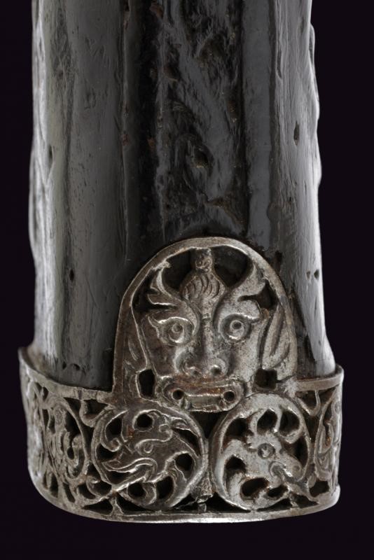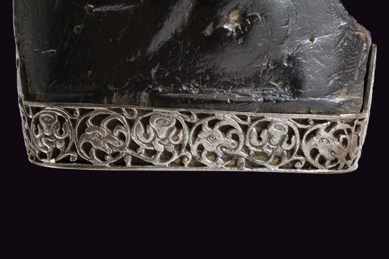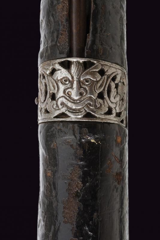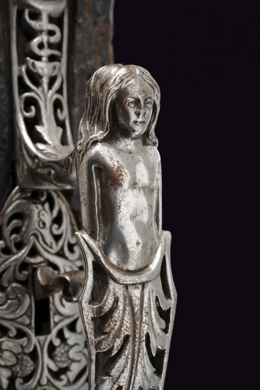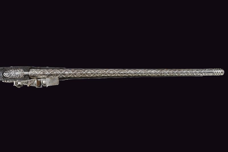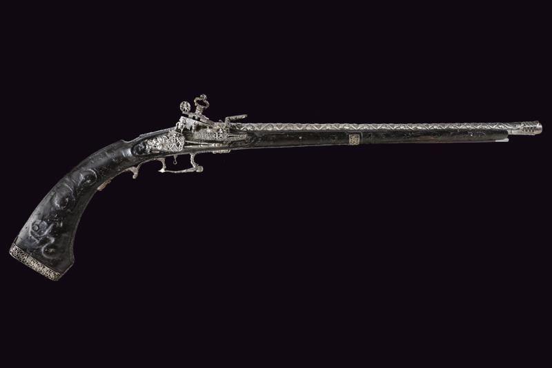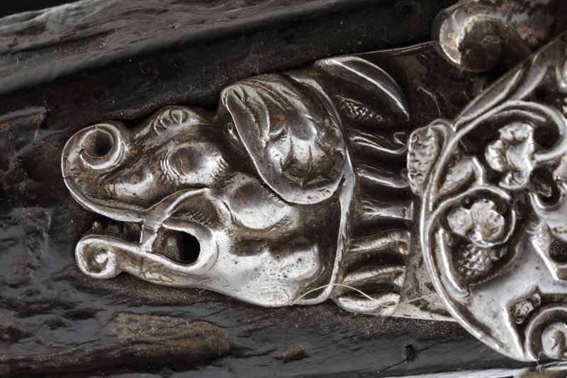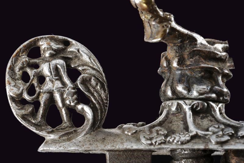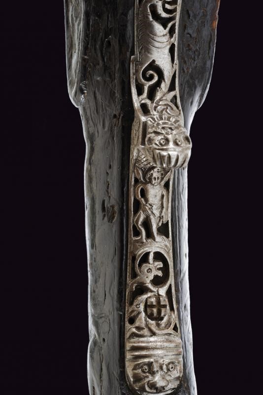 Bellissima canna di un fucile a miccia della prima metà del XVI Secolo, tonda e liscia, completamente intagliata a rami intrecciati con foglie, su fondo a onde, la bocca a testa di drago, cal. 18 mm; codetta rettangolare incisa a onde. Bellissima batteria napoletana del XVII Secolo riccamente intagliata, traforata ed incisa a mostri, figure, animali e motivi floreali. La cassa intera, risalente al terzo quarto del XVI Secolo, mostra ancora resti di profondi intagli ora molto consumati ed appiattiti. Fornimenti in ferro riccamente traforati ed incisi a draghi e motivi floreali, contemporanei alla batteria, solo il ponticello e la piastra della coccia di epoca successiva. Bacchetta di ricambio.