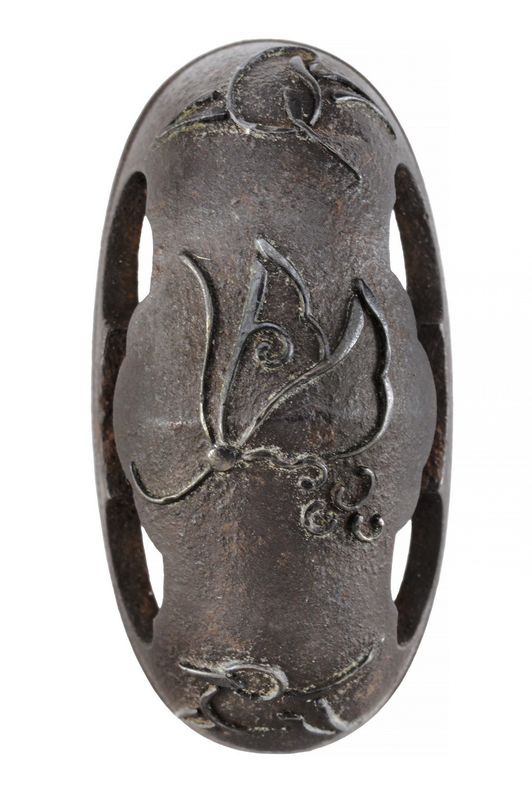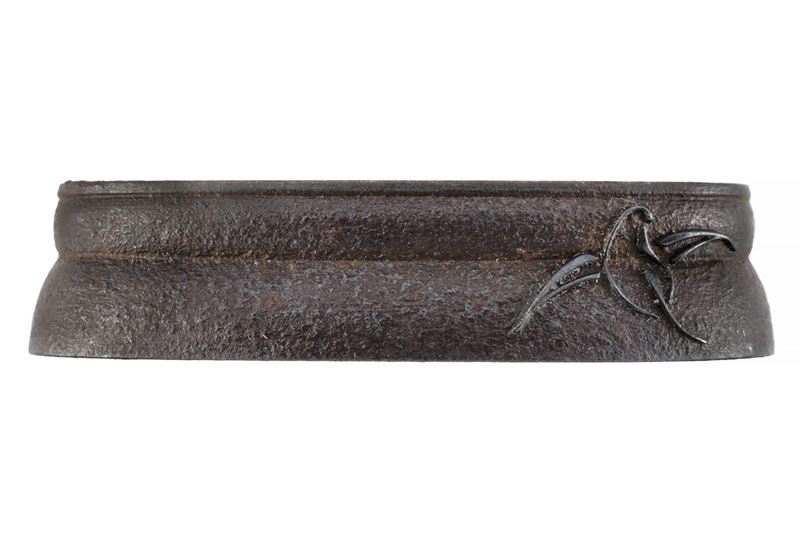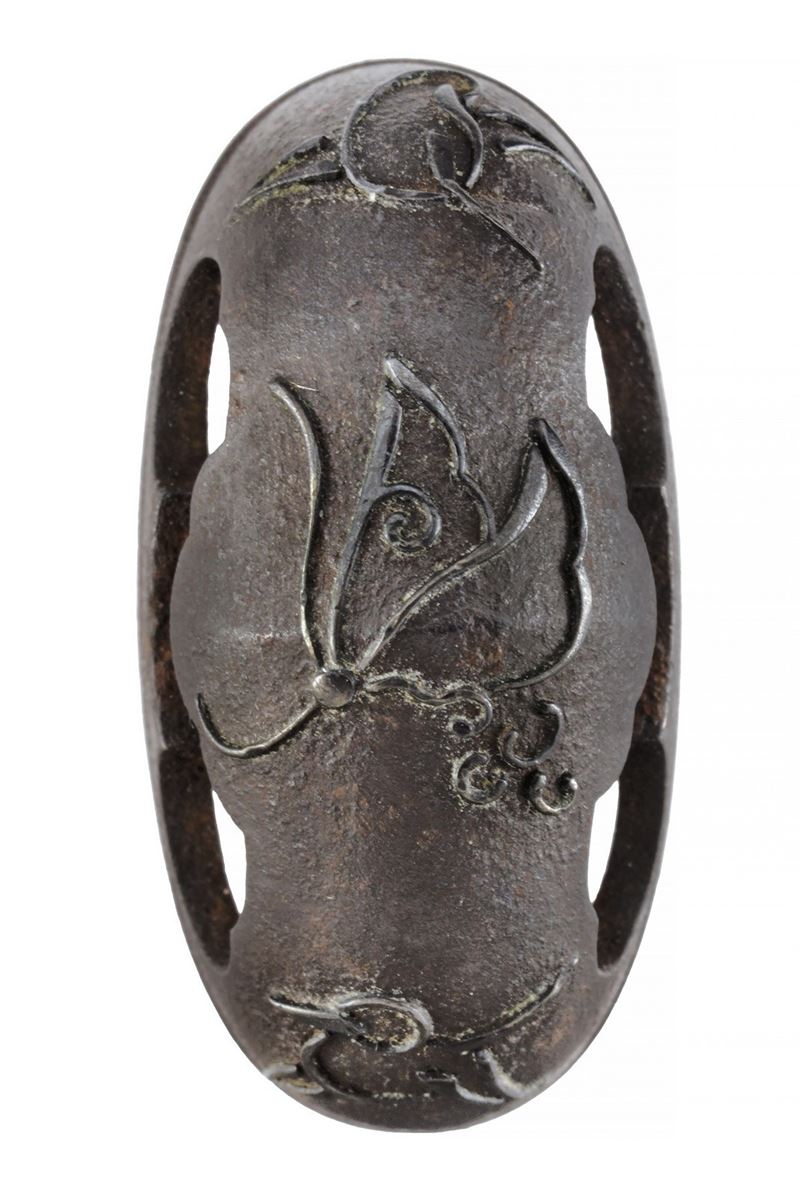 In ferro, con finissima decorazione in shakudo con farfalle ed insetti in rilievo. Prima metà del XIX secolo.