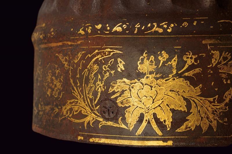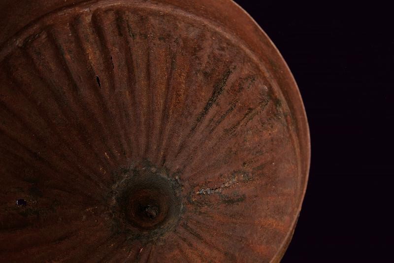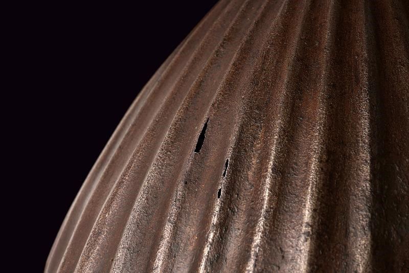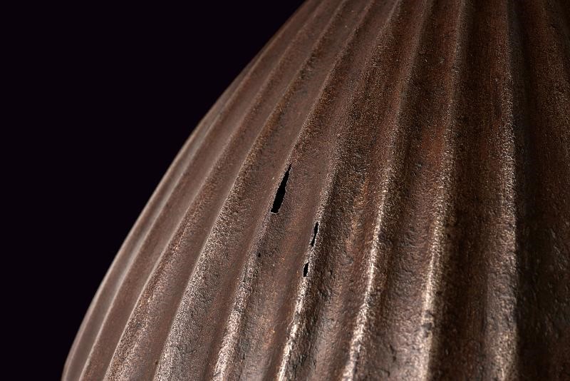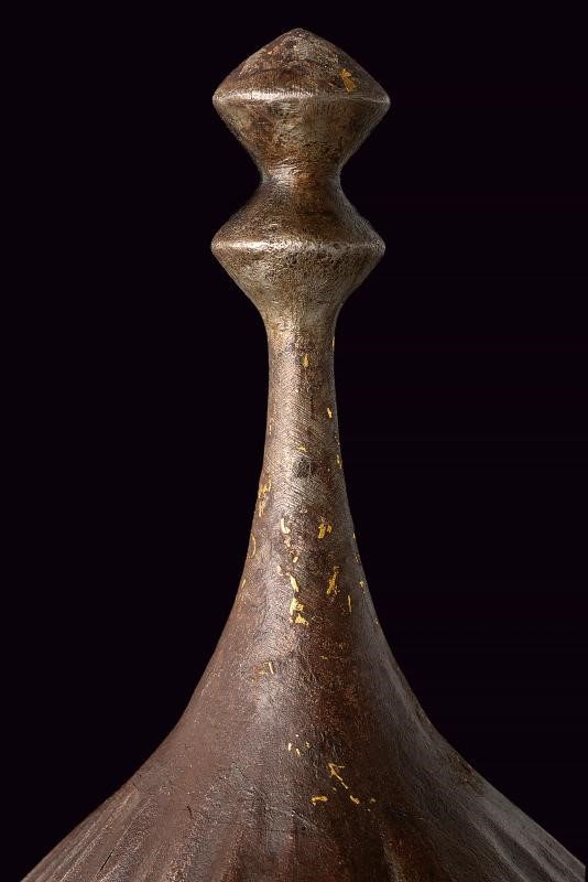 In ferro, lavorato in un solo pezzo e decorato a nervature raggiate convergenti verso la sommità (tre piccoli fori causati da ossidazione), sormontato da una piccola cuspide a due nodi. La parte inferiore è liscia ed è separata dalla zona a raggi mediante una banda convessa; anteriormente presenta due archi oculari con un corto nasale al centro. La sezione inferiore e la cuspide conservano resti di decorazione floreale ageminata in oro.
