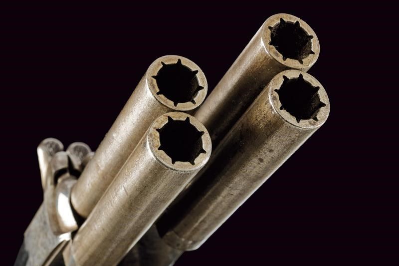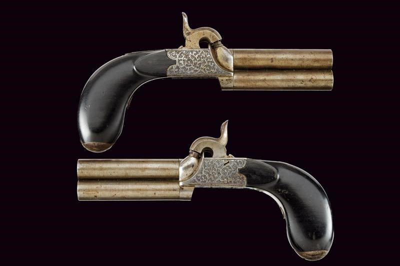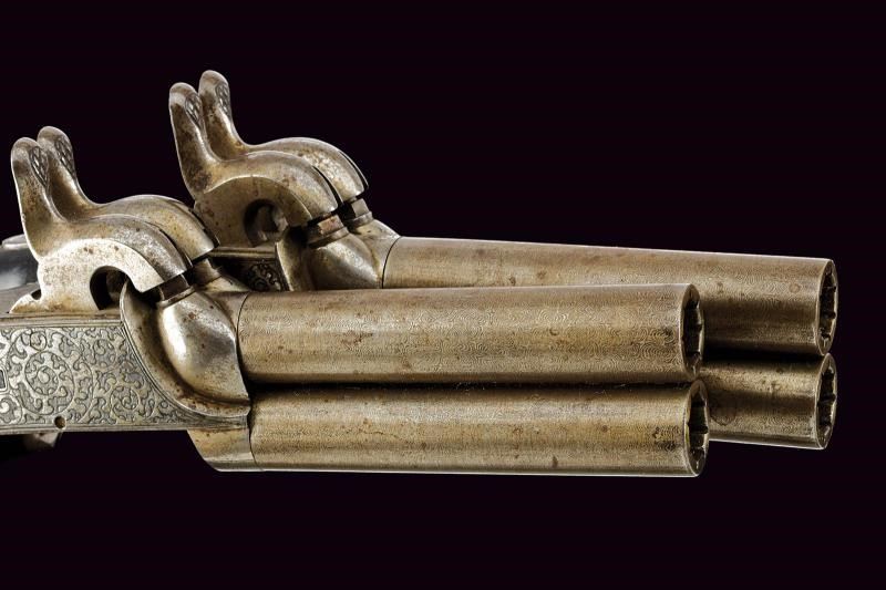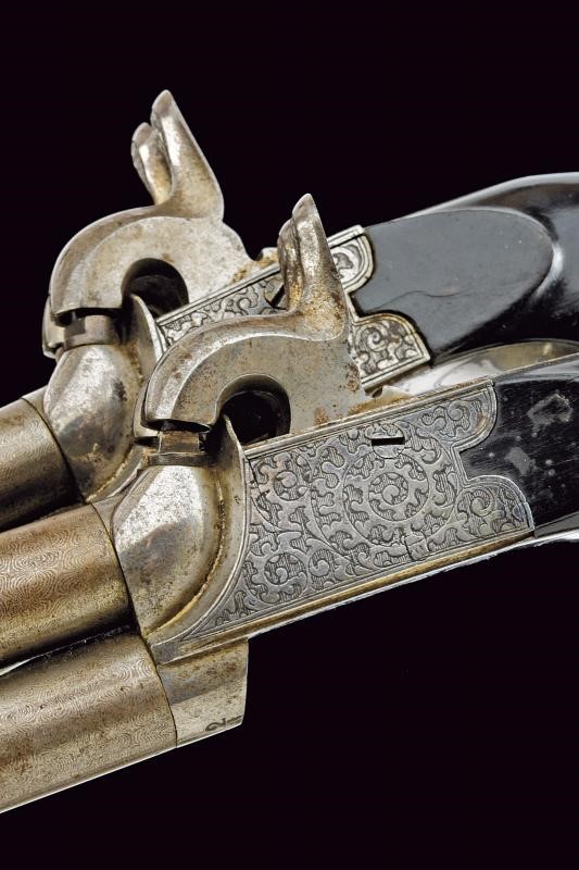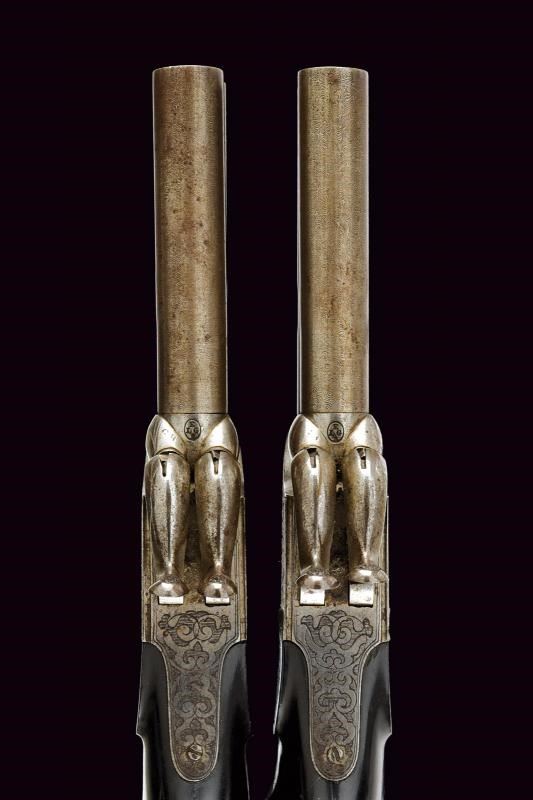 Canne lisce, tonde e svitabili, in damasco; calibro 10 mm. Castelli del tipo boxlock finemente incisi a motivi floreali, dotati di due cani dorsali e, tra di essi, del punzone di Liegi. Meccaniche funzionanti, con monogrillo a scomparsa. Calcii in ebano dotati di porta capsule.