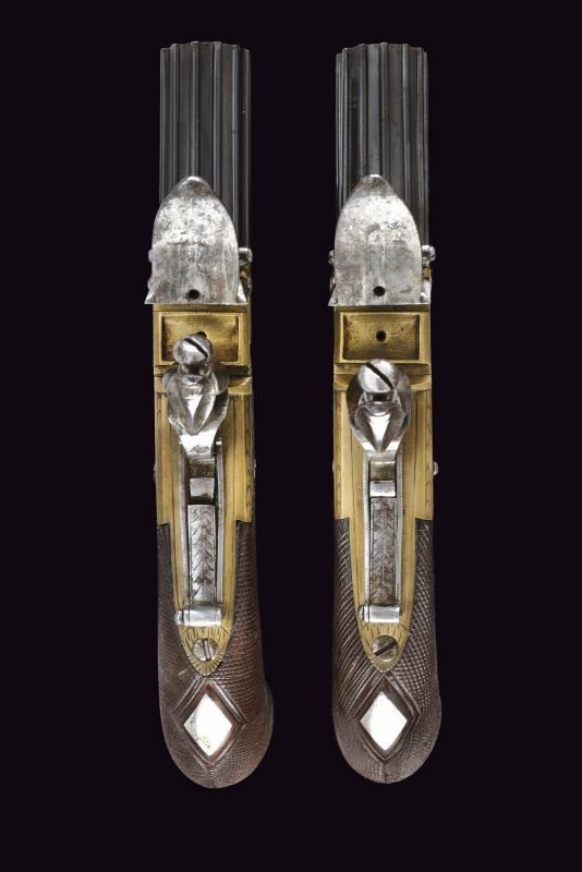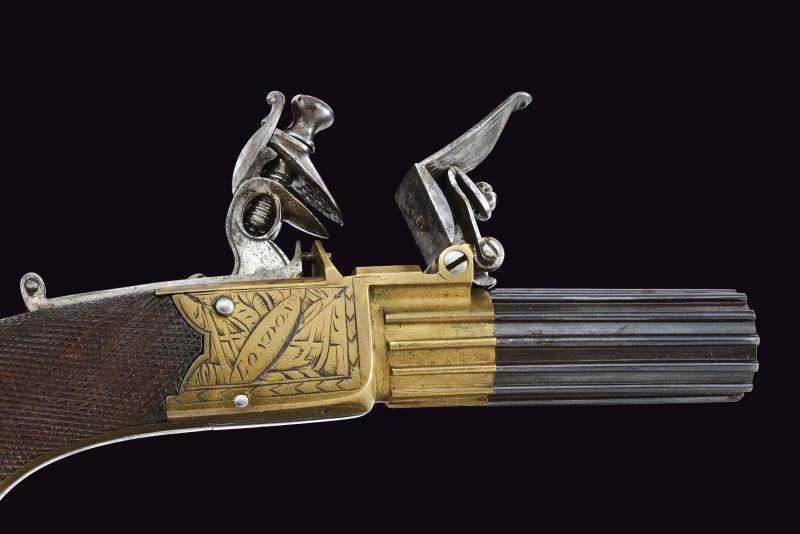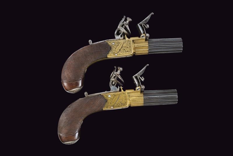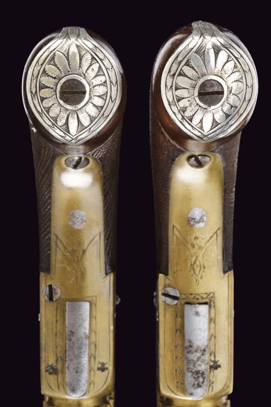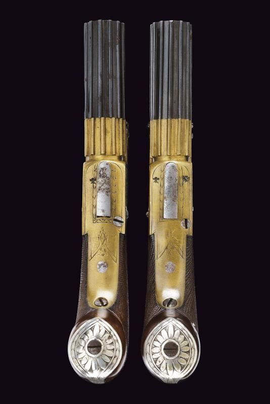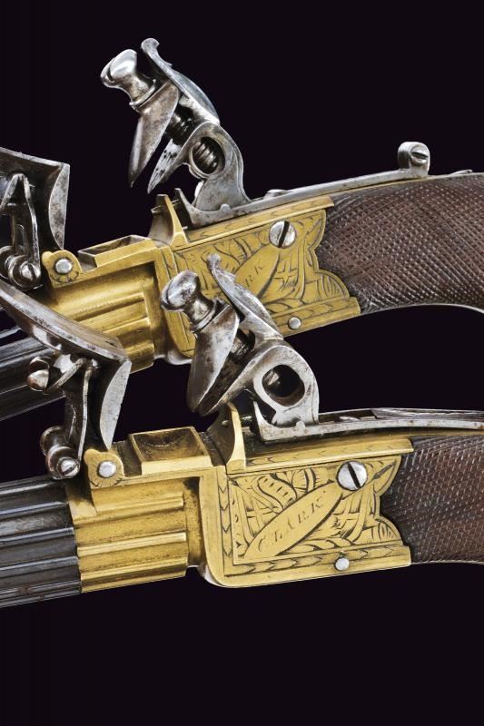 Belle canne completamente lavorate a scanalature, brunite e svitabili. Castelli in ottone con blocco di culatta lavorato en suite con la canna, firmati "CLARK / LONDON" fra incisioni a trofei. I cani al dorso, centrali e muniti di sicura. Grilletti a scomparsa. Meccaniche funzionanti. Calci in legno micro-zigrinati, le cocce d'argento, decorato a fiore.