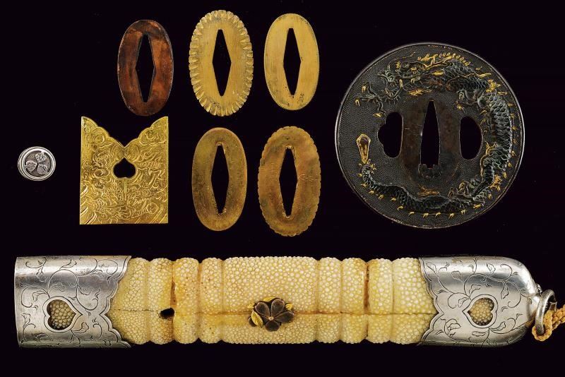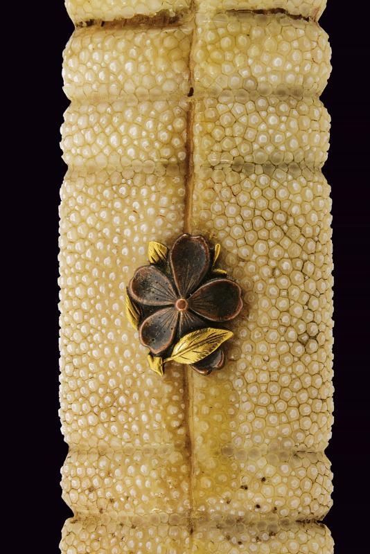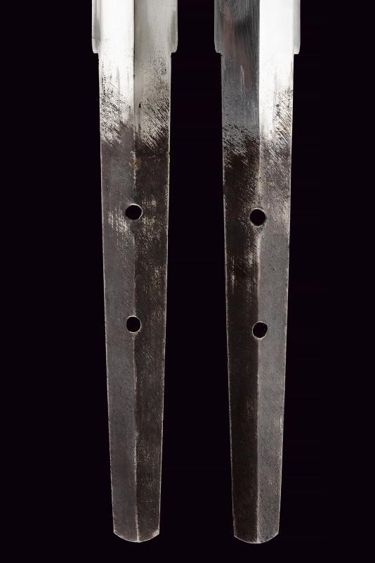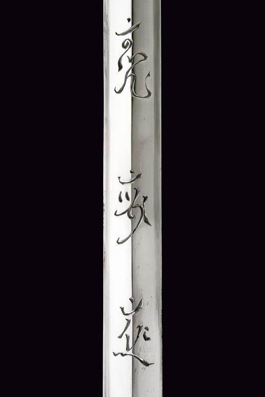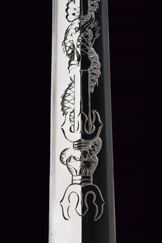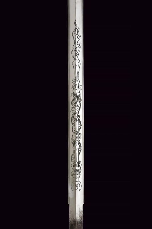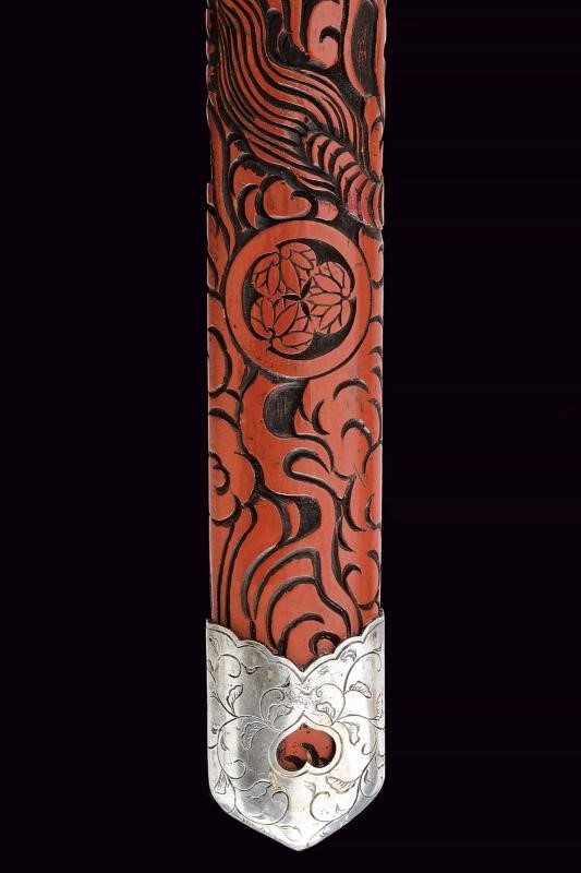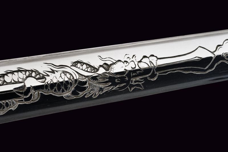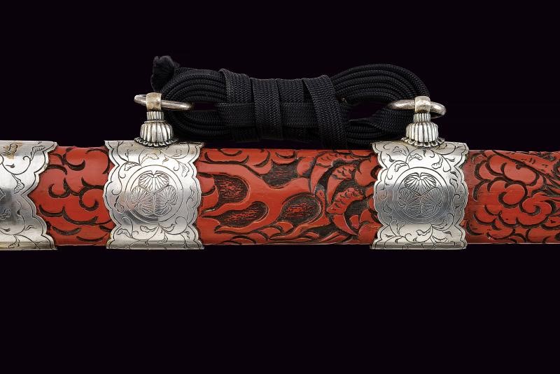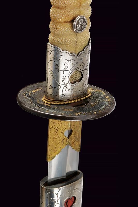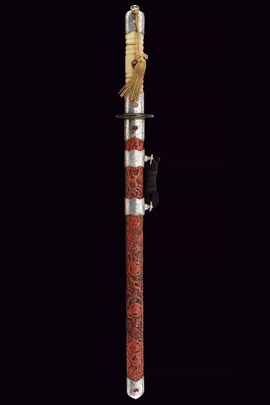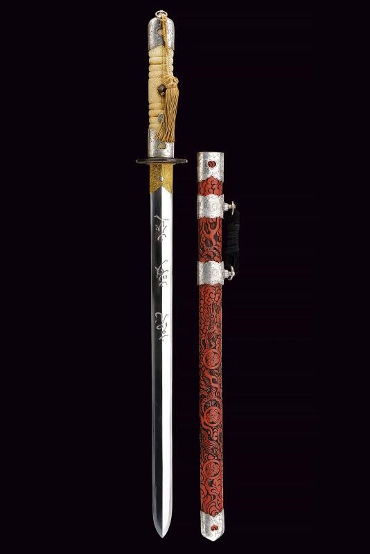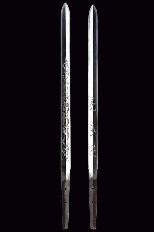 Lama ken moroha (a doppio filo, nagasa 61 cm). Hada: muji. Hamon: hoso suguha. Horimono: drago con ken e bongi. Habaki in ottone inciso con un drago. Nakag ubu Kurijiri con due Mekugi-ana. Koshira handachi con elementi in argento inciso e con Mon dei Tokugawa. Interessante Tsuba maru-gata, in shakudo con drago dorato, bei menuki dorati. Saya in lacca rossa incisa con drago tra le nuvole e Mon dei Tokugawa.