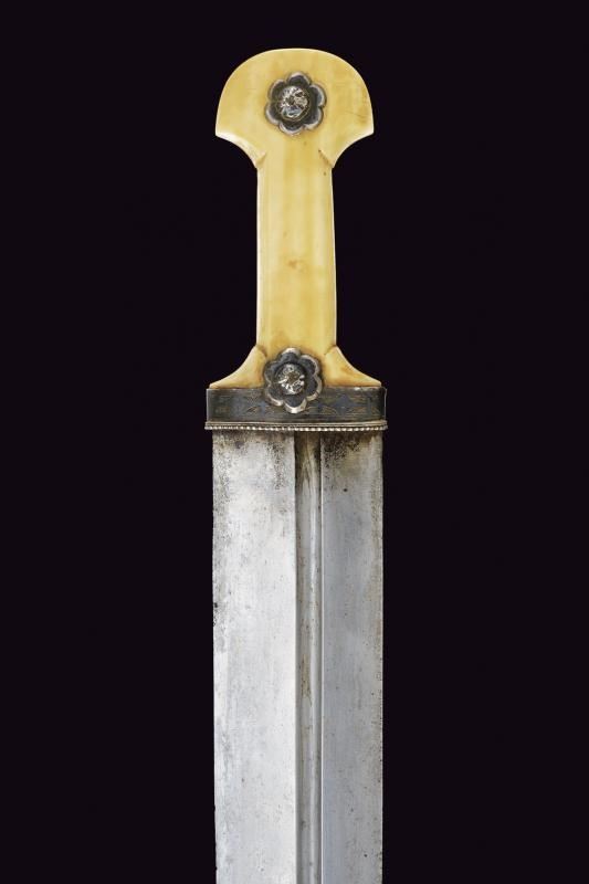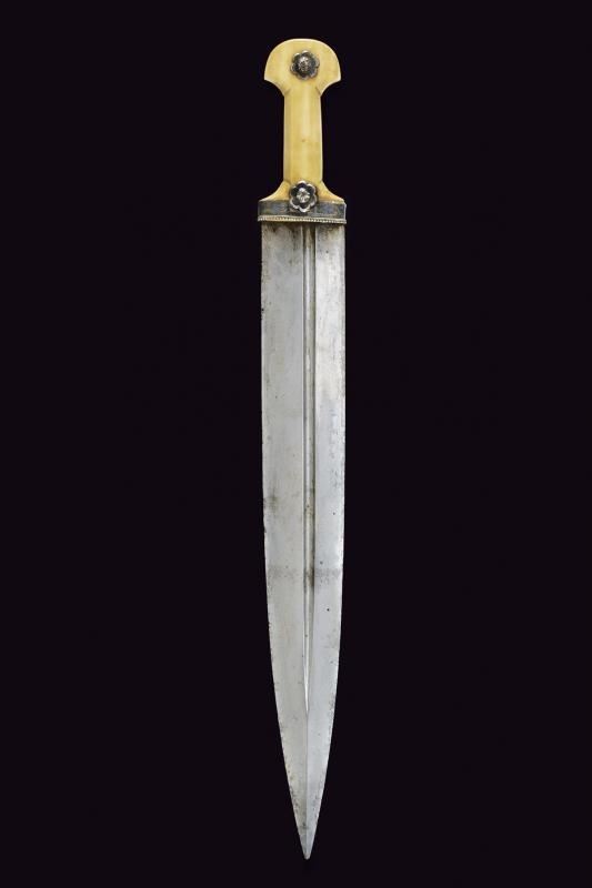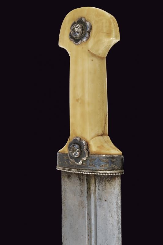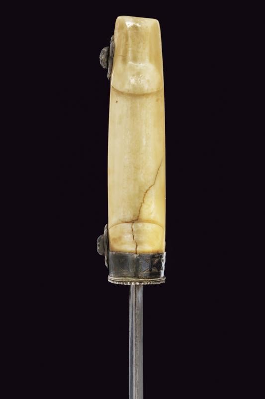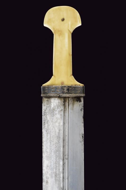 Imponente lama dritta a due fili (in damasco meccanico?) con profonde scanalature asimmetriche sulle due facce. Bel fornimento in dente di tricheco, scolpito nella tipica foggia, con fornimenti e rivetti in argento, incisi e niellati.