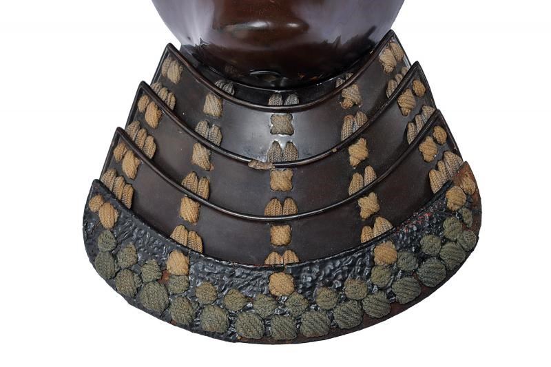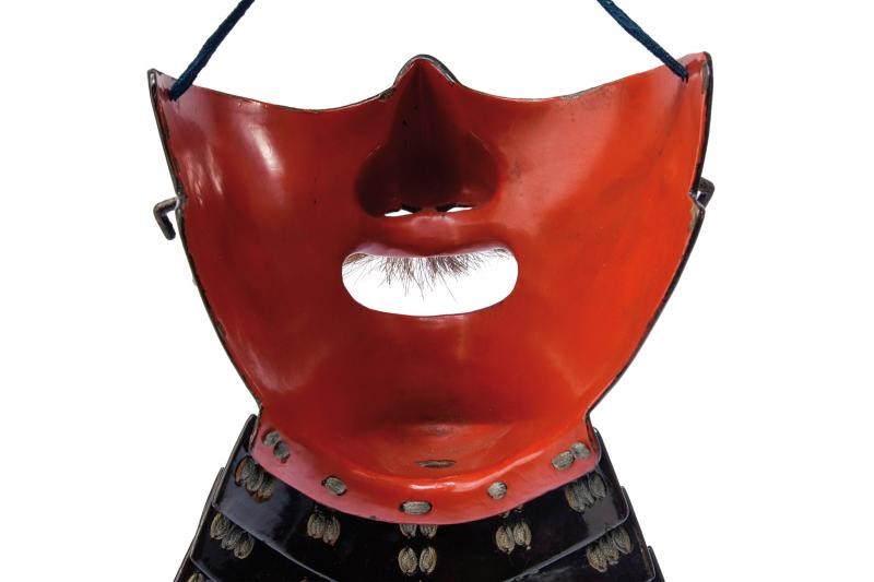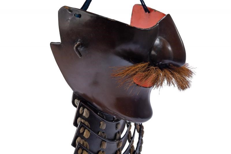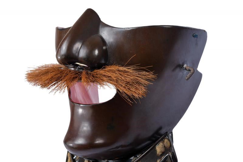 Realizzato in Nerikawa (cuoio indurito), del tipo Me-no-shita-men. La superficie esterna in lacca marrone (minime mancanze). La faccia con espressione nobiliare (Kuge). Il naso in un unico pezzo con il resto della maschera. la bocca del tipo privo di denti, completa di ampi mustacchi. Sulle guance Orikugi in ferro. Asenagashi-no-ana sotto al mento. Lacca interna rossa con lievi mancanze. Yodarekake a quattro piastre Itamono-kozane (non tagliate) laccate in marrone-bruno e con bordo rilevato verso l'alto. Allacciatura Sugake color ocra. L'ultima piastra con finitura Tatakinuri (ruvida) e munita di Hishinui e Uname.